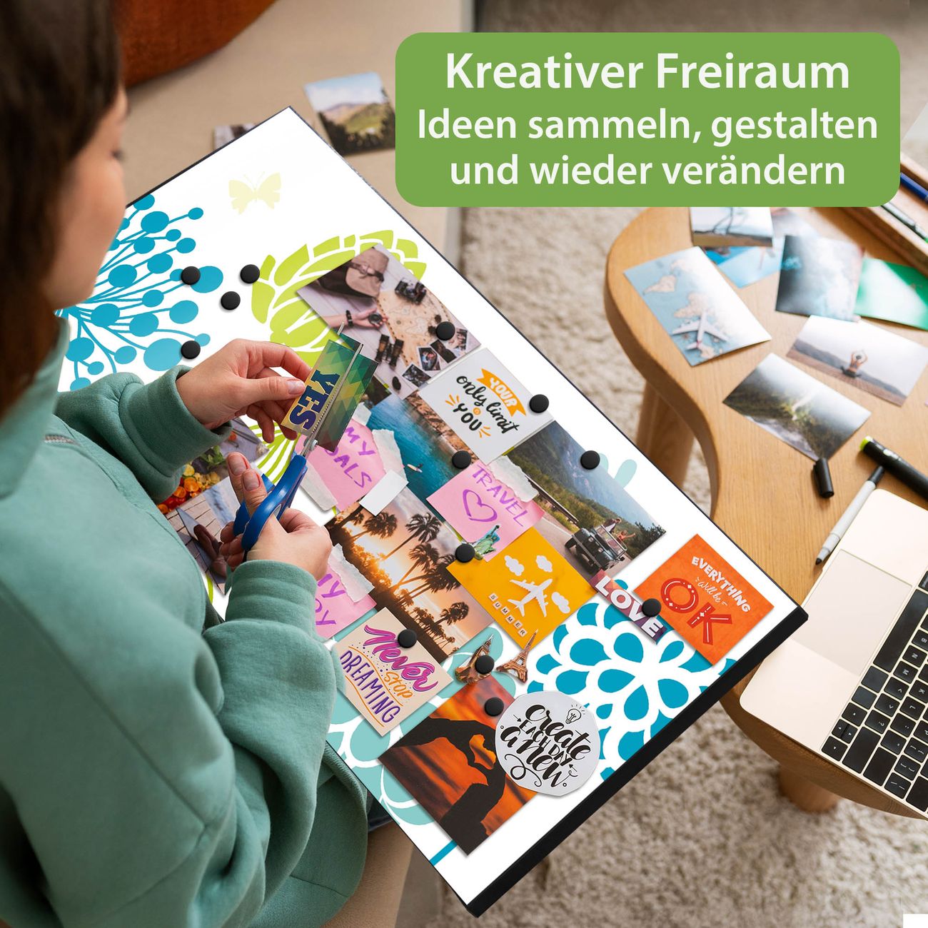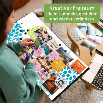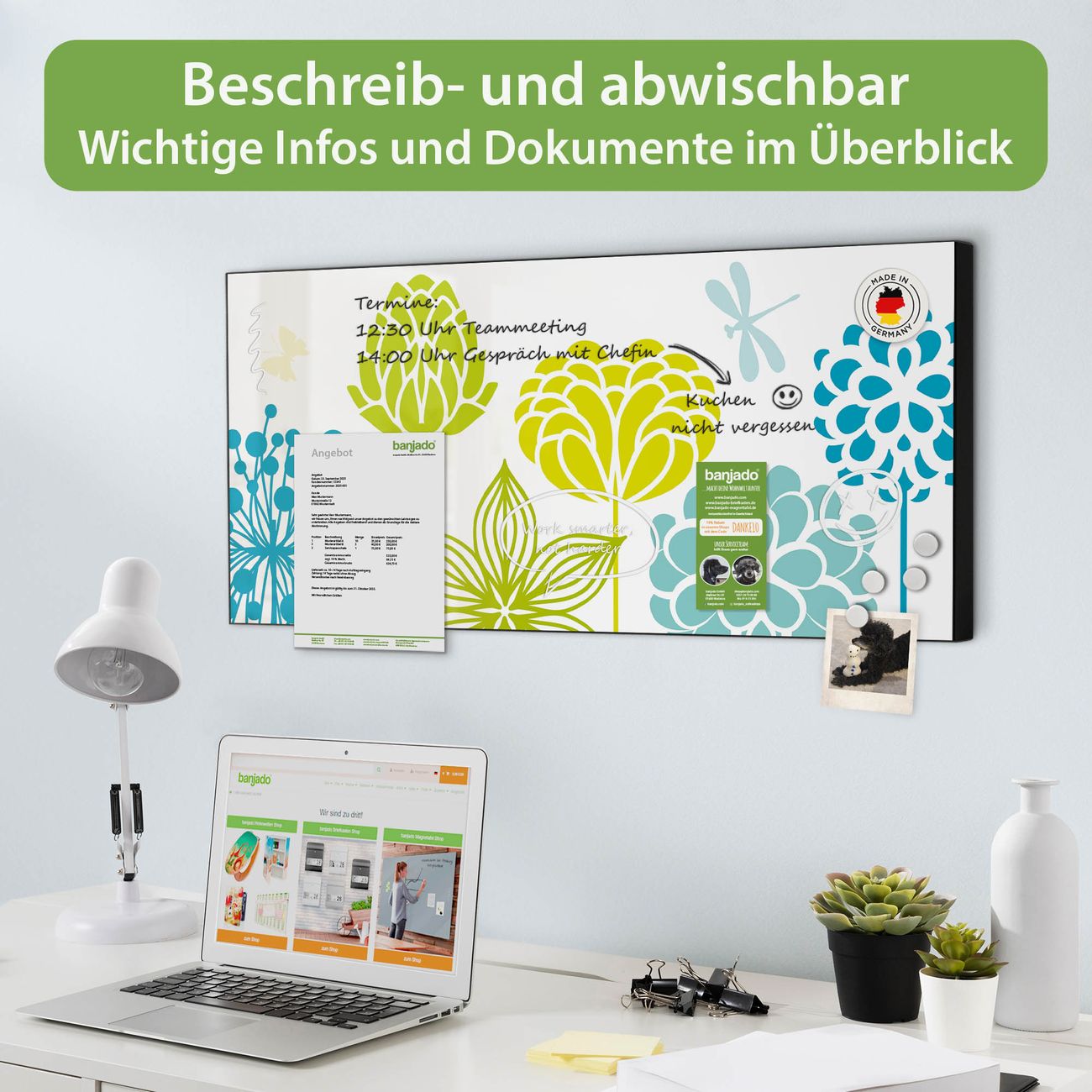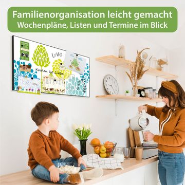 FUNKTION: Die banjado Magnettafel 78x37 cm im Design Motiv Kräuterwiese vereint Funktionalität und modernes Wohndesign auf stilvolle Weise. Diese hochwertige Magnetwand aus Metall hilft Ihnen dabei, Notizen, Fotos, Termine, Einkaufslisten oder Rezepte übersichtlich zu organisieren. Als praktisches Memoboard sorgt sie für Struktur im Alltag und setzt gleichzeitig einen dekorativen Akzent an Ihrer Wand. DESIGN: Die Metalltafel besteht aus robustem, lackiertem Stahl und ist mit allen handelsüblichen Magneten nutzbar. Besonders praktisch ist die beschreibbare Oberfläche. Sie können die Magnettafel ganz einfach mit Kreidestiften beschriften und die Inhalte bei Bedarf mit einem feuchten Tuch wieder entfernen. So eignet sich das Memoboard ideal für Wochenpläne, Menüpläne, To Do Listen oder kreative Botschaften. DETAILS: Mit ihrem großzügigen Querformat von 78x37 cm bietet die Magnettafel ausreichend Platz für Ihre Organisation. Das Motiv Motiv Kräuterwiese bringt eine warme, natürliche Optik in Küche, Flur, Büro oder Homeoffice und wirkt auch ohne Magnete oder Beschriftung wie ein modernes Wandbild. NUTZEN: Auf der Rückseite befinden sich vorgefertigte Löcher für eine schnelle und unkomplizierte Wandmontage. Jede banjado Magnettafel wird in Deutschland gefertigt und steht für Qualität, Langlebigkeit und liebevolle Verarbeitung. Dieses beschreibbare Memoboard ist die perfekte Kombination aus Metalltafel, Designobjekt und praktischer Magnetwand für Ihren Alltag. BANJADO: Wir sind ein kleines Team aus dem Herzen von Sachsen. Wir fertigen alle Artikel von Hand für Sie an, Sie erhalten keine preiswerte Importware. Auf Wunsch können Sie auch Ihr eigenes Foto auf die Magnettafel aufbringen, schreiben Sie uns an. Herzlichst, Ihr banjado-Team