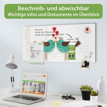FUNKTION: Die banjado Magnettafel 78x37 cm im Design Motiv Küsschen vereint Funktionalität und modernes Wohndesign auf stilvolle Weise. Diese hochwertige Magnetwand aus Metall hilft Ihnen dabei, Notizen, Fotos, Termine, Einkaufslisten oder Rezepte übersichtlich zu organisieren. Als praktisches Memoboard sorgt sie für Struktur im Alltag und setzt gleichzeitig einen dekorativen Akzent an Ihrer Wand. DESIGN: Die Metalltafel besteht aus robustem, lackiertem Stahl und ist mit allen handelsüblichen Magneten nutzbar. Besonders praktisch ist die beschreibbare Oberfläche. Sie können die Magnettafel ganz einfach mit Kreidestiften beschriften und die Inhalte bei Bedarf mit einem feuchten Tuch wieder entfernen. So eignet sich das Memoboard ideal für Wochenpläne, Menüpläne, To Do Listen oder kreative Botschaften. DETAILS: Mit ihrem großzügigen Querformat von 78x37 cm bietet die Magnettafel ausreichend Platz für Ihre Organisation. Das Motiv Motiv Küsschen bringt eine warme, natürliche Optik in Küche, Flur, Büro oder Homeoffice und wirkt auch ohne Magnete oder Beschriftung wie ein modernes Wandbild. NUTZEN: Auf der Rückseite befinden sich vorgefertigte Löcher für eine schnelle und unkomplizierte Wandmontage. Jede banjado Magnettafel wird in Deutschland gefertigt und steht für Qualität, Langlebigkeit und liebevolle Verarbeitung. Dieses beschreibbare Memoboard ist die perfekte Kombination aus Metalltafel, Designobjekt und praktischer Magnetwand für Ihren Alltag. BANJADO: Wir sind ein kleines Team aus dem Herzen von Sachsen. Wir fertigen alle Artikel von Hand für Sie an, Sie erhalten keine preiswerte Importware. Auf Wunsch können Sie auch Ihr eigenes Foto auf die Magnettafel aufbringen, schreiben Sie uns an. Herzlichst, Ihr banjado-Team