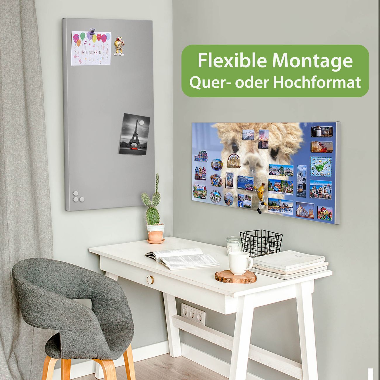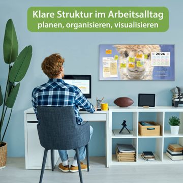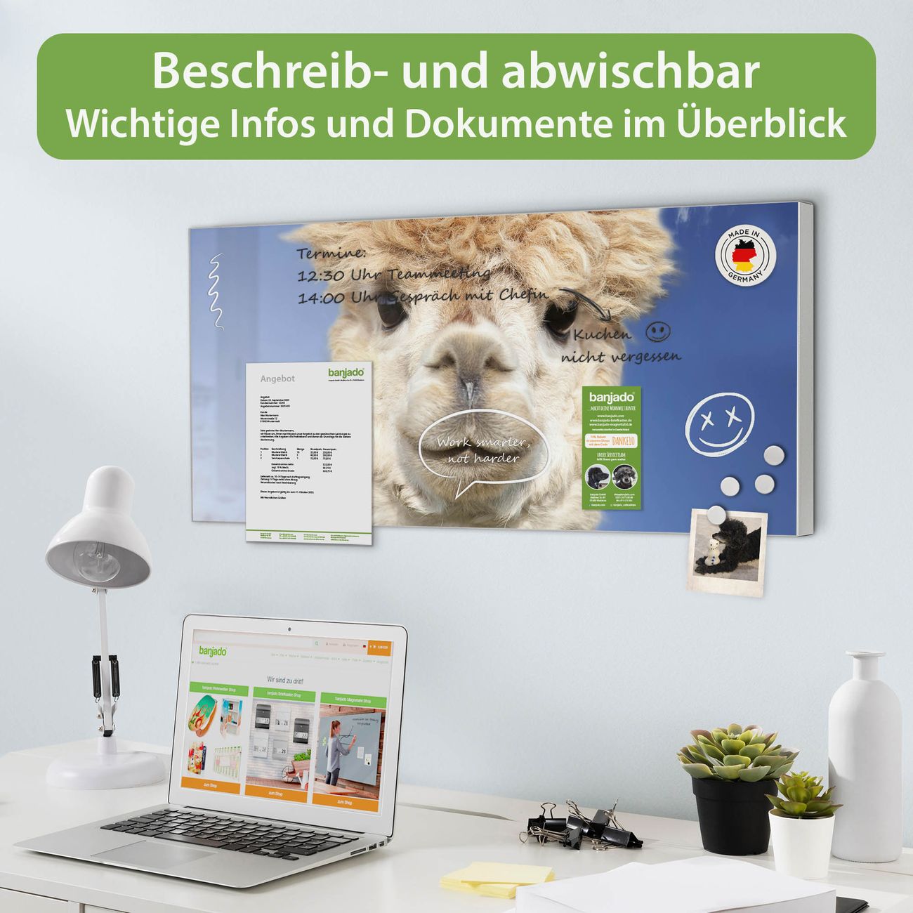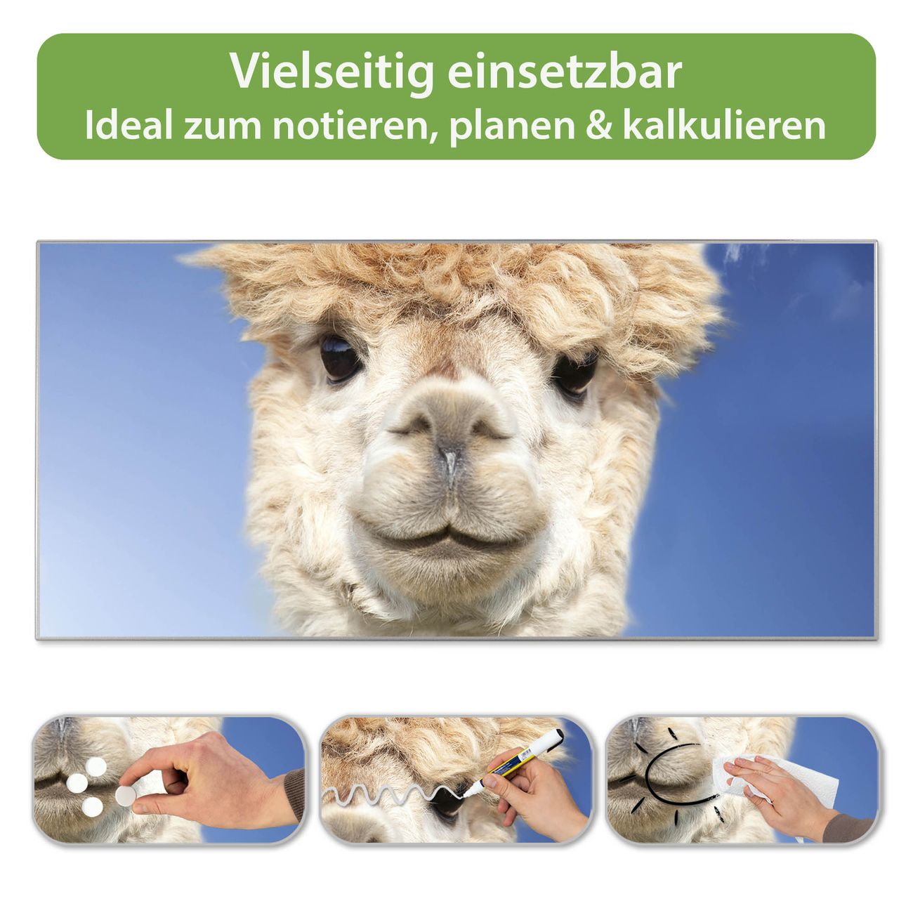 FUNKTION: Die banjado Magnettafel 78x37 cm im Design Motiv Lama vereint Funktionalität und modernes Wohndesign auf stilvolle Weise. Diese hochwertige Magnetwand aus Metall hilft Ihnen dabei, Notizen, Fotos, Termine, Einkaufslisten oder Rezepte übersichtlich zu organisieren. Als praktisches Memoboard sorgt sie für Struktur im Alltag und setzt gleichzeitig einen dekorativen Akzent an Ihrer Wand. DESIGN: Die Metalltafel besteht aus robustem, lackiertem Stahl und ist mit allen handelsüblichen Magneten nutzbar. Besonders praktisch ist die beschreibbare Oberfläche. Sie können die Magnettafel ganz einfach mit Kreidestiften beschriften und die Inhalte bei Bedarf mit einem feuchten Tuch wieder entfernen. So eignet sich das Memoboard ideal für Wochenpläne, Menüpläne, To Do Listen oder kreative Botschaften. DETAILS: Mit ihrem großzügigen Querformat von 78x37 cm bietet die Magnettafel ausreichend Platz für Ihre Organisation. Das Motiv Motiv Lama bringt eine warme, natürliche Optik in Küche, Flur, Büro oder Homeoffice und wirkt auch ohne Magnete oder Beschriftung wie ein modernes Wandbild. NUTZEN: Auf der Rückseite befinden sich vorgefertigte Löcher für eine schnelle und unkomplizierte Wandmontage. Jede banjado Magnettafel wird in Deutschland gefertigt und steht für Qualität, Langlebigkeit und liebevolle Verarbeitung. Dieses beschreibbare Memoboard ist die perfekte Kombination aus Metalltafel, Designobjekt und praktischer Magnetwand für Ihren Alltag. BANJADO: Wir sind ein kleines Team aus dem Herzen von Sachsen. Wir fertigen alle Artikel von Hand für Sie an, Sie erhalten keine preiswerte Importware. Auf Wunsch können Sie auch Ihr eigenes Foto auf die Magnettafel aufbringen, schreiben Sie uns an. Herzlichst, Ihr banjado-Team
