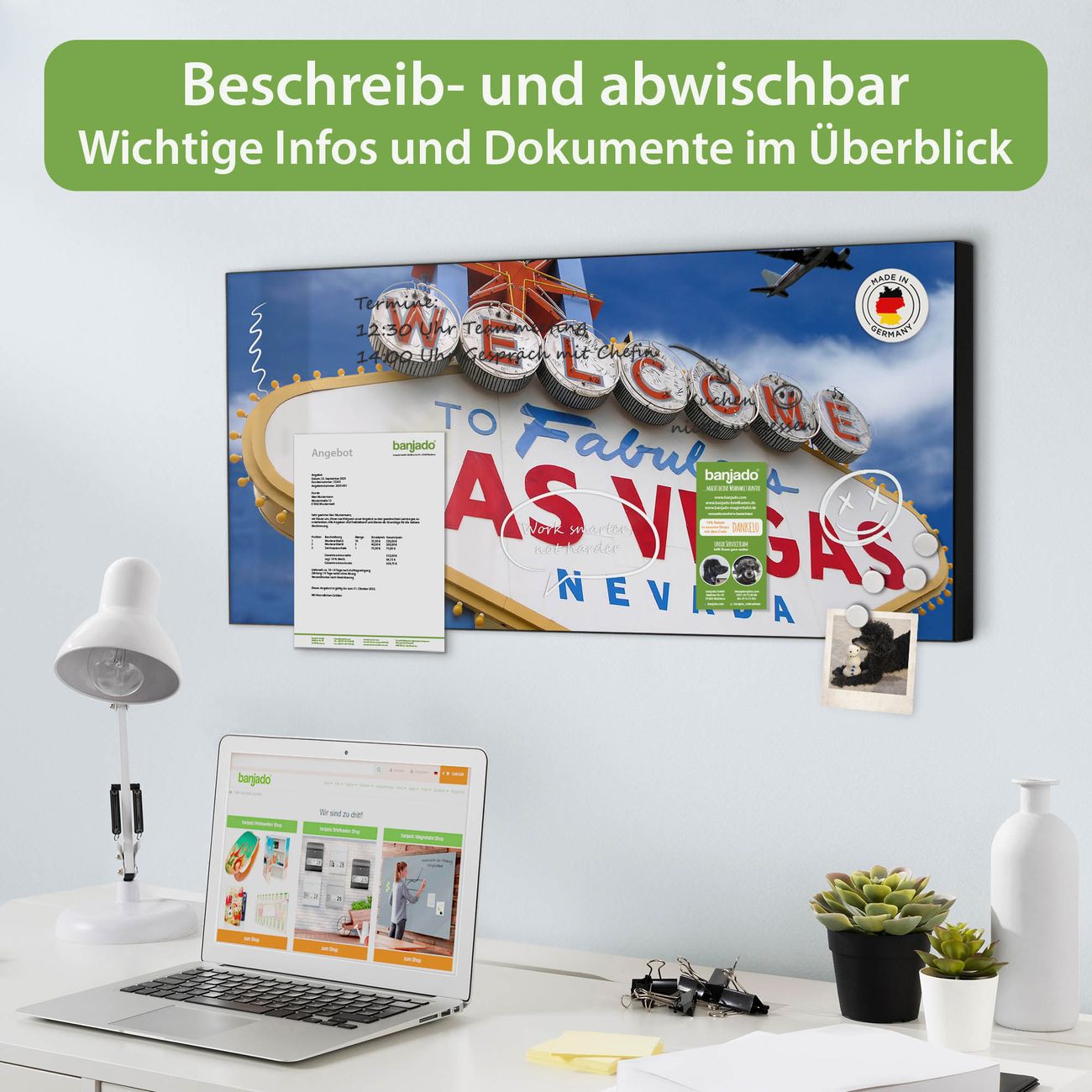 FUNKTION: Die banjado Magnettafel 78x37 cm im Design Motiv Las Vegas vereint Funktionalität und modernes Wohndesign auf stilvolle Weise. Diese hochwertige Magnetwand aus Metall hilft Ihnen dabei, Notizen, Fotos, Termine, Einkaufslisten oder Rezepte übersichtlich zu organisieren. Als praktisches Memoboard sorgt sie für Struktur im Alltag und setzt gleichzeitig einen dekorativen Akzent an Ihrer Wand. DESIGN: Die Metalltafel besteht aus robustem, lackiertem Stahl und ist mit allen handelsüblichen Magneten nutzbar. Besonders praktisch ist die beschreibbare Oberfläche. Sie können die Magnettafel ganz einfach mit Kreidestiften beschriften und die Inhalte bei Bedarf mit einem feuchten Tuch wieder entfernen. So eignet sich das Memoboard ideal für Wochenpläne, Menüpläne, To Do Listen oder kreative Botschaften. DETAILS: Mit ihrem großzügigen Querformat von 78x37 cm bietet die Magnettafel ausreichend Platz für Ihre Organisation. Das Motiv Motiv Las Vegas bringt eine warme, natürliche Optik in Küche, Flur, Büro oder Homeoffice und wirkt auch ohne Magnete oder Beschriftung wie ein modernes Wandbild. NUTZEN: Auf der Rückseite befinden sich vorgefertigte Löcher für eine schnelle und unkomplizierte Wandmontage. Jede banjado Magnettafel wird in Deutschland gefertigt und steht für Qualität, Langlebigkeit und liebevolle Verarbeitung. Dieses beschreibbare Memoboard ist die perfekte Kombination aus Metalltafel, Designobjekt und praktischer Magnetwand für Ihren Alltag. BANJADO: Wir sind ein kleines Team aus dem Herzen von Sachsen. Wir fertigen alle Artikel von Hand für Sie an, Sie erhalten keine preiswerte Importware. Auf Wunsch können Sie auch Ihr eigenes Foto auf die Magnettafel aufbringen, schreiben Sie uns an. Herzlichst, Ihr banjado-Team