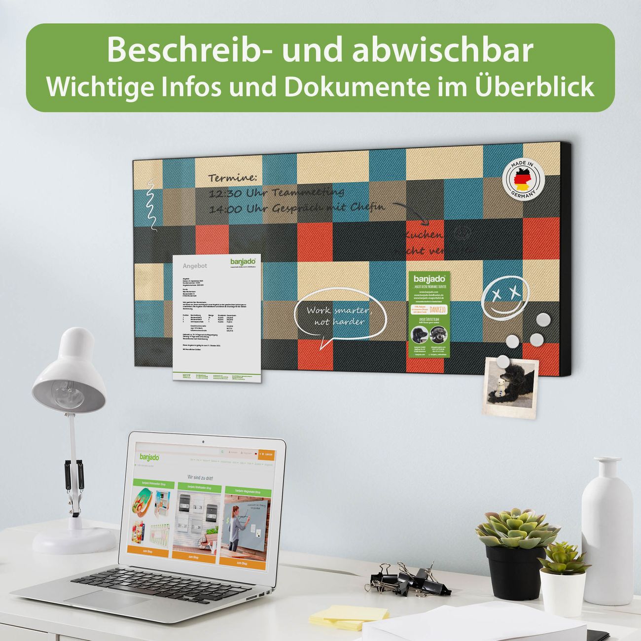 FUNKTION: Die banjado Magnettafel 78x37 cm im Design Motiv Lausanne vereint Funktionalität und modernes Wohndesign auf stilvolle Weise. Diese hochwertige Magnetwand aus Metall hilft Ihnen dabei, Notizen, Fotos, Termine, Einkaufslisten oder Rezepte übersichtlich zu organisieren. Als praktisches Memoboard sorgt sie für Struktur im Alltag und setzt gleichzeitig einen dekorativen Akzent an Ihrer Wand. DESIGN: Die Metalltafel besteht aus robustem, lackiertem Stahl und ist mit allen handelsüblichen Magneten nutzbar. Besonders praktisch ist die beschreibbare Oberfläche. Sie können die Magnettafel ganz einfach mit Kreidestiften beschriften und die Inhalte bei Bedarf mit einem feuchten Tuch wieder entfernen. So eignet sich das Memoboard ideal für Wochenpläne, Menüpläne, To Do Listen oder kreative Botschaften. DETAILS: Mit ihrem großzügigen Querformat von 78x37 cm bietet die Magnettafel ausreichend Platz für Ihre Organisation. Das Motiv Motiv Lausanne bringt eine warme, natürliche Optik in Küche, Flur, Büro oder Homeoffice und wirkt auch ohne Magnete oder Beschriftung wie ein modernes Wandbild. NUTZEN: Auf der Rückseite befinden sich vorgefertigte Löcher für eine schnelle und unkomplizierte Wandmontage. Jede banjado Magnettafel wird in Deutschland gefertigt und steht für Qualität, Langlebigkeit und liebevolle Verarbeitung. Dieses beschreibbare Memoboard ist die perfekte Kombination aus Metalltafel, Designobjekt und praktischer Magnetwand für Ihren Alltag. BANJADO: Wir sind ein kleines Team aus dem Herzen von Sachsen. Wir fertigen alle Artikel von Hand für Sie an, Sie erhalten keine preiswerte Importware. Auf Wunsch können Sie auch Ihr eigenes Foto auf die Magnettafel aufbringen, schreiben Sie uns an. Herzlichst, Ihr banjado-Team