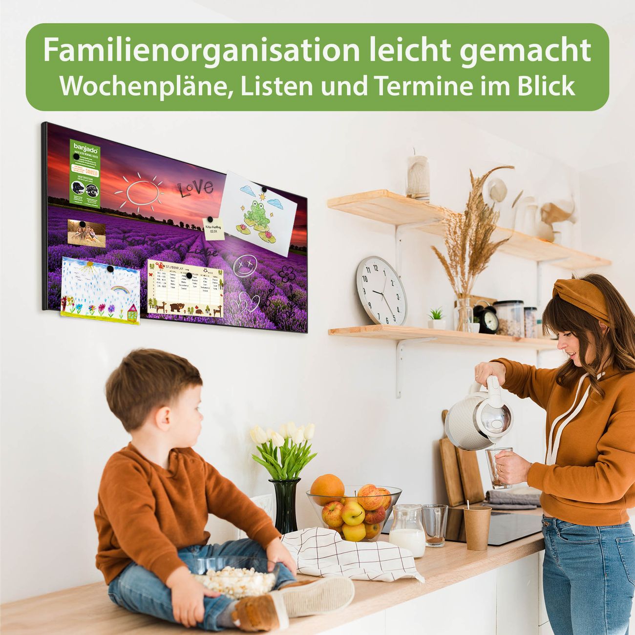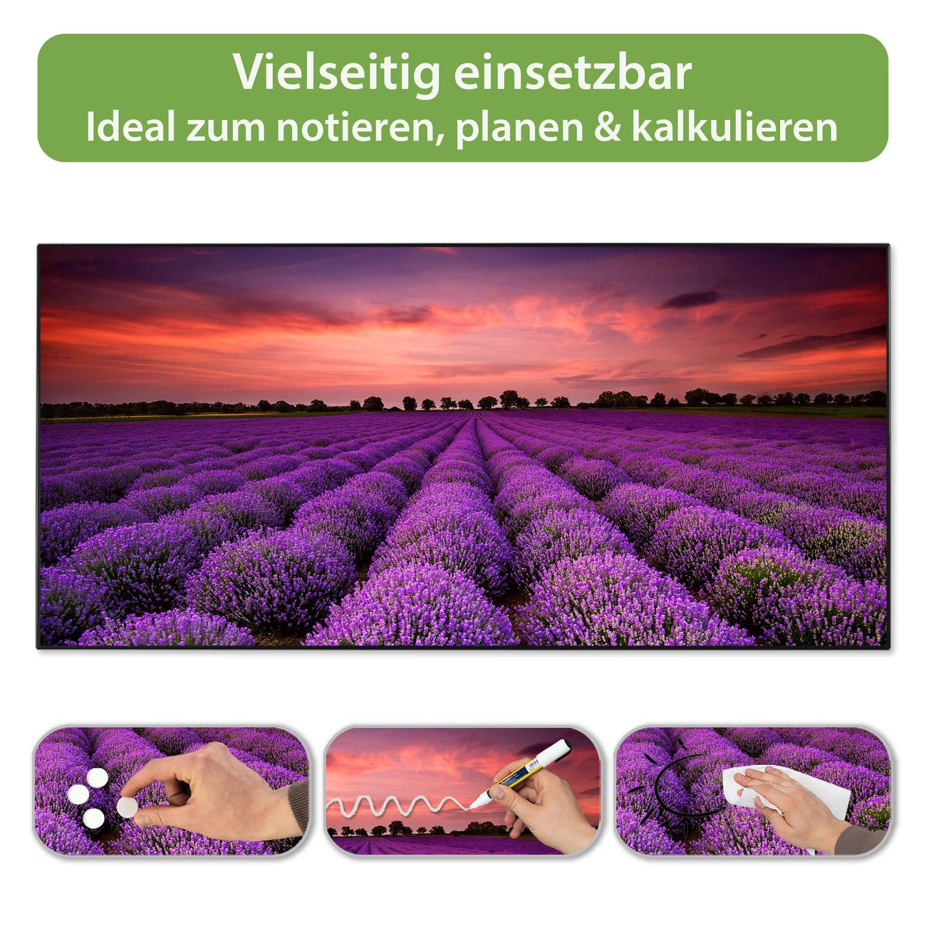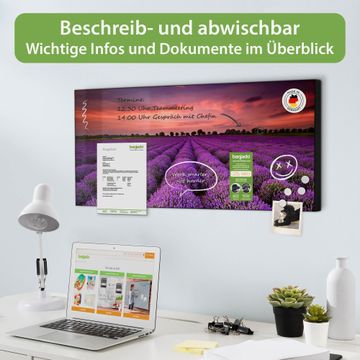 FUNKTION: Die banjado Magnettafel 78x37 cm im Design Motiv Lavendelfeld vereint Funktionalität und modernes Wohndesign auf stilvolle Weise. Diese hochwertige Magnetwand aus Metall hilft Ihnen dabei, Notizen, Fotos, Termine, Einkaufslisten oder Rezepte übersichtlich zu organisieren. Als praktisches Memoboard sorgt sie für Struktur im Alltag und setzt gleichzeitig einen dekorativen Akzent an Ihrer Wand. DESIGN: Die Metalltafel besteht aus robustem, lackiertem Stahl und ist mit allen handelsüblichen Magneten nutzbar. Besonders praktisch ist die beschreibbare Oberfläche. Sie können die Magnettafel ganz einfach mit Kreidestiften beschriften und die Inhalte bei Bedarf mit einem feuchten Tuch wieder entfernen. So eignet sich das Memoboard ideal für Wochenpläne, Menüpläne, To Do Listen oder kreative Botschaften. DETAILS: Mit ihrem großzügigen Querformat von 78x37 cm bietet die Magnettafel ausreichend Platz für Ihre Organisation. Das Motiv Motiv Lavendelfeld bringt eine warme, natürliche Optik in Küche, Flur, Büro oder Homeoffice und wirkt auch ohne Magnete oder Beschriftung wie ein modernes Wandbild. NUTZEN: Auf der Rückseite befinden sich vorgefertigte Löcher für eine schnelle und unkomplizierte Wandmontage. Jede banjado Magnettafel wird in Deutschland gefertigt und steht für Qualität, Langlebigkeit und liebevolle Verarbeitung. Dieses beschreibbare Memoboard ist die perfekte Kombination aus Metalltafel, Designobjekt und praktischer Magnetwand für Ihren Alltag. BANJADO: Wir sind ein kleines Team aus dem Herzen von Sachsen. Wir fertigen alle Artikel von Hand für Sie an, Sie erhalten keine preiswerte Importware. Auf Wunsch können Sie auch Ihr eigenes Foto auf die Magnettafel aufbringen, schreiben Sie uns an. Herzlichst, Ihr banjado-Team