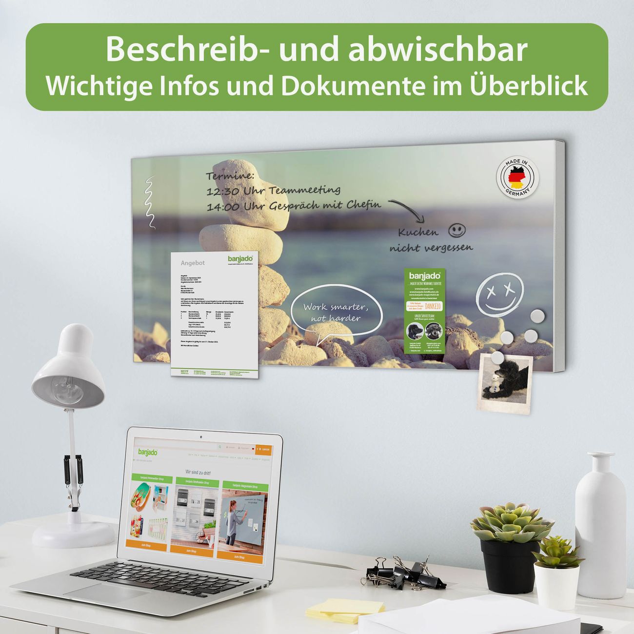 FUNKTION: Die banjado Magnettafel 78x37 cm im Design Motiv Leichte Steine vereint Funktionalität und modernes Wohndesign auf stilvolle Weise. Diese hochwertige Magnetwand aus Metall hilft Ihnen dabei, Notizen, Fotos, Termine, Einkaufslisten oder Rezepte übersichtlich zu organisieren. Als praktisches Memoboard sorgt sie für Struktur im Alltag und setzt gleichzeitig einen dekorativen Akzent an Ihrer Wand. DESIGN: Die Metalltafel besteht aus robustem, lackiertem Stahl und ist mit allen handelsüblichen Magneten nutzbar. Besonders praktisch ist die beschreibbare Oberfläche. Sie können die Magnettafel ganz einfach mit Kreidestiften beschriften und die Inhalte bei Bedarf mit einem feuchten Tuch wieder entfernen. So eignet sich das Memoboard ideal für Wochenpläne, Menüpläne, To Do Listen oder kreative Botschaften. DETAILS: Mit ihrem großzügigen Querformat von 78x37 cm bietet die Magnettafel ausreichend Platz für Ihre Organisation. Das Motiv Motiv Leichte Steine bringt eine warme, natürliche Optik in Küche, Flur, Büro oder Homeoffice und wirkt auch ohne Magnete oder Beschriftung wie ein modernes Wandbild. NUTZEN: Auf der Rückseite befinden sich vorgefertigte Löcher für eine schnelle und unkomplizierte Wandmontage. Jede banjado Magnettafel wird in Deutschland gefertigt und steht für Qualität, Langlebigkeit und liebevolle Verarbeitung. Dieses beschreibbare Memoboard ist die perfekte Kombination aus Metalltafel, Designobjekt und praktischer Magnetwand für Ihren Alltag. BANJADO: Wir sind ein kleines Team aus dem Herzen von Sachsen. Wir fertigen alle Artikel von Hand für Sie an, Sie erhalten keine preiswerte Importware. Auf Wunsch können Sie auch Ihr eigenes Foto auf die Magnettafel aufbringen, schreiben Sie uns an. Herzlichst, Ihr banjado-Team