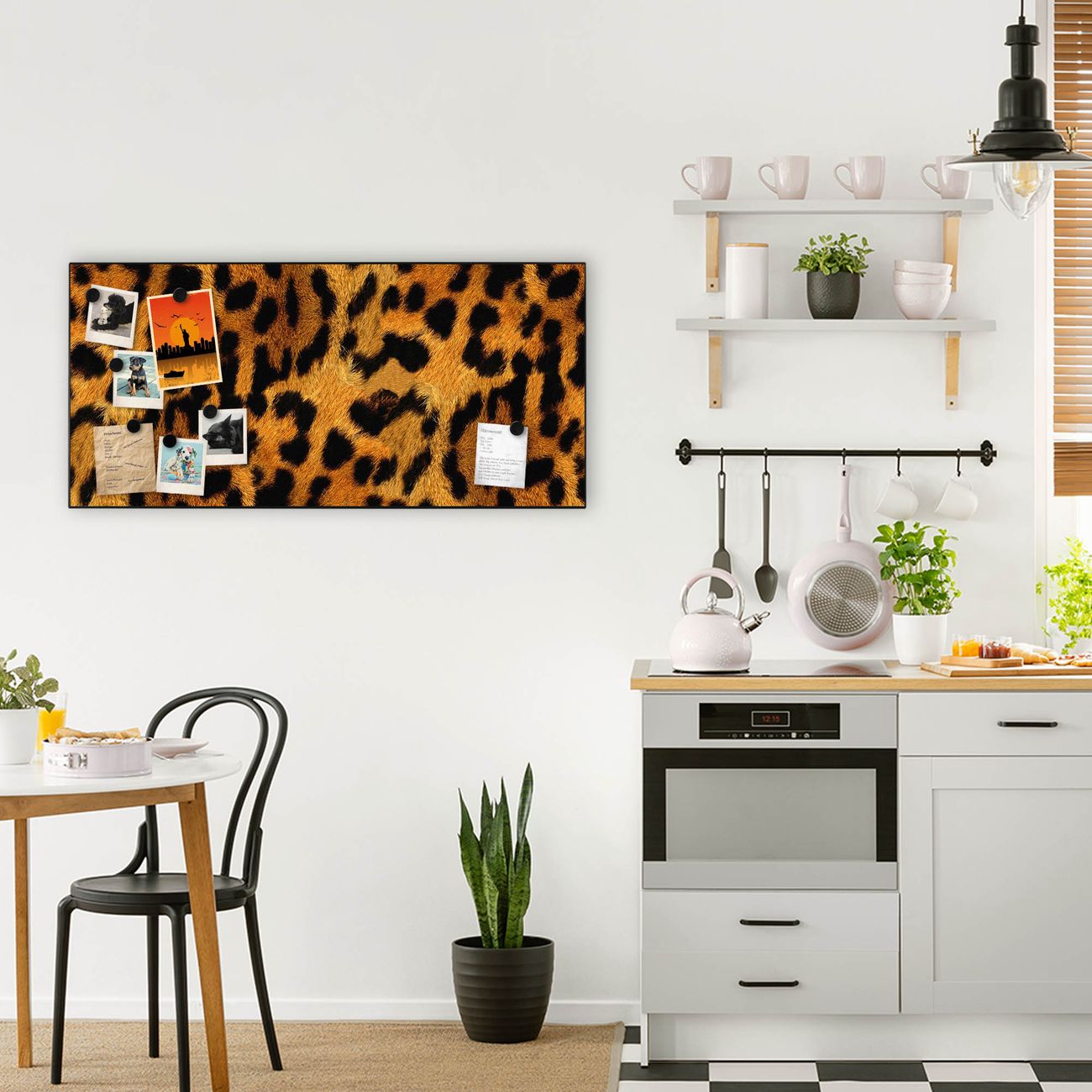 FUNKTION:  Die banjado Magnettafel mit Motiv Leopard Motiv bringt Ordnung in Ihr Zettelchaos. Fotos, Termine, Notizen oder Rezepte lassen Sich hier stilvoll mit Magneten ordnen, Sie behalten alles im Blick. An der Design Magnetwand halten alle handesüblichen Magnete. DESIGN:  Die Metall Pinnwand mit dem Motiv Motiv Leopard ist ein eleganter Begleiter im Alltag. Mit dieser Magnettafel haben Sie auch ohne Notizen und Magnete ein schönes Dekoelement. Das Format bietet Ihnen ausreichend Platz um alle wichtigen Informationen im Blick zu behalten. DETAILS: Die magnetische Pinnwand besteht aus silber-grau, weiß oder schwarz lackiertem Stahl. Sie hat eine Größe von 78cm x 37cm. Es befinden sich auf der Rückseite vorgefertigte Löcher die eine schnelle und unkomplizierte Anbringung ermöglichen. Das Motiv ist mit einem seidenmatten Laminat versehen und schützt so zusätzlich vor Kratzern. NUTZEN:  Sie können diese Magnettafel wunderbar als Wandbild nutzen, es halten alle handelsüblichen Magneten daran. Das Memoboard ist mit einem feuchten Lappen oder Schwamm abwischbar. Sie finden bei uns eine große Auswahl an passenden Magneten. BANJADO:  Wir sind ein kleines Team aus dem Herzen von Sachsen. Wir fertigen alle Artikel von Hand für Sie an, Sie erhalten keine preiswerte Importware. Auf Wunsch können Sie auch Ihr eigenes Foto auf die Magnettafel aufbringen, schreiben Sie uns an. Herzlichst, Ihr banjado-Team