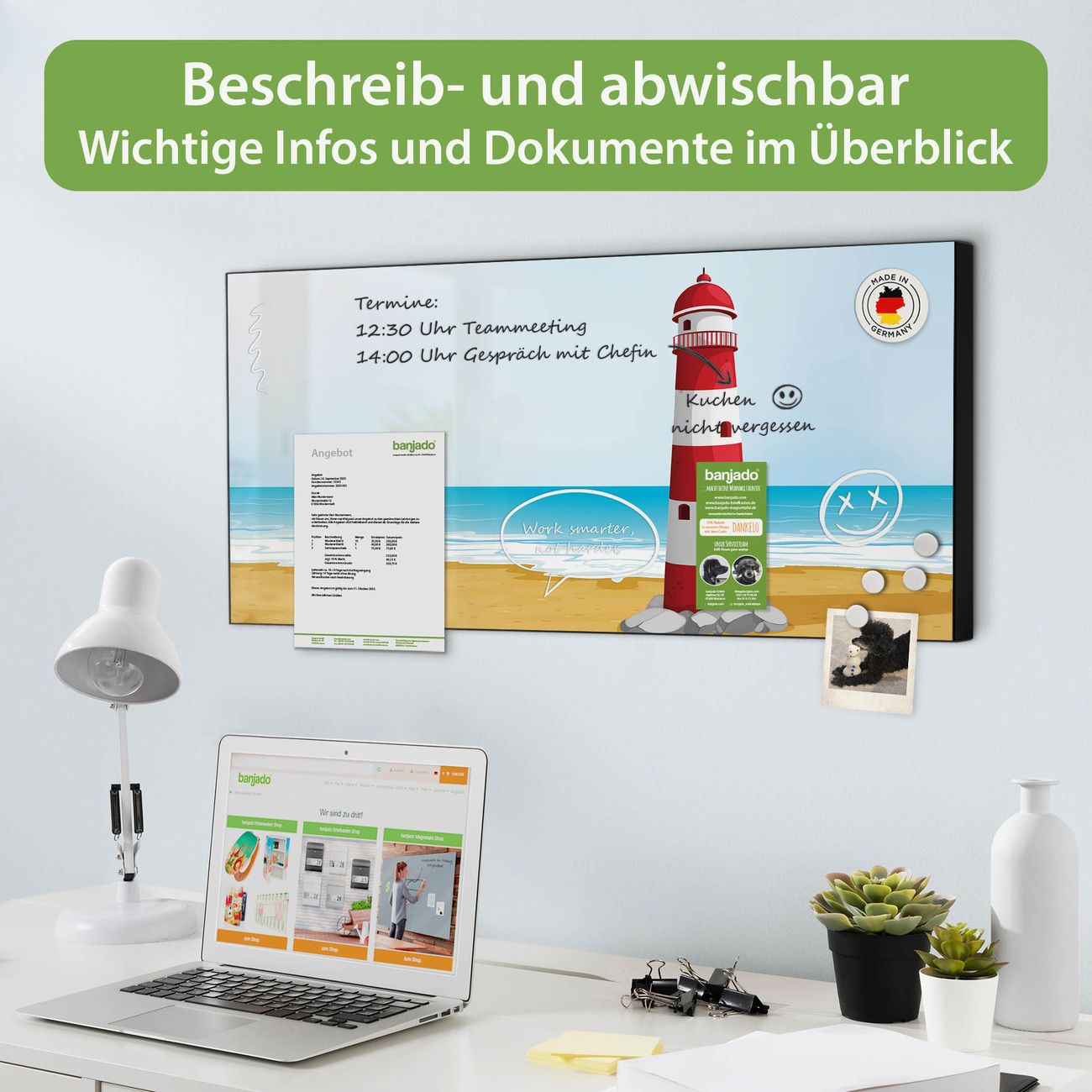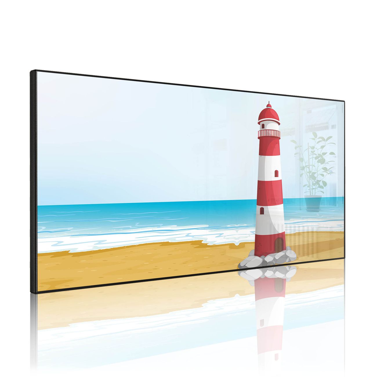 FUNKTION: Die banjado Magnettafel 78x37 cm im Design Motiv Leuchtturm Illustration vereint Funktionalität und modernes Wohndesign auf stilvolle Weise. Diese hochwertige Magnetwand aus Metall hilft Ihnen dabei, Notizen, Fotos, Termine, Einkaufslisten oder Rezepte übersichtlich zu organisieren. Als praktisches Memoboard sorgt sie für Struktur im Alltag und setzt gleichzeitig einen dekorativen Akzent an Ihrer Wand. DESIGN: Die Metalltafel besteht aus robustem, lackiertem Stahl und ist mit allen handelsüblichen Magneten nutzbar. Besonders praktisch ist die beschreibbare Oberfläche. Sie können die Magnettafel ganz einfach mit Kreidestiften beschriften und die Inhalte bei Bedarf mit einem feuchten Tuch wieder entfernen. So eignet sich das Memoboard ideal für Wochenpläne, Menüpläne, To Do Listen oder kreative Botschaften. DETAILS: Mit ihrem großzügigen Querformat von 78x37 cm bietet die Magnettafel ausreichend Platz für Ihre Organisation. Das Motiv Motiv Leuchtturm Illustration bringt eine warme, natürliche Optik in Küche, Flur, Büro oder Homeoffice und wirkt auch ohne Magnete oder Beschriftung wie ein modernes Wandbild. NUTZEN: Auf der Rückseite befinden sich vorgefertigte Löcher für eine schnelle und unkomplizierte Wandmontage. Jede banjado Magnettafel wird in Deutschland gefertigt und steht für Qualität, Langlebigkeit und liebevolle Verarbeitung. Dieses beschreibbare Memoboard ist die perfekte Kombination aus Metalltafel, Designobjekt und praktischer Magnetwand für Ihren Alltag. BANJADO: Wir sind ein kleines Team aus dem Herzen von Sachsen. Wir fertigen alle Artikel von Hand für Sie an, Sie erhalten keine preiswerte Importware. Auf Wunsch können Sie auch Ihr eigenes Foto auf die Magnettafel aufbringen, schreiben Sie uns an. Herzlichst, Ihr banjado-Team
