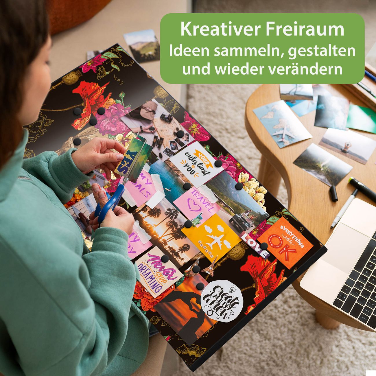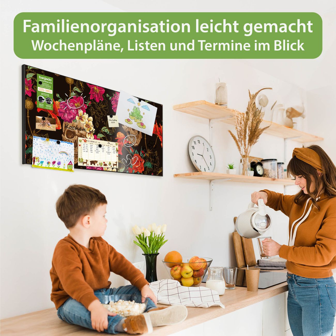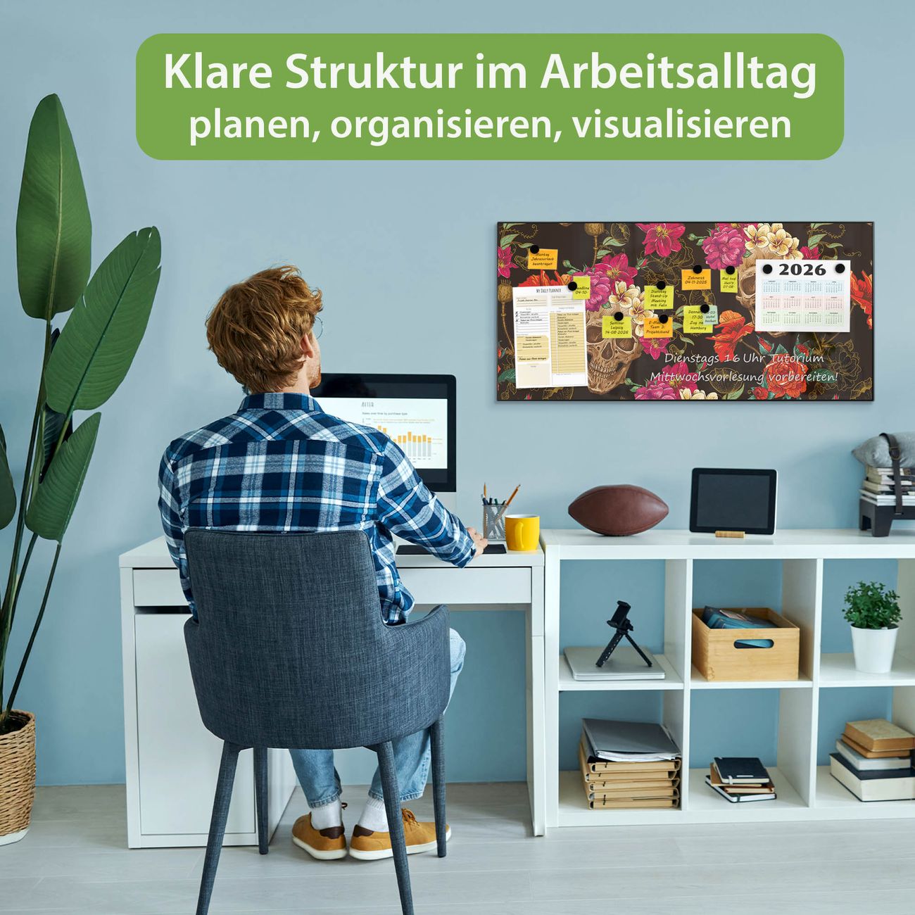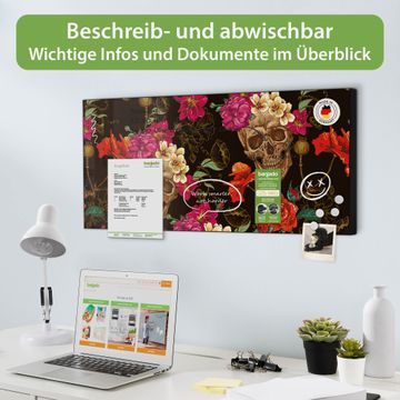 FUNKTION: Die banjado Magnettafel 78x37 cm im Design Motiv Los Dias de Muertos vereint Funktionalität und modernes Wohndesign auf stilvolle Weise. Diese hochwertige Magnetwand aus Metall hilft Ihnen dabei, Notizen, Fotos, Termine, Einkaufslisten oder Rezepte übersichtlich zu organisieren. Als praktisches Memoboard sorgt sie für Struktur im Alltag und setzt gleichzeitig einen dekorativen Akzent an Ihrer Wand. DESIGN: Die Metalltafel besteht aus robustem, lackiertem Stahl und ist mit allen handelsüblichen Magneten nutzbar. Besonders praktisch ist die beschreibbare Oberfläche. Sie können die Magnettafel ganz einfach mit Kreidestiften beschriften und die Inhalte bei Bedarf mit einem feuchten Tuch wieder entfernen. So eignet sich das Memoboard ideal für Wochenpläne, Menüpläne, To Do Listen oder kreative Botschaften. DETAILS: Mit ihrem großzügigen Querformat von 78x37 cm bietet die Magnettafel ausreichend Platz für Ihre Organisation. Das Motiv Motiv Los Dias de Muertos bringt eine warme, natürliche Optik in Küche, Flur, Büro oder Homeoffice und wirkt auch ohne Magnete oder Beschriftung wie ein modernes Wandbild. NUTZEN: Auf der Rückseite befinden sich vorgefertigte Löcher für eine schnelle und unkomplizierte Wandmontage. Jede banjado Magnettafel wird in Deutschland gefertigt und steht für Qualität, Langlebigkeit und liebevolle Verarbeitung. Dieses beschreibbare Memoboard ist die perfekte Kombination aus Metalltafel, Designobjekt und praktischer Magnetwand für Ihren Alltag. BANJADO: Wir sind ein kleines Team aus dem Herzen von Sachsen. Wir fertigen alle Artikel von Hand für Sie an, Sie erhalten keine preiswerte Importware. Auf Wunsch können Sie auch Ihr eigenes Foto auf die Magnettafel aufbringen, schreiben Sie uns an. Herzlichst, Ihr banjado-Team