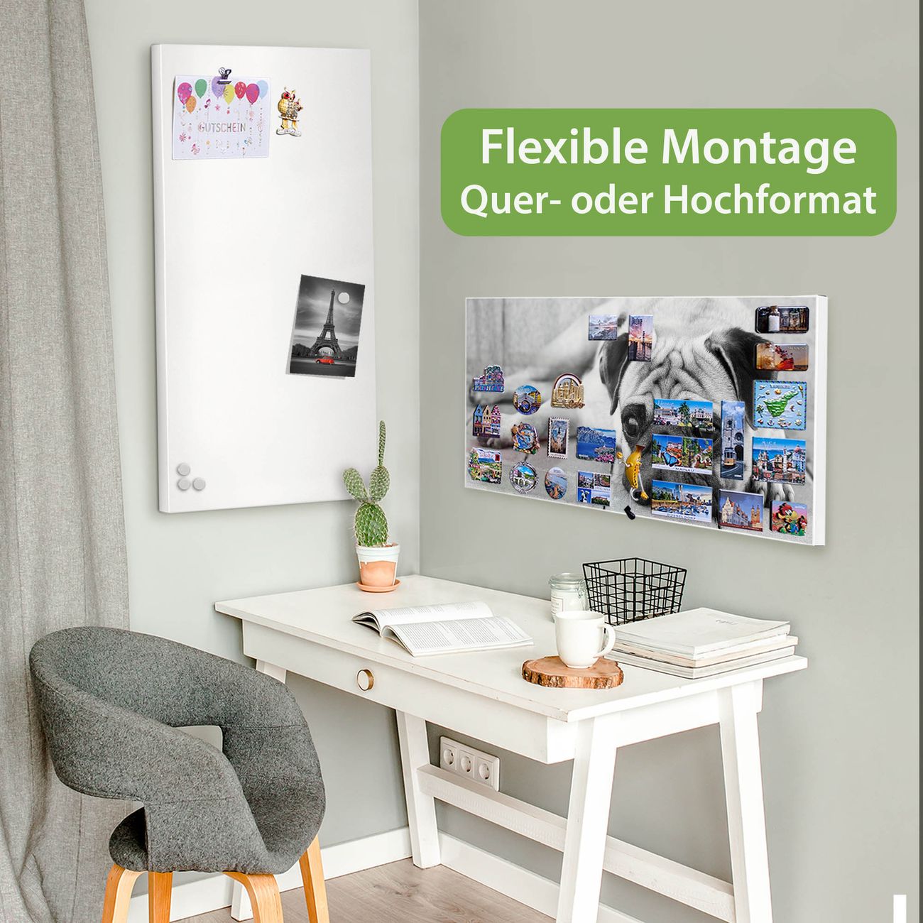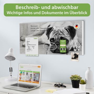 FUNKTION: Die banjado Magnettafel 78x37 cm im Design Motiv Lotty vereint Funktionalität und modernes Wohndesign auf stilvolle Weise. Diese hochwertige Magnetwand aus Metall hilft Ihnen dabei, Notizen, Fotos, Termine, Einkaufslisten oder Rezepte übersichtlich zu organisieren. Als praktisches Memoboard sorgt sie für Struktur im Alltag und setzt gleichzeitig einen dekorativen Akzent an Ihrer Wand. DESIGN: Die Metalltafel besteht aus robustem, lackiertem Stahl und ist mit allen handelsüblichen Magneten nutzbar. Besonders praktisch ist die beschreibbare Oberfläche. Sie können die Magnettafel ganz einfach mit Kreidestiften beschriften und die Inhalte bei Bedarf mit einem feuchten Tuch wieder entfernen. So eignet sich das Memoboard ideal für Wochenpläne, Menüpläne, To Do Listen oder kreative Botschaften. DETAILS: Mit ihrem großzügigen Querformat von 78x37 cm bietet die Magnettafel ausreichend Platz für Ihre Organisation. Das Motiv Motiv Lotty bringt eine warme, natürliche Optik in Küche, Flur, Büro oder Homeoffice und wirkt auch ohne Magnete oder Beschriftung wie ein modernes Wandbild. NUTZEN: Auf der Rückseite befinden sich vorgefertigte Löcher für eine schnelle und unkomplizierte Wandmontage. Jede banjado Magnettafel wird in Deutschland gefertigt und steht für Qualität, Langlebigkeit und liebevolle Verarbeitung. Dieses beschreibbare Memoboard ist die perfekte Kombination aus Metalltafel, Designobjekt und praktischer Magnetwand für Ihren Alltag. BANJADO: Wir sind ein kleines Team aus dem Herzen von Sachsen. Wir fertigen alle Artikel von Hand für Sie an, Sie erhalten keine preiswerte Importware. Auf Wunsch können Sie auch Ihr eigenes Foto auf die Magnettafel aufbringen, schreiben Sie uns an. Herzlichst, Ihr banjado-Team