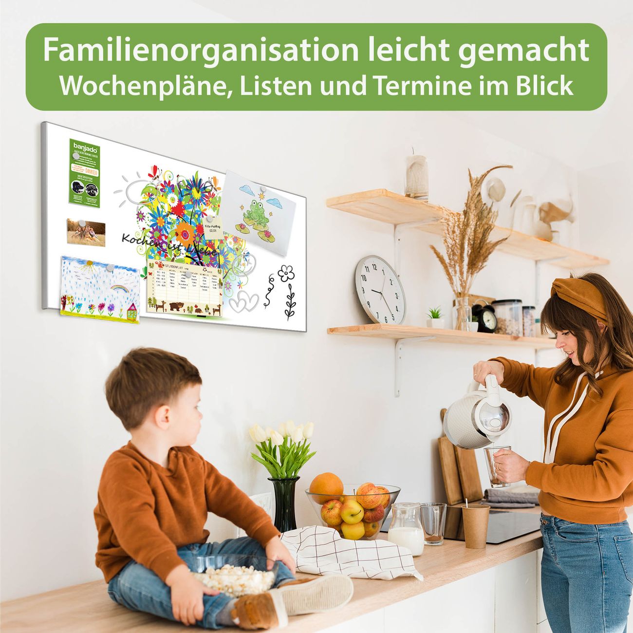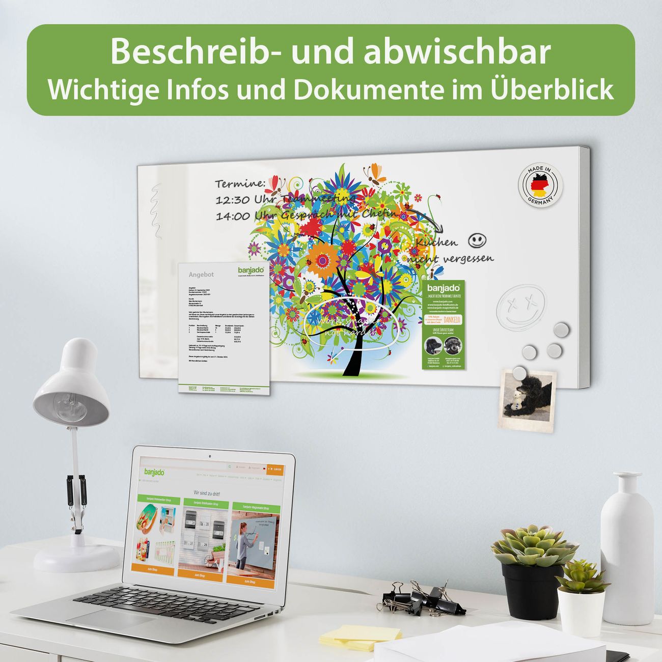 FUNKTION: Die banjado Magnettafel 78x37 cm im Design Motiv Märchenzauberbaum vereint Funktionalität und modernes Wohndesign auf stilvolle Weise. Diese hochwertige Magnetwand aus Metall hilft Ihnen dabei, Notizen, Fotos, Termine, Einkaufslisten oder Rezepte übersichtlich zu organisieren. Als praktisches Memoboard sorgt sie für Struktur im Alltag und setzt gleichzeitig einen dekorativen Akzent an Ihrer Wand. DESIGN: Die Metalltafel besteht aus robustem, lackiertem Stahl und ist mit allen handelsüblichen Magneten nutzbar. Besonders praktisch ist die beschreibbare Oberfläche. Sie können die Magnettafel ganz einfach mit Kreidestiften beschriften und die Inhalte bei Bedarf mit einem feuchten Tuch wieder entfernen. So eignet sich das Memoboard ideal für Wochenpläne, Menüpläne, To Do Listen oder kreative Botschaften. DETAILS: Mit ihrem großzügigen Querformat von 78x37 cm bietet die Magnettafel ausreichend Platz für Ihre Organisation. Das Motiv Motiv Märchenzauberbaum bringt eine warme, natürliche Optik in Küche, Flur, Büro oder Homeoffice und wirkt auch ohne Magnete oder Beschriftung wie ein modernes Wandbild. NUTZEN: Auf der Rückseite befinden sich vorgefertigte Löcher für eine schnelle und unkomplizierte Wandmontage. Jede banjado Magnettafel wird in Deutschland gefertigt und steht für Qualität, Langlebigkeit und liebevolle Verarbeitung. Dieses beschreibbare Memoboard ist die perfekte Kombination aus Metalltafel, Designobjekt und praktischer Magnetwand für Ihren Alltag. BANJADO: Wir sind ein kleines Team aus dem Herzen von Sachsen. Wir fertigen alle Artikel von Hand für Sie an, Sie erhalten keine preiswerte Importware. Auf Wunsch können Sie auch Ihr eigenes Foto auf die Magnettafel aufbringen, schreiben Sie uns an. Herzlichst, Ihr banjado-Team