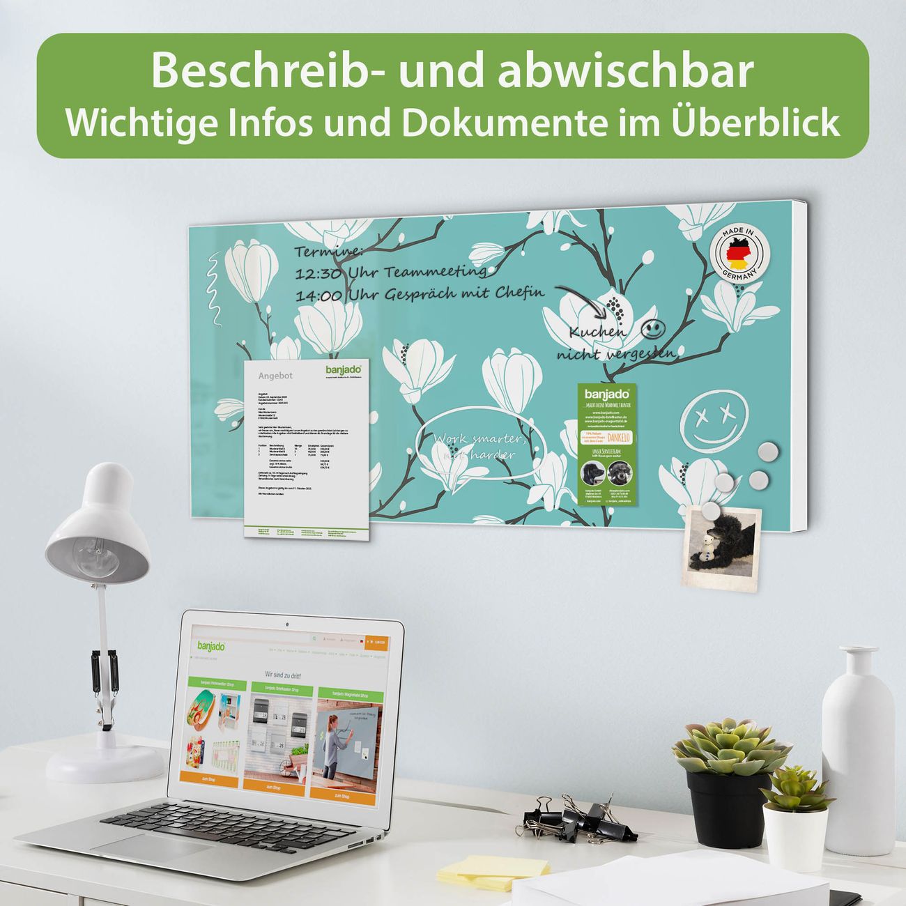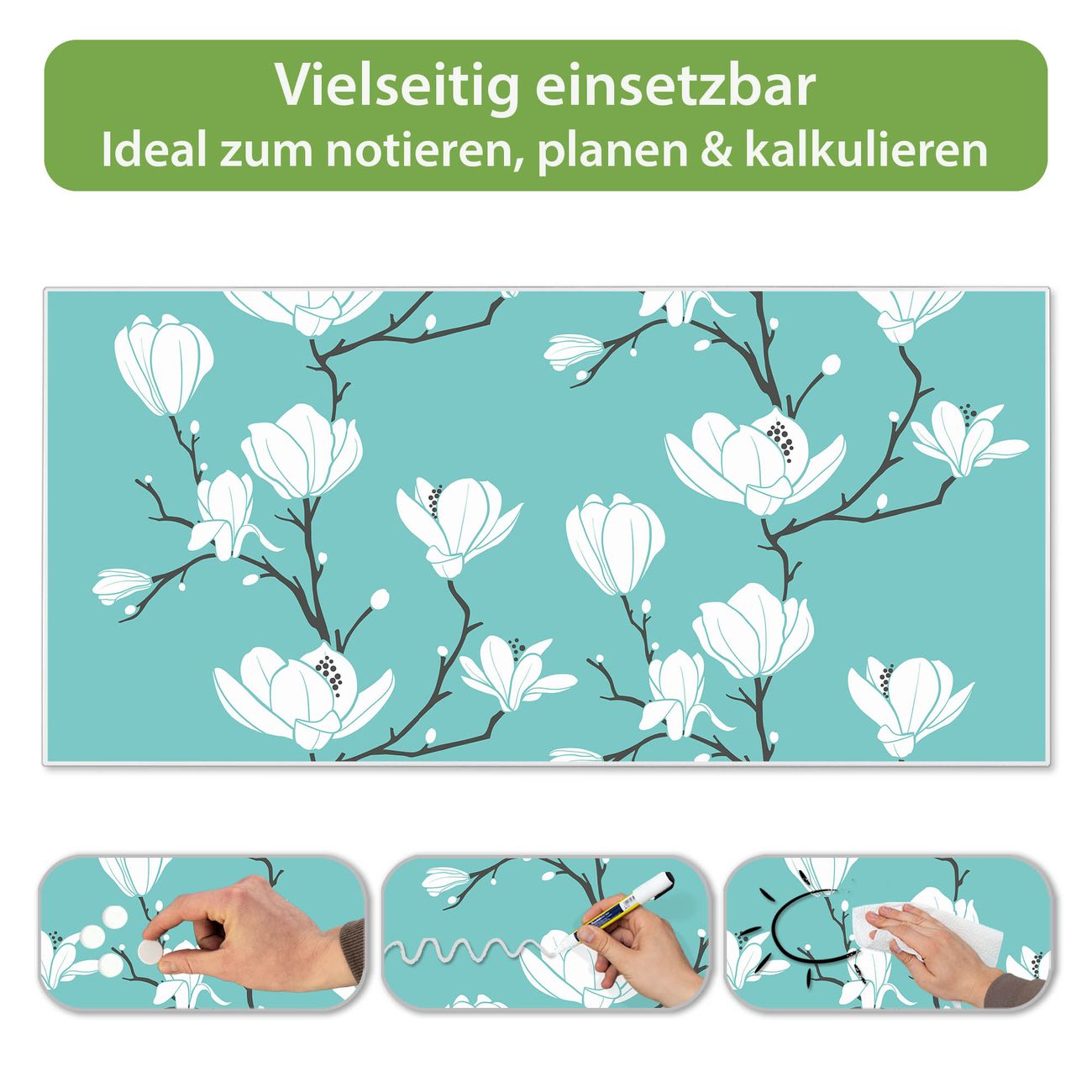 FUNKTION: Die banjado Magnettafel 78x37 cm im Design Motiv Magnolien vereint Funktionalität und modernes Wohndesign auf stilvolle Weise. Diese hochwertige Magnetwand aus Metall hilft Ihnen dabei, Notizen, Fotos, Termine, Einkaufslisten oder Rezepte übersichtlich zu organisieren. Als praktisches Memoboard sorgt sie für Struktur im Alltag und setzt gleichzeitig einen dekorativen Akzent an Ihrer Wand. DESIGN: Die Metalltafel besteht aus robustem, lackiertem Stahl und ist mit allen handelsüblichen Magneten nutzbar. Besonders praktisch ist die beschreibbare Oberfläche. Sie können die Magnettafel ganz einfach mit Kreidestiften beschriften und die Inhalte bei Bedarf mit einem feuchten Tuch wieder entfernen. So eignet sich das Memoboard ideal für Wochenpläne, Menüpläne, To Do Listen oder kreative Botschaften. DETAILS: Mit ihrem großzügigen Querformat von 78x37 cm bietet die Magnettafel ausreichend Platz für Ihre Organisation. Das Motiv Motiv Magnolien bringt eine warme, natürliche Optik in Küche, Flur, Büro oder Homeoffice und wirkt auch ohne Magnete oder Beschriftung wie ein modernes Wandbild. NUTZEN: Auf der Rückseite befinden sich vorgefertigte Löcher für eine schnelle und unkomplizierte Wandmontage. Jede banjado Magnettafel wird in Deutschland gefertigt und steht für Qualität, Langlebigkeit und liebevolle Verarbeitung. Dieses beschreibbare Memoboard ist die perfekte Kombination aus Metalltafel, Designobjekt und praktischer Magnetwand für Ihren Alltag. BANJADO: Wir sind ein kleines Team aus dem Herzen von Sachsen. Wir fertigen alle Artikel von Hand für Sie an, Sie erhalten keine preiswerte Importware. Auf Wunsch können Sie auch Ihr eigenes Foto auf die Magnettafel aufbringen, schreiben Sie uns an. Herzlichst, Ihr banjado-Team