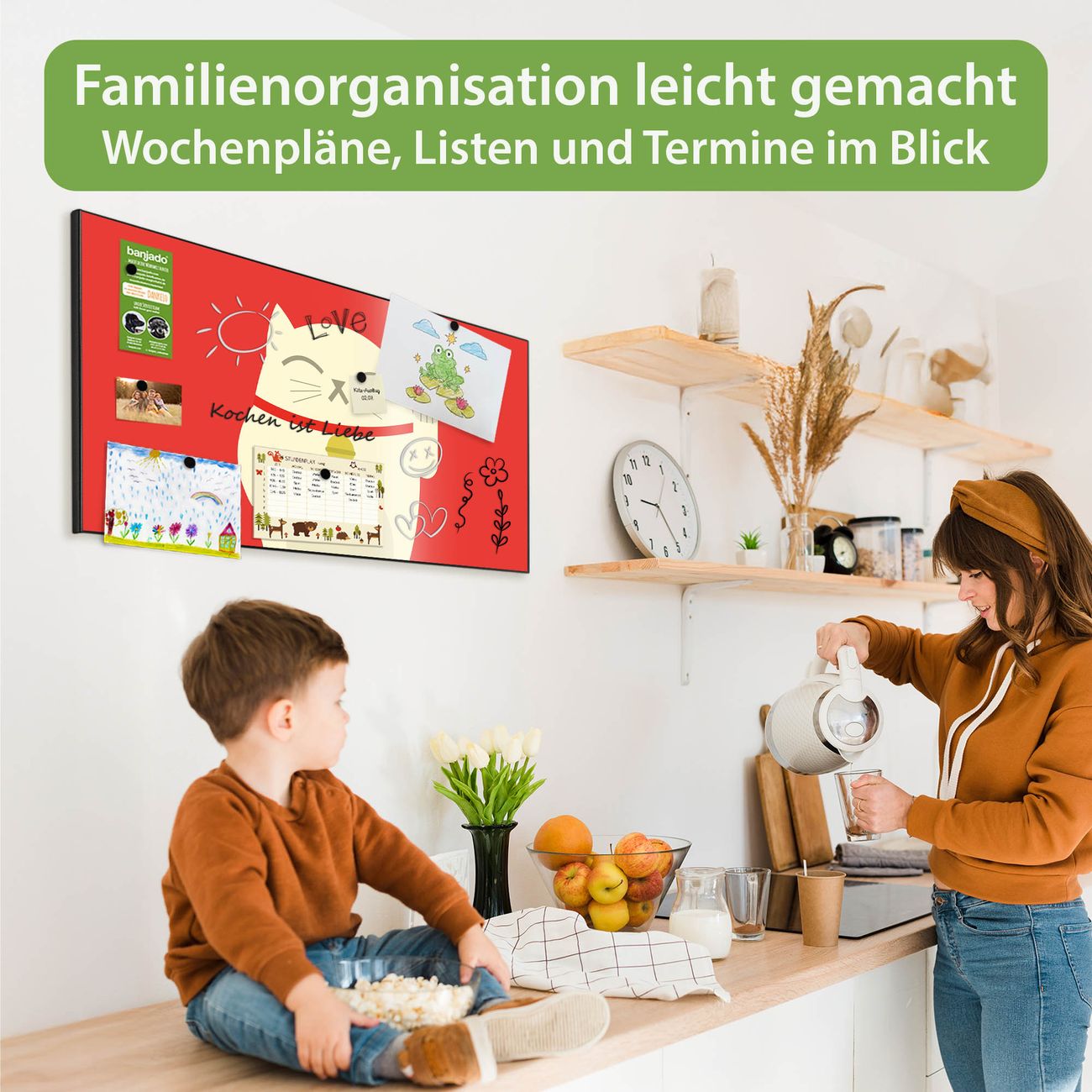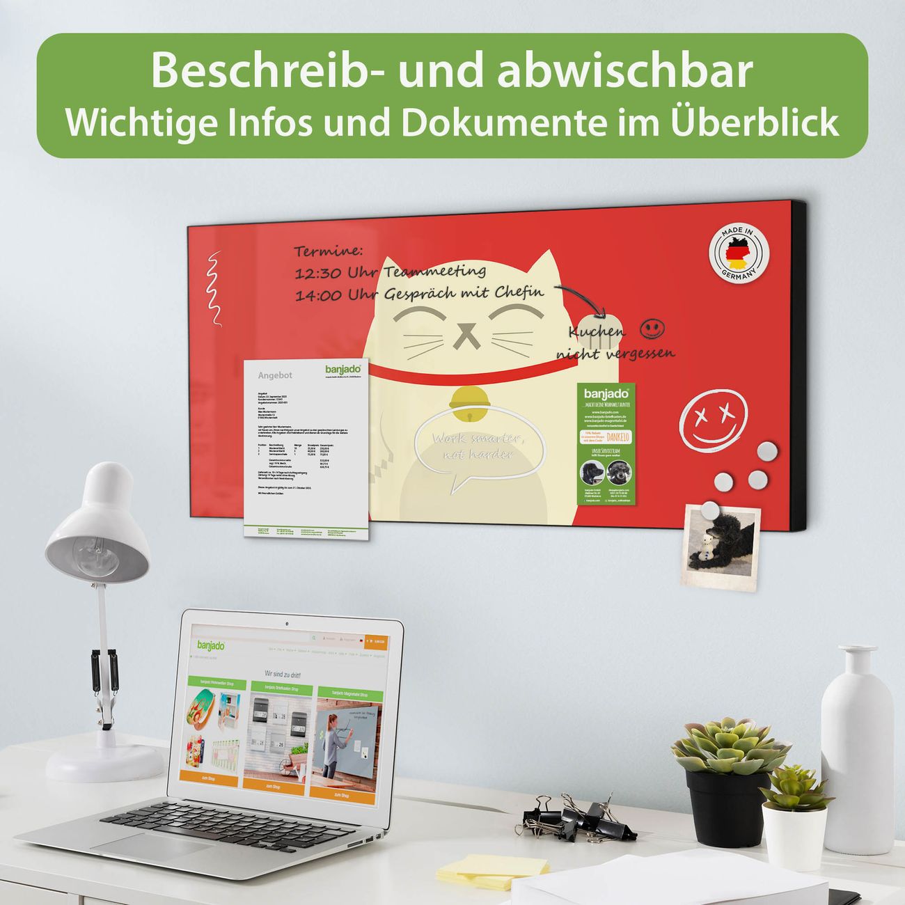 FUNKTION: Die banjado Magnettafel 78x37 cm im Design Motiv Manekineko vereint Funktionalität und modernes Wohndesign auf stilvolle Weise. Diese hochwertige Magnetwand aus Metall hilft Ihnen dabei, Notizen, Fotos, Termine, Einkaufslisten oder Rezepte übersichtlich zu organisieren. Als praktisches Memoboard sorgt sie für Struktur im Alltag und setzt gleichzeitig einen dekorativen Akzent an Ihrer Wand. DESIGN: Die Metalltafel besteht aus robustem, lackiertem Stahl und ist mit allen handelsüblichen Magneten nutzbar. Besonders praktisch ist die beschreibbare Oberfläche. Sie können die Magnettafel ganz einfach mit Kreidestiften beschriften und die Inhalte bei Bedarf mit einem feuchten Tuch wieder entfernen. So eignet sich das Memoboard ideal für Wochenpläne, Menüpläne, To Do Listen oder kreative Botschaften. DETAILS: Mit ihrem großzügigen Querformat von 78x37 cm bietet die Magnettafel ausreichend Platz für Ihre Organisation. Das Motiv Motiv Manekineko bringt eine warme, natürliche Optik in Küche, Flur, Büro oder Homeoffice und wirkt auch ohne Magnete oder Beschriftung wie ein modernes Wandbild. NUTZEN: Auf der Rückseite befinden sich vorgefertigte Löcher für eine schnelle und unkomplizierte Wandmontage. Jede banjado Magnettafel wird in Deutschland gefertigt und steht für Qualität, Langlebigkeit und liebevolle Verarbeitung. Dieses beschreibbare Memoboard ist die perfekte Kombination aus Metalltafel, Designobjekt und praktischer Magnetwand für Ihren Alltag. BANJADO: Wir sind ein kleines Team aus dem Herzen von Sachsen. Wir fertigen alle Artikel von Hand für Sie an, Sie erhalten keine preiswerte Importware. Auf Wunsch können Sie auch Ihr eigenes Foto auf die Magnettafel aufbringen, schreiben Sie uns an. Herzlichst, Ihr banjado-Team