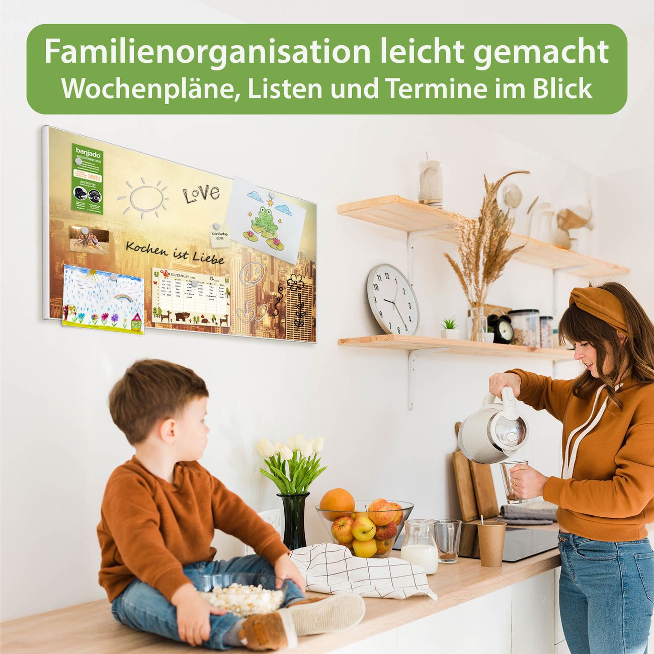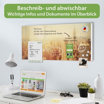 FUNKTION: Die banjado Magnettafel 78x37 cm im Design Motiv Manhattan 2 vereint Funktionalität und modernes Wohndesign auf stilvolle Weise. Diese hochwertige Magnetwand aus Metall hilft Ihnen dabei, Notizen, Fotos, Termine, Einkaufslisten oder Rezepte übersichtlich zu organisieren. Als praktisches Memoboard sorgt sie für Struktur im Alltag und setzt gleichzeitig einen dekorativen Akzent an Ihrer Wand. DESIGN: Die Metalltafel besteht aus robustem, lackiertem Stahl und ist mit allen handelsüblichen Magneten nutzbar. Besonders praktisch ist die beschreibbare Oberfläche. Sie können die Magnettafel ganz einfach mit Kreidestiften beschriften und die Inhalte bei Bedarf mit einem feuchten Tuch wieder entfernen. So eignet sich das Memoboard ideal für Wochenpläne, Menüpläne, To Do Listen oder kreative Botschaften. DETAILS: Mit ihrem großzügigen Querformat von 78x37 cm bietet die Magnettafel ausreichend Platz für Ihre Organisation. Das Motiv Motiv Manhattan 2 bringt eine warme, natürliche Optik in Küche, Flur, Büro oder Homeoffice und wirkt auch ohne Magnete oder Beschriftung wie ein modernes Wandbild. NUTZEN: Auf der Rückseite befinden sich vorgefertigte Löcher für eine schnelle und unkomplizierte Wandmontage. Jede banjado Magnettafel wird in Deutschland gefertigt und steht für Qualität, Langlebigkeit und liebevolle Verarbeitung. Dieses beschreibbare Memoboard ist die perfekte Kombination aus Metalltafel, Designobjekt und praktischer Magnetwand für Ihren Alltag. BANJADO: Wir sind ein kleines Team aus dem Herzen von Sachsen. Wir fertigen alle Artikel von Hand für Sie an, Sie erhalten keine preiswerte Importware. Auf Wunsch können Sie auch Ihr eigenes Foto auf die Magnettafel aufbringen, schreiben Sie uns an. Herzlichst, Ihr banjado-Team