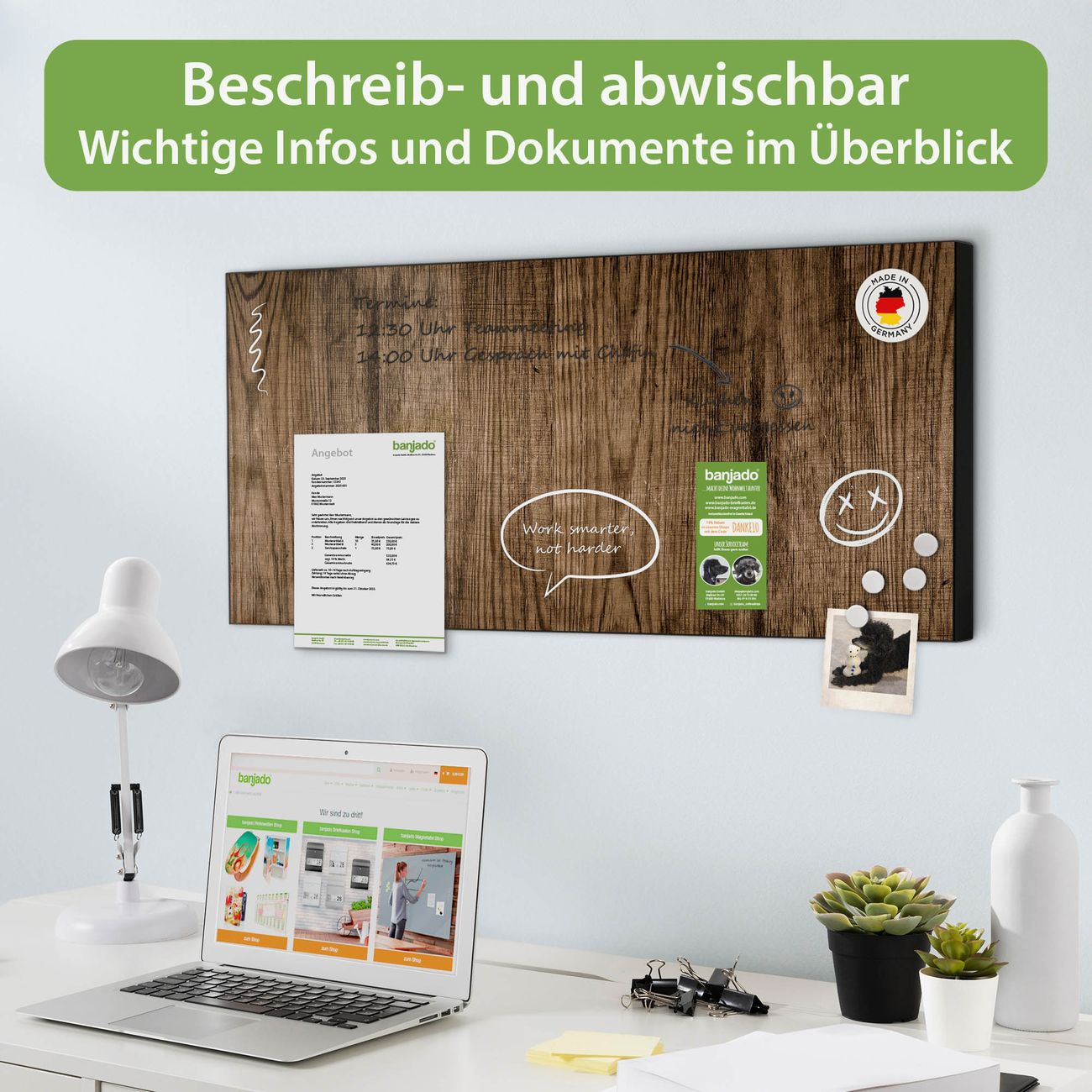 FUNKTION: Die banjado Magnettafel 78x37 cm im Design Motiv Maserung Dunkel vereint Funktionalität und modernes Wohndesign auf stilvolle Weise. Diese hochwertige Magnetwand aus Metall hilft Ihnen dabei, Notizen, Fotos, Termine, Einkaufslisten oder Rezepte übersichtlich zu organisieren. Als praktisches Memoboard sorgt sie für Struktur im Alltag und setzt gleichzeitig einen dekorativen Akzent an Ihrer Wand. DESIGN: Die Metalltafel besteht aus robustem, lackiertem Stahl und ist mit allen handelsüblichen Magneten nutzbar. Besonders praktisch ist die beschreibbare Oberfläche. Sie können die Magnettafel ganz einfach mit Kreidestiften beschriften und die Inhalte bei Bedarf mit einem feuchten Tuch wieder entfernen. So eignet sich das Memoboard ideal für Wochenpläne, Menüpläne, To Do Listen oder kreative Botschaften. DETAILS: Mit ihrem großzügigen Querformat von 78x37 cm bietet die Magnettafel ausreichend Platz für Ihre Organisation. Das Motiv Motiv Maserung Dunkel bringt eine warme, natürliche Optik in Küche, Flur, Büro oder Homeoffice und wirkt auch ohne Magnete oder Beschriftung wie ein modernes Wandbild. NUTZEN: Auf der Rückseite befinden sich vorgefertigte Löcher für eine schnelle und unkomplizierte Wandmontage. Jede banjado Magnettafel wird in Deutschland gefertigt und steht für Qualität, Langlebigkeit und liebevolle Verarbeitung. Dieses beschreibbare Memoboard ist die perfekte Kombination aus Metalltafel, Designobjekt und praktischer Magnetwand für Ihren Alltag. BANJADO: Wir sind ein kleines Team aus dem Herzen von Sachsen. Wir fertigen alle Artikel von Hand für Sie an, Sie erhalten keine preiswerte Importware. Auf Wunsch können Sie auch Ihr eigenes Foto auf die Magnettafel aufbringen, schreiben Sie uns an. Herzlichst, Ihr banjado-Team