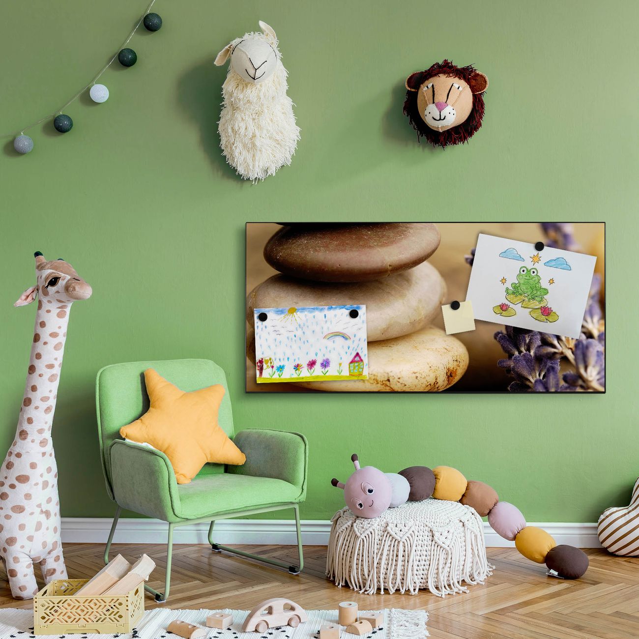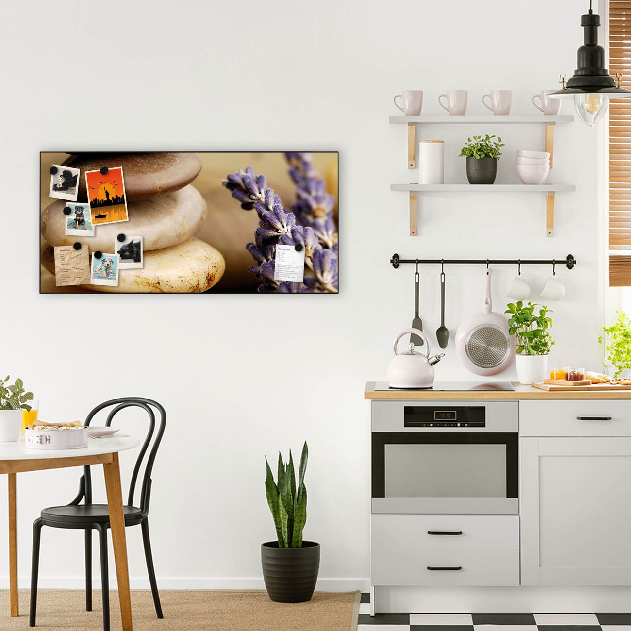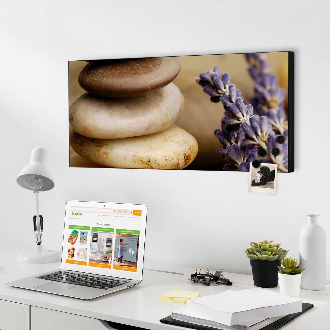 FUNKTION:  Die banjado Magnettafel mit Motiv Meditation Motiv bringt Ordnung in Ihr Zettelchaos. Fotos, Termine, Notizen oder Rezepte lassen Sich hier stilvoll mit Magneten ordnen, Sie behalten alles im Blick. An der Design Magnetwand halten alle handesüblichen Magnete. DESIGN:  Die Metall Pinnwand mit dem Motiv Motiv Meditation ist ein eleganter Begleiter im Alltag. Mit dieser Magnettafel haben Sie auch ohne Notizen und Magnete ein schönes Dekoelement. Das Format bietet Ihnen ausreichend Platz um alle wichtigen Informationen im Blick zu behalten. DETAILS: Die magnetische Pinnwand besteht aus silber-grau, weiß oder schwarz lackiertem Stahl. Sie hat eine Größe von 78cm x 37cm. Es befinden sich auf der Rückseite vorgefertigte Löcher die eine schnelle und unkomplizierte Anbringung ermöglichen. Das Motiv ist mit einem seidenmatten Laminat versehen und schützt so zusätzlich vor Kratzern. NUTZEN:  Sie können diese Magnettafel wunderbar als Wandbild nutzen, es halten alle handelsüblichen Magneten daran. Das Memoboard ist mit einem feuchten Lappen oder Schwamm abwischbar. Sie finden bei uns eine große Auswahl an passenden Magneten. BANJADO:  Wir sind ein kleines Team aus dem Herzen von Sachsen. Wir fertigen alle Artikel von Hand für Sie an, Sie erhalten keine preiswerte Importware. Auf Wunsch können Sie auch Ihr eigenes Foto auf die Magnettafel aufbringen, schreiben Sie uns an. Herzlichst, Ihr banjado-Team