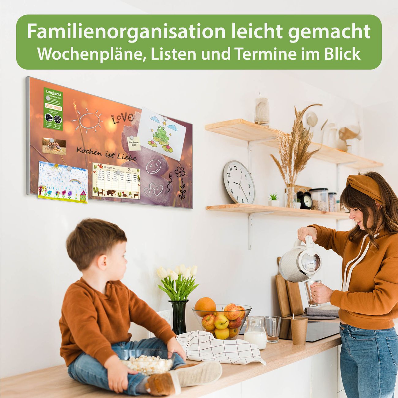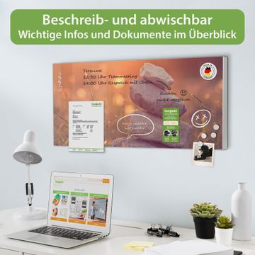 FUNKTION: Die banjado Magnettafel 78x37 cm im Design Motiv Mein Ort vereint Funktionalität und modernes Wohndesign auf stilvolle Weise. Diese hochwertige Magnetwand aus Metall hilft Ihnen dabei, Notizen, Fotos, Termine, Einkaufslisten oder Rezepte übersichtlich zu organisieren. Als praktisches Memoboard sorgt sie für Struktur im Alltag und setzt gleichzeitig einen dekorativen Akzent an Ihrer Wand. DESIGN: Die Metalltafel besteht aus robustem, lackiertem Stahl und ist mit allen handelsüblichen Magneten nutzbar. Besonders praktisch ist die beschreibbare Oberfläche. Sie können die Magnettafel ganz einfach mit Kreidestiften beschriften und die Inhalte bei Bedarf mit einem feuchten Tuch wieder entfernen. So eignet sich das Memoboard ideal für Wochenpläne, Menüpläne, To Do Listen oder kreative Botschaften. DETAILS: Mit ihrem großzügigen Querformat von 78x37 cm bietet die Magnettafel ausreichend Platz für Ihre Organisation. Das Motiv Motiv Mein Ort bringt eine warme, natürliche Optik in Küche, Flur, Büro oder Homeoffice und wirkt auch ohne Magnete oder Beschriftung wie ein modernes Wandbild. NUTZEN: Auf der Rückseite befinden sich vorgefertigte Löcher für eine schnelle und unkomplizierte Wandmontage. Jede banjado Magnettafel wird in Deutschland gefertigt und steht für Qualität, Langlebigkeit und liebevolle Verarbeitung. Dieses beschreibbare Memoboard ist die perfekte Kombination aus Metalltafel, Designobjekt und praktischer Magnetwand für Ihren Alltag. BANJADO: Wir sind ein kleines Team aus dem Herzen von Sachsen. Wir fertigen alle Artikel von Hand für Sie an, Sie erhalten keine preiswerte Importware. Auf Wunsch können Sie auch Ihr eigenes Foto auf die Magnettafel aufbringen, schreiben Sie uns an. Herzlichst, Ihr banjado-Team