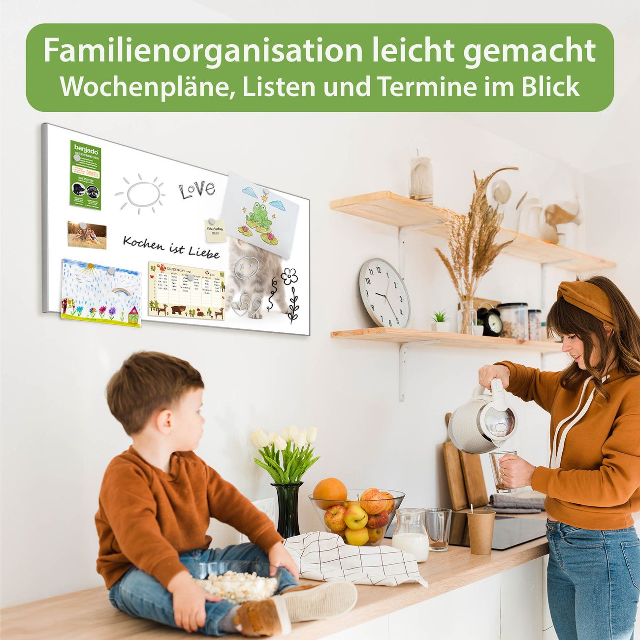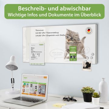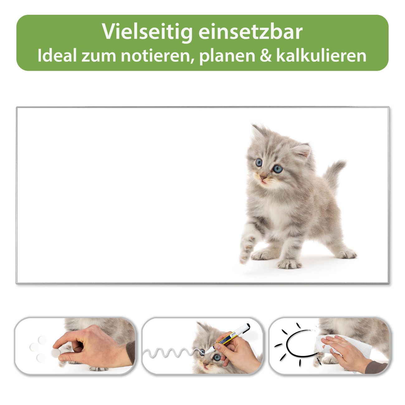 FUNKTION: Die banjado Magnettafel 78x37 cm im Design Motiv Miau vereint Funktionalität und modernes Wohndesign auf stilvolle Weise. Diese hochwertige Magnetwand aus Metall hilft Ihnen dabei, Notizen, Fotos, Termine, Einkaufslisten oder Rezepte übersichtlich zu organisieren. Als praktisches Memoboard sorgt sie für Struktur im Alltag und setzt gleichzeitig einen dekorativen Akzent an Ihrer Wand. DESIGN: Die Metalltafel besteht aus robustem, lackiertem Stahl und ist mit allen handelsüblichen Magneten nutzbar. Besonders praktisch ist die beschreibbare Oberfläche. Sie können die Magnettafel ganz einfach mit Kreidestiften beschriften und die Inhalte bei Bedarf mit einem feuchten Tuch wieder entfernen. So eignet sich das Memoboard ideal für Wochenpläne, Menüpläne, To Do Listen oder kreative Botschaften. DETAILS: Mit ihrem großzügigen Querformat von 78x37 cm bietet die Magnettafel ausreichend Platz für Ihre Organisation. Das Motiv Motiv Miau bringt eine warme, natürliche Optik in Küche, Flur, Büro oder Homeoffice und wirkt auch ohne Magnete oder Beschriftung wie ein modernes Wandbild. NUTZEN: Auf der Rückseite befinden sich vorgefertigte Löcher für eine schnelle und unkomplizierte Wandmontage. Jede banjado Magnettafel wird in Deutschland gefertigt und steht für Qualität, Langlebigkeit und liebevolle Verarbeitung. Dieses beschreibbare Memoboard ist die perfekte Kombination aus Metalltafel, Designobjekt und praktischer Magnetwand für Ihren Alltag. BANJADO: Wir sind ein kleines Team aus dem Herzen von Sachsen. Wir fertigen alle Artikel von Hand für Sie an, Sie erhalten keine preiswerte Importware. Auf Wunsch können Sie auch Ihr eigenes Foto auf die Magnettafel aufbringen, schreiben Sie uns an. Herzlichst, Ihr banjado-Team