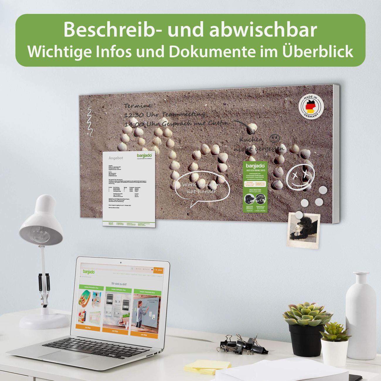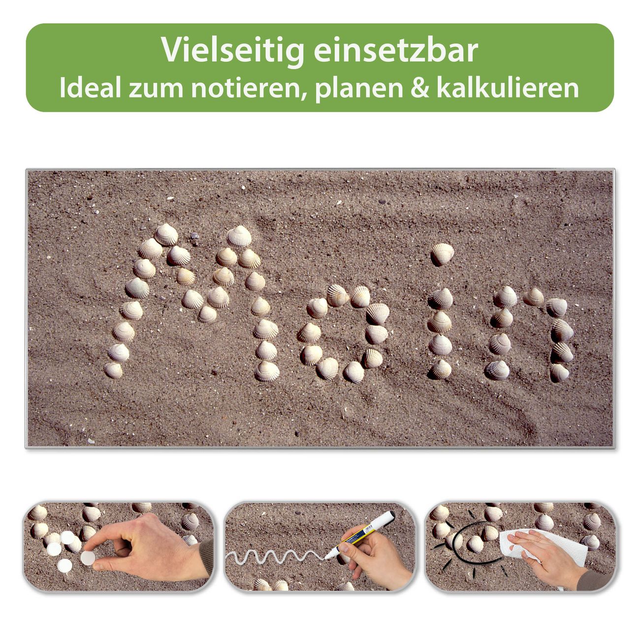 FUNKTION: Die banjado Magnettafel 78x37 cm im Design Motiv Moin Moin vereint Funktionalität und modernes Wohndesign auf stilvolle Weise. Diese hochwertige Magnetwand aus Metall hilft Ihnen dabei, Notizen, Fotos, Termine, Einkaufslisten oder Rezepte übersichtlich zu organisieren. Als praktisches Memoboard sorgt sie für Struktur im Alltag und setzt gleichzeitig einen dekorativen Akzent an Ihrer Wand. DESIGN: Die Metalltafel besteht aus robustem, lackiertem Stahl und ist mit allen handelsüblichen Magneten nutzbar. Besonders praktisch ist die beschreibbare Oberfläche. Sie können die Magnettafel ganz einfach mit Kreidestiften beschriften und die Inhalte bei Bedarf mit einem feuchten Tuch wieder entfernen. So eignet sich das Memoboard ideal für Wochenpläne, Menüpläne, To Do Listen oder kreative Botschaften. DETAILS: Mit ihrem großzügigen Querformat von 78x37 cm bietet die Magnettafel ausreichend Platz für Ihre Organisation. Das Motiv Motiv Moin Moin bringt eine warme, natürliche Optik in Küche, Flur, Büro oder Homeoffice und wirkt auch ohne Magnete oder Beschriftung wie ein modernes Wandbild. NUTZEN: Auf der Rückseite befinden sich vorgefertigte Löcher für eine schnelle und unkomplizierte Wandmontage. Jede banjado Magnettafel wird in Deutschland gefertigt und steht für Qualität, Langlebigkeit und liebevolle Verarbeitung. Dieses beschreibbare Memoboard ist die perfekte Kombination aus Metalltafel, Designobjekt und praktischer Magnetwand für Ihren Alltag. BANJADO: Wir sind ein kleines Team aus dem Herzen von Sachsen. Wir fertigen alle Artikel von Hand für Sie an, Sie erhalten keine preiswerte Importware. Auf Wunsch können Sie auch Ihr eigenes Foto auf die Magnettafel aufbringen, schreiben Sie uns an. Herzlichst, Ihr banjado-Team