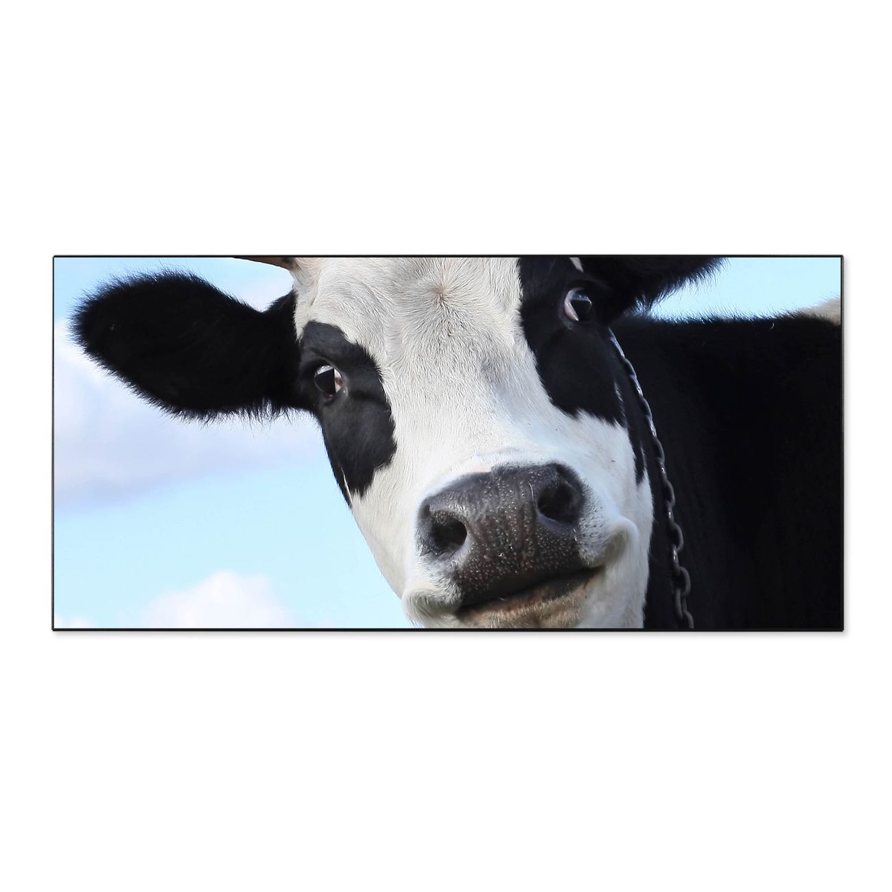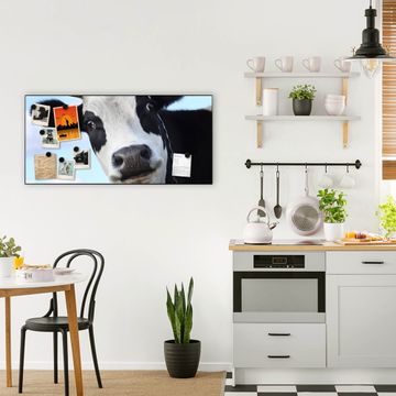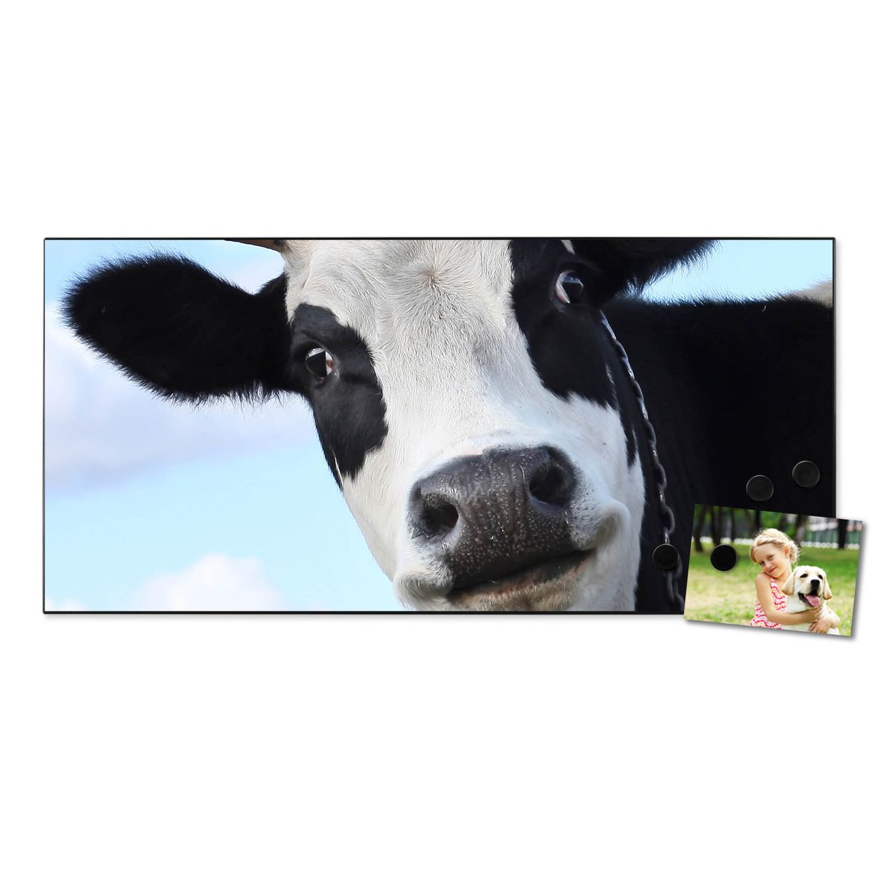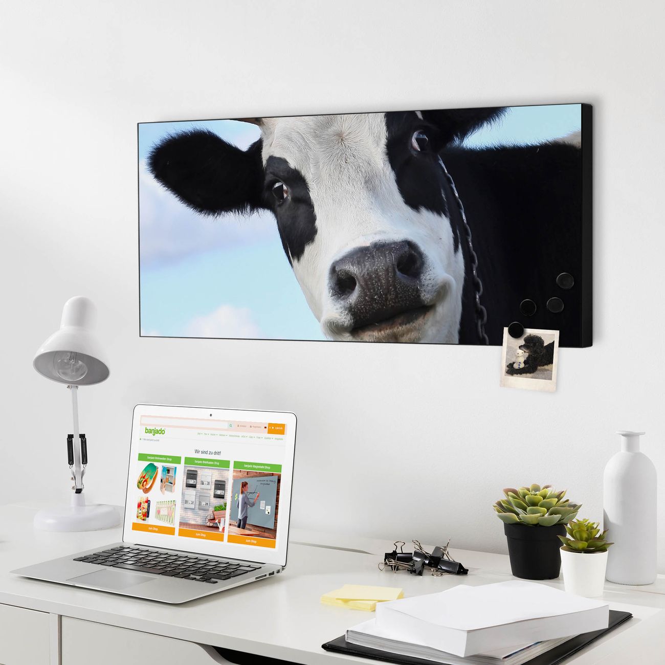 FUNKTION:  Die banjado Magnettafel mit Motiv Muh Motiv bringt Ordnung in Ihr Zettelchaos. Fotos, Termine, Notizen oder Rezepte lassen Sich hier stilvoll mit Magneten ordnen, Sie behalten alles im Blick. An der Design Magnetwand halten alle handesüblichen Magnete. DESIGN:  Die Metall Pinnwand mit dem Motiv Motiv Muh ist ein eleganter Begleiter im Alltag. Mit dieser Magnettafel haben Sie auch ohne Notizen und Magnete ein schönes Dekoelement. Das Format bietet Ihnen ausreichend Platz um alle wichtigen Informationen im Blick zu behalten. DETAILS: Die magnetische Pinnwand besteht aus silber-grau, weiß oder schwarz lackiertem Stahl. Sie hat eine Größe von 78cm x 37cm. Es befinden sich auf der Rückseite vorgefertigte Löcher die eine schnelle und unkomplizierte Anbringung ermöglichen. Das Motiv ist mit einem seidenmatten Laminat versehen und schützt so zusätzlich vor Kratzern. NUTZEN:  Sie können diese Magnettafel wunderbar als Wandbild nutzen, es halten alle handelsüblichen Magneten daran. Das Memoboard ist mit einem feuchten Lappen oder Schwamm abwischbar. Sie finden bei uns eine große Auswahl an passenden Magneten. BANJADO:  Wir sind ein kleines Team aus dem Herzen von Sachsen. Wir fertigen alle Artikel von Hand für Sie an, Sie erhalten keine preiswerte Importware. Auf Wunsch können Sie auch Ihr eigenes Foto auf die Magnettafel aufbringen, schreiben Sie uns an. Herzlichst, Ihr banjado-Team