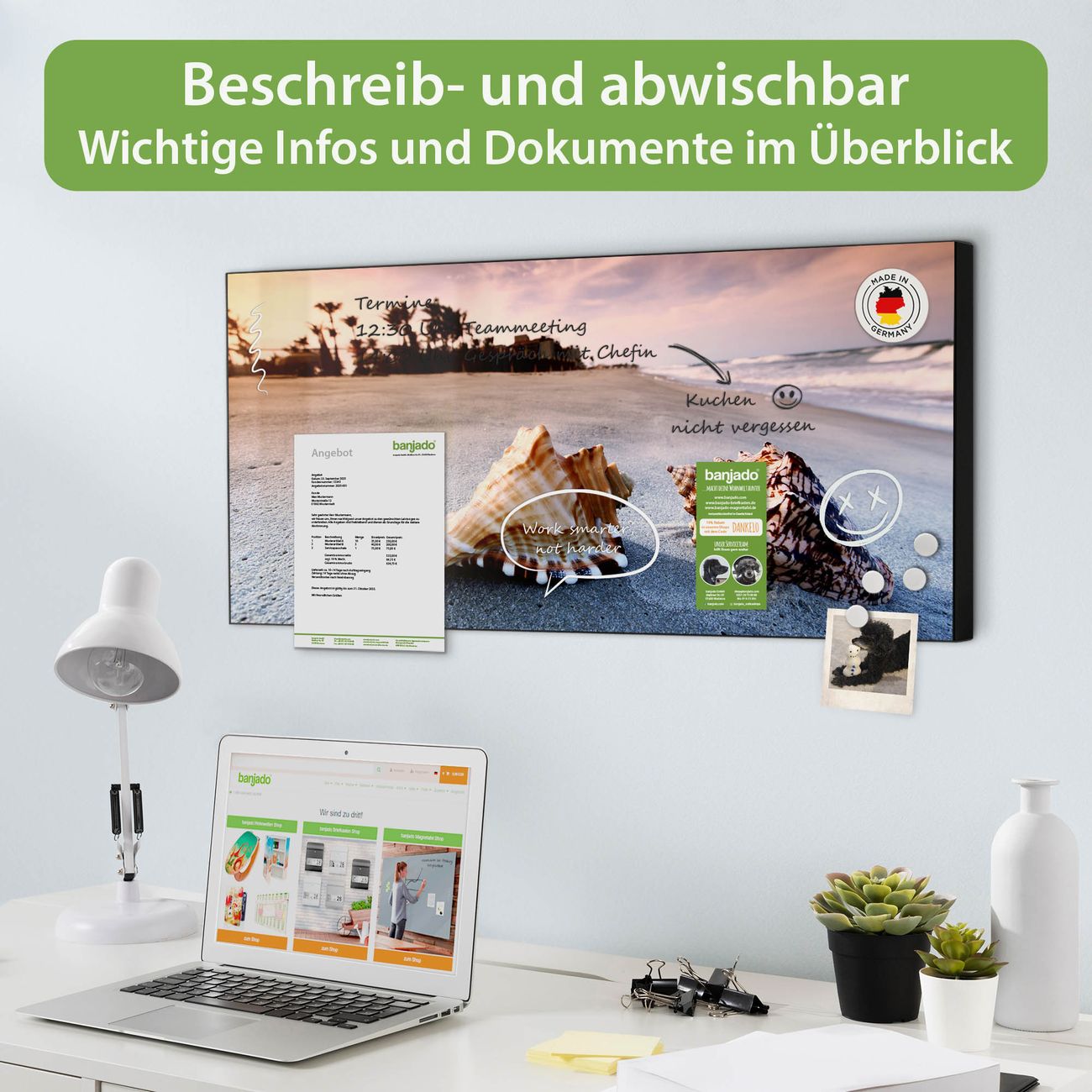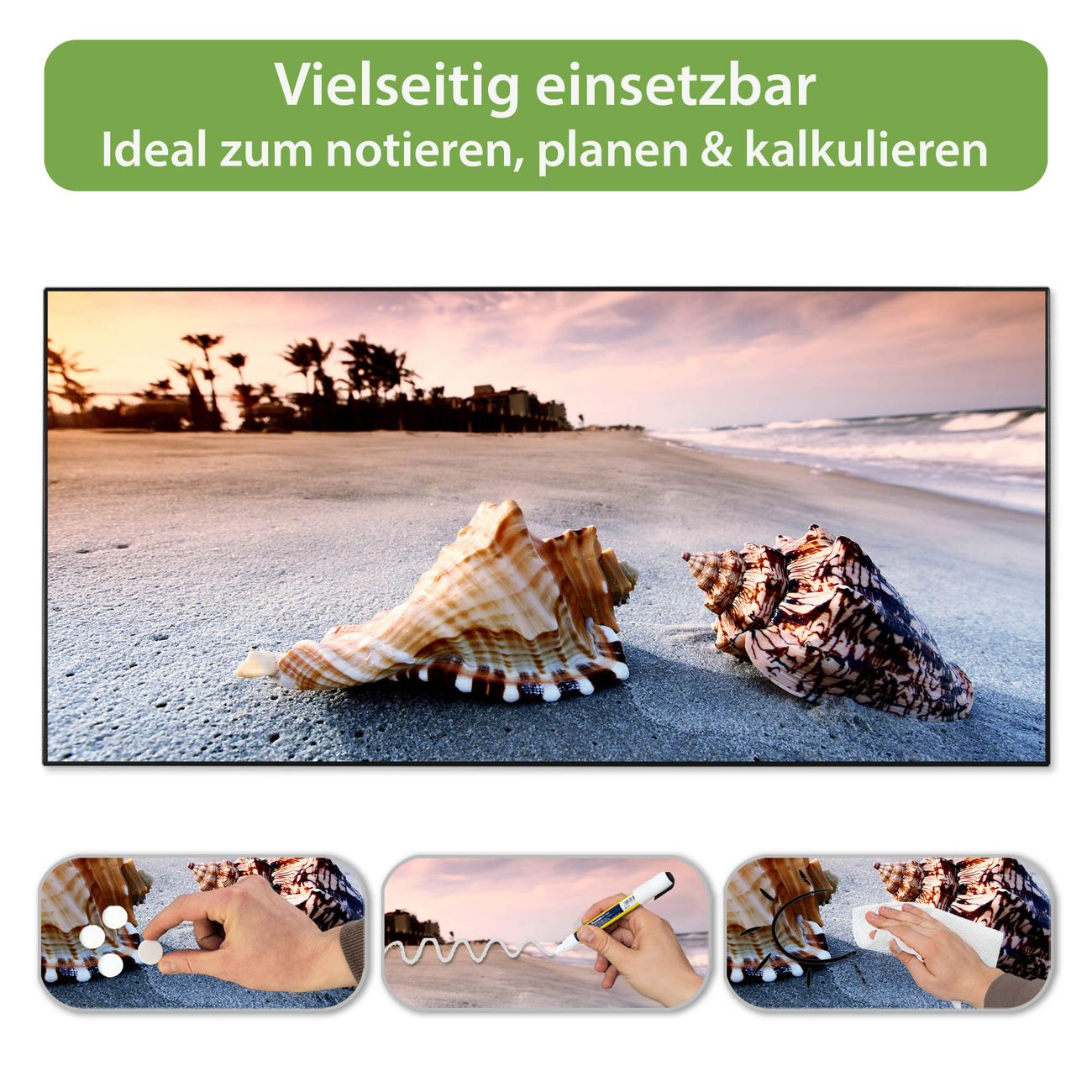 FUNKTION: Die banjado Magnettafel 78x37 cm im Design Motiv Muscheln vereint Funktionalität und modernes Wohndesign auf stilvolle Weise. Diese hochwertige Magnetwand aus Metall hilft Ihnen dabei, Notizen, Fotos, Termine, Einkaufslisten oder Rezepte übersichtlich zu organisieren. Als praktisches Memoboard sorgt sie für Struktur im Alltag und setzt gleichzeitig einen dekorativen Akzent an Ihrer Wand. DESIGN: Die Metalltafel besteht aus robustem, lackiertem Stahl und ist mit allen handelsüblichen Magneten nutzbar. Besonders praktisch ist die beschreibbare Oberfläche. Sie können die Magnettafel ganz einfach mit Kreidestiften beschriften und die Inhalte bei Bedarf mit einem feuchten Tuch wieder entfernen. So eignet sich das Memoboard ideal für Wochenpläne, Menüpläne, To Do Listen oder kreative Botschaften. DETAILS: Mit ihrem großzügigen Querformat von 78x37 cm bietet die Magnettafel ausreichend Platz für Ihre Organisation. Das Motiv Motiv Muscheln bringt eine warme, natürliche Optik in Küche, Flur, Büro oder Homeoffice und wirkt auch ohne Magnete oder Beschriftung wie ein modernes Wandbild. NUTZEN: Auf der Rückseite befinden sich vorgefertigte Löcher für eine schnelle und unkomplizierte Wandmontage. Jede banjado Magnettafel wird in Deutschland gefertigt und steht für Qualität, Langlebigkeit und liebevolle Verarbeitung. Dieses beschreibbare Memoboard ist die perfekte Kombination aus Metalltafel, Designobjekt und praktischer Magnetwand für Ihren Alltag. BANJADO: Wir sind ein kleines Team aus dem Herzen von Sachsen. Wir fertigen alle Artikel von Hand für Sie an, Sie erhalten keine preiswerte Importware. Auf Wunsch können Sie auch Ihr eigenes Foto auf die Magnettafel aufbringen, schreiben Sie uns an. Herzlichst, Ihr banjado-Team