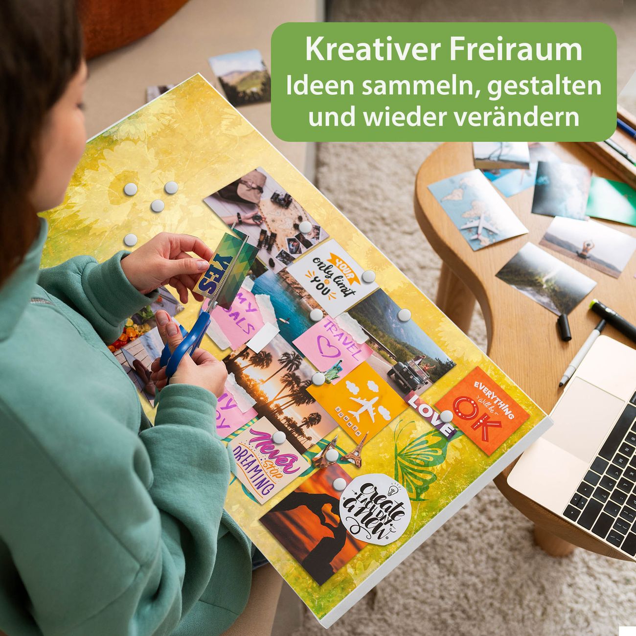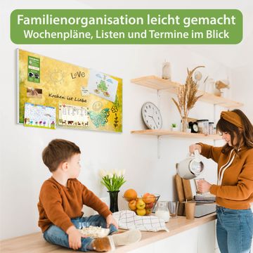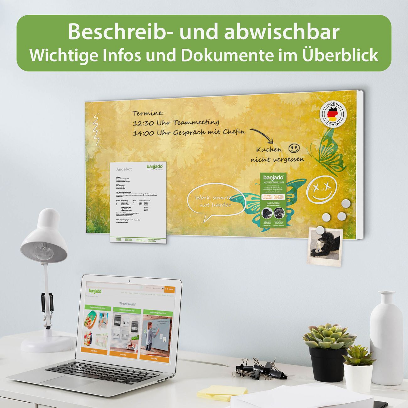 FUNKTION: Die banjado Magnettafel 78x37 cm im Design Motiv Muster Sommer vereint Funktionalität und modernes Wohndesign auf stilvolle Weise. Diese hochwertige Magnetwand aus Metall hilft Ihnen dabei, Notizen, Fotos, Termine, Einkaufslisten oder Rezepte übersichtlich zu organisieren. Als praktisches Memoboard sorgt sie für Struktur im Alltag und setzt gleichzeitig einen dekorativen Akzent an Ihrer Wand. DESIGN: Die Metalltafel besteht aus robustem, lackiertem Stahl und ist mit allen handelsüblichen Magneten nutzbar. Besonders praktisch ist die beschreibbare Oberfläche. Sie können die Magnettafel ganz einfach mit Kreidestiften beschriften und die Inhalte bei Bedarf mit einem feuchten Tuch wieder entfernen. So eignet sich das Memoboard ideal für Wochenpläne, Menüpläne, To Do Listen oder kreative Botschaften. DETAILS: Mit ihrem großzügigen Querformat von 78x37 cm bietet die Magnettafel ausreichend Platz für Ihre Organisation. Das Motiv Motiv Muster Sommer bringt eine warme, natürliche Optik in Küche, Flur, Büro oder Homeoffice und wirkt auch ohne Magnete oder Beschriftung wie ein modernes Wandbild. NUTZEN: Auf der Rückseite befinden sich vorgefertigte Löcher für eine schnelle und unkomplizierte Wandmontage. Jede banjado Magnettafel wird in Deutschland gefertigt und steht für Qualität, Langlebigkeit und liebevolle Verarbeitung. Dieses beschreibbare Memoboard ist die perfekte Kombination aus Metalltafel, Designobjekt und praktischer Magnetwand für Ihren Alltag. BANJADO: Wir sind ein kleines Team aus dem Herzen von Sachsen. Wir fertigen alle Artikel von Hand für Sie an, Sie erhalten keine preiswerte Importware. Auf Wunsch können Sie auch Ihr eigenes Foto auf die Magnettafel aufbringen, schreiben Sie uns an. Herzlichst, Ihr banjado-Team