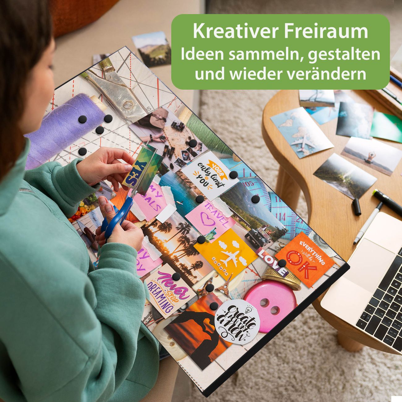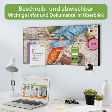 FUNKTION: Die banjado Magnettafel 78x37 cm im Design Motiv Nähen vereint Funktionalität und modernes Wohndesign auf stilvolle Weise. Diese hochwertige Magnetwand aus Metall hilft Ihnen dabei, Notizen, Fotos, Termine, Einkaufslisten oder Rezepte übersichtlich zu organisieren. Als praktisches Memoboard sorgt sie für Struktur im Alltag und setzt gleichzeitig einen dekorativen Akzent an Ihrer Wand. DESIGN: Die Metalltafel besteht aus robustem, lackiertem Stahl und ist mit allen handelsüblichen Magneten nutzbar. Besonders praktisch ist die beschreibbare Oberfläche. Sie können die Magnettafel ganz einfach mit Kreidestiften beschriften und die Inhalte bei Bedarf mit einem feuchten Tuch wieder entfernen. So eignet sich das Memoboard ideal für Wochenpläne, Menüpläne, To Do Listen oder kreative Botschaften. DETAILS: Mit ihrem großzügigen Querformat von 78x37 cm bietet die Magnettafel ausreichend Platz für Ihre Organisation. Das Motiv Motiv Nähen bringt eine warme, natürliche Optik in Küche, Flur, Büro oder Homeoffice und wirkt auch ohne Magnete oder Beschriftung wie ein modernes Wandbild. NUTZEN: Auf der Rückseite befinden sich vorgefertigte Löcher für eine schnelle und unkomplizierte Wandmontage. Jede banjado Magnettafel wird in Deutschland gefertigt und steht für Qualität, Langlebigkeit und liebevolle Verarbeitung. Dieses beschreibbare Memoboard ist die perfekte Kombination aus Metalltafel, Designobjekt und praktischer Magnetwand für Ihren Alltag. BANJADO: Wir sind ein kleines Team aus dem Herzen von Sachsen. Wir fertigen alle Artikel von Hand für Sie an, Sie erhalten keine preiswerte Importware. Auf Wunsch können Sie auch Ihr eigenes Foto auf die Magnettafel aufbringen, schreiben Sie uns an. Herzlichst, Ihr banjado-Team