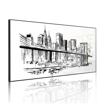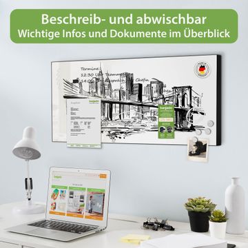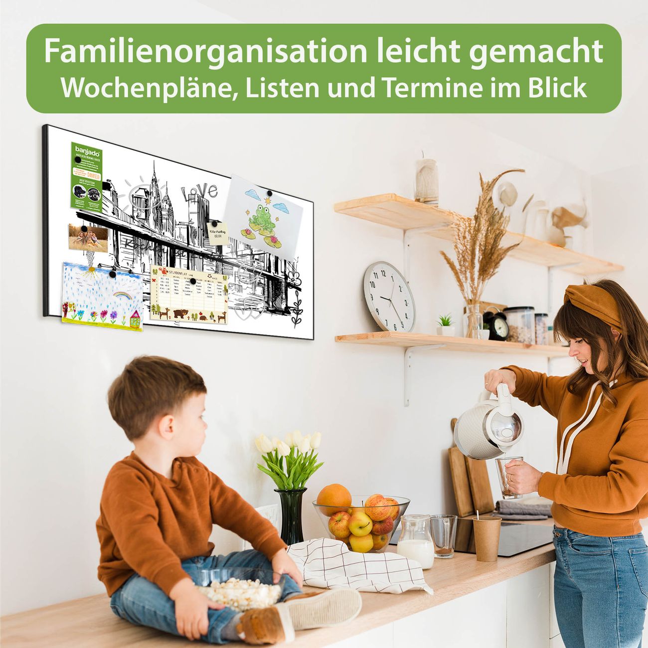 FUNKTION: Die banjado Magnettafel 78x37 cm im Design Motiv New York Skizze vereint Funktionalität und modernes Wohndesign auf stilvolle Weise. Diese hochwertige Magnetwand aus Metall hilft Ihnen dabei, Notizen, Fotos, Termine, Einkaufslisten oder Rezepte übersichtlich zu organisieren. Als praktisches Memoboard sorgt sie für Struktur im Alltag und setzt gleichzeitig einen dekorativen Akzent an Ihrer Wand. DESIGN: Die Metalltafel besteht aus robustem, lackiertem Stahl und ist mit allen handelsüblichen Magneten nutzbar. Besonders praktisch ist die beschreibbare Oberfläche. Sie können die Magnettafel ganz einfach mit Kreidestiften beschriften und die Inhalte bei Bedarf mit einem feuchten Tuch wieder entfernen. So eignet sich das Memoboard ideal für Wochenpläne, Menüpläne, To Do Listen oder kreative Botschaften. DETAILS: Mit ihrem großzügigen Querformat von 78x37 cm bietet die Magnettafel ausreichend Platz für Ihre Organisation. Das Motiv Motiv New York Skizze bringt eine warme, natürliche Optik in Küche, Flur, Büro oder Homeoffice und wirkt auch ohne Magnete oder Beschriftung wie ein modernes Wandbild. NUTZEN: Auf der Rückseite befinden sich vorgefertigte Löcher für eine schnelle und unkomplizierte Wandmontage. Jede banjado Magnettafel wird in Deutschland gefertigt und steht für Qualität, Langlebigkeit und liebevolle Verarbeitung. Dieses beschreibbare Memoboard ist die perfekte Kombination aus Metalltafel, Designobjekt und praktischer Magnetwand für Ihren Alltag. BANJADO: Wir sind ein kleines Team aus dem Herzen von Sachsen. Wir fertigen alle Artikel von Hand für Sie an, Sie erhalten keine preiswerte Importware. Auf Wunsch können Sie auch Ihr eigenes Foto auf die Magnettafel aufbringen, schreiben Sie uns an. Herzlichst, Ihr banjado-Team