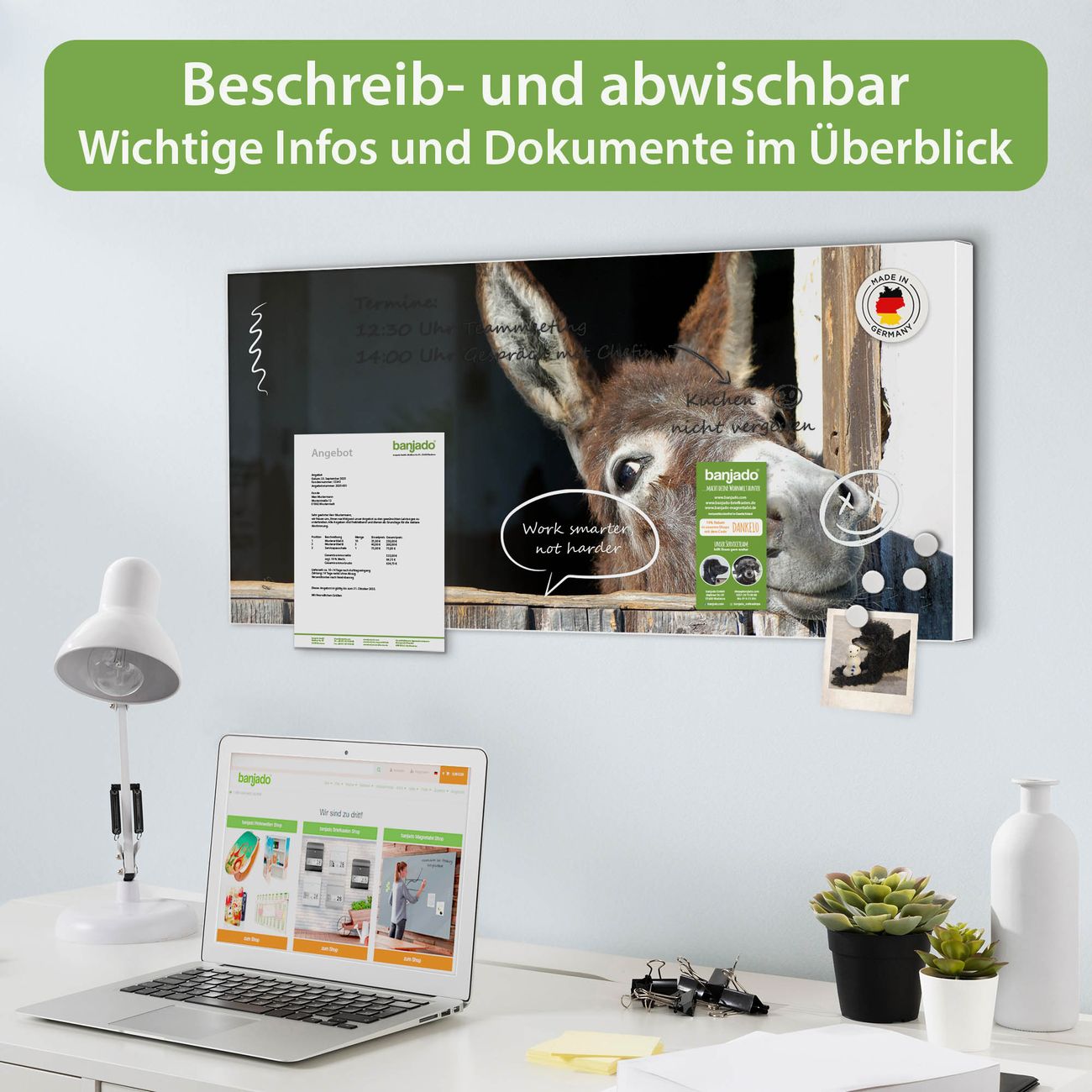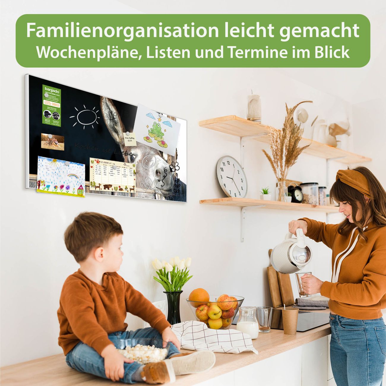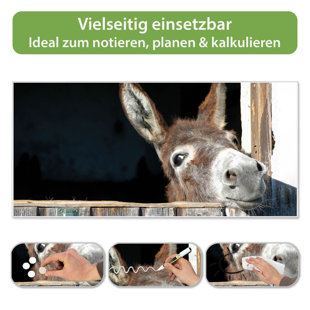 FUNKTION: Die banjado Magnettafel 78x37 cm im Design Motiv Nicki vereint Funktionalität und modernes Wohndesign auf stilvolle Weise. Diese hochwertige Magnetwand aus Metall hilft Ihnen dabei, Notizen, Fotos, Termine, Einkaufslisten oder Rezepte übersichtlich zu organisieren. Als praktisches Memoboard sorgt sie für Struktur im Alltag und setzt gleichzeitig einen dekorativen Akzent an Ihrer Wand. DESIGN: Die Metalltafel besteht aus robustem, lackiertem Stahl und ist mit allen handelsüblichen Magneten nutzbar. Besonders praktisch ist die beschreibbare Oberfläche. Sie können die Magnettafel ganz einfach mit Kreidestiften beschriften und die Inhalte bei Bedarf mit einem feuchten Tuch wieder entfernen. So eignet sich das Memoboard ideal für Wochenpläne, Menüpläne, To Do Listen oder kreative Botschaften. DETAILS: Mit ihrem großzügigen Querformat von 78x37 cm bietet die Magnettafel ausreichend Platz für Ihre Organisation. Das Motiv Motiv Nicki bringt eine warme, natürliche Optik in Küche, Flur, Büro oder Homeoffice und wirkt auch ohne Magnete oder Beschriftung wie ein modernes Wandbild. NUTZEN: Auf der Rückseite befinden sich vorgefertigte Löcher für eine schnelle und unkomplizierte Wandmontage. Jede banjado Magnettafel wird in Deutschland gefertigt und steht für Qualität, Langlebigkeit und liebevolle Verarbeitung. Dieses beschreibbare Memoboard ist die perfekte Kombination aus Metalltafel, Designobjekt und praktischer Magnetwand für Ihren Alltag. BANJADO: Wir sind ein kleines Team aus dem Herzen von Sachsen. Wir fertigen alle Artikel von Hand für Sie an, Sie erhalten keine preiswerte Importware. Auf Wunsch können Sie auch Ihr eigenes Foto auf die Magnettafel aufbringen, schreiben Sie uns an. Herzlichst, Ihr banjado-Team