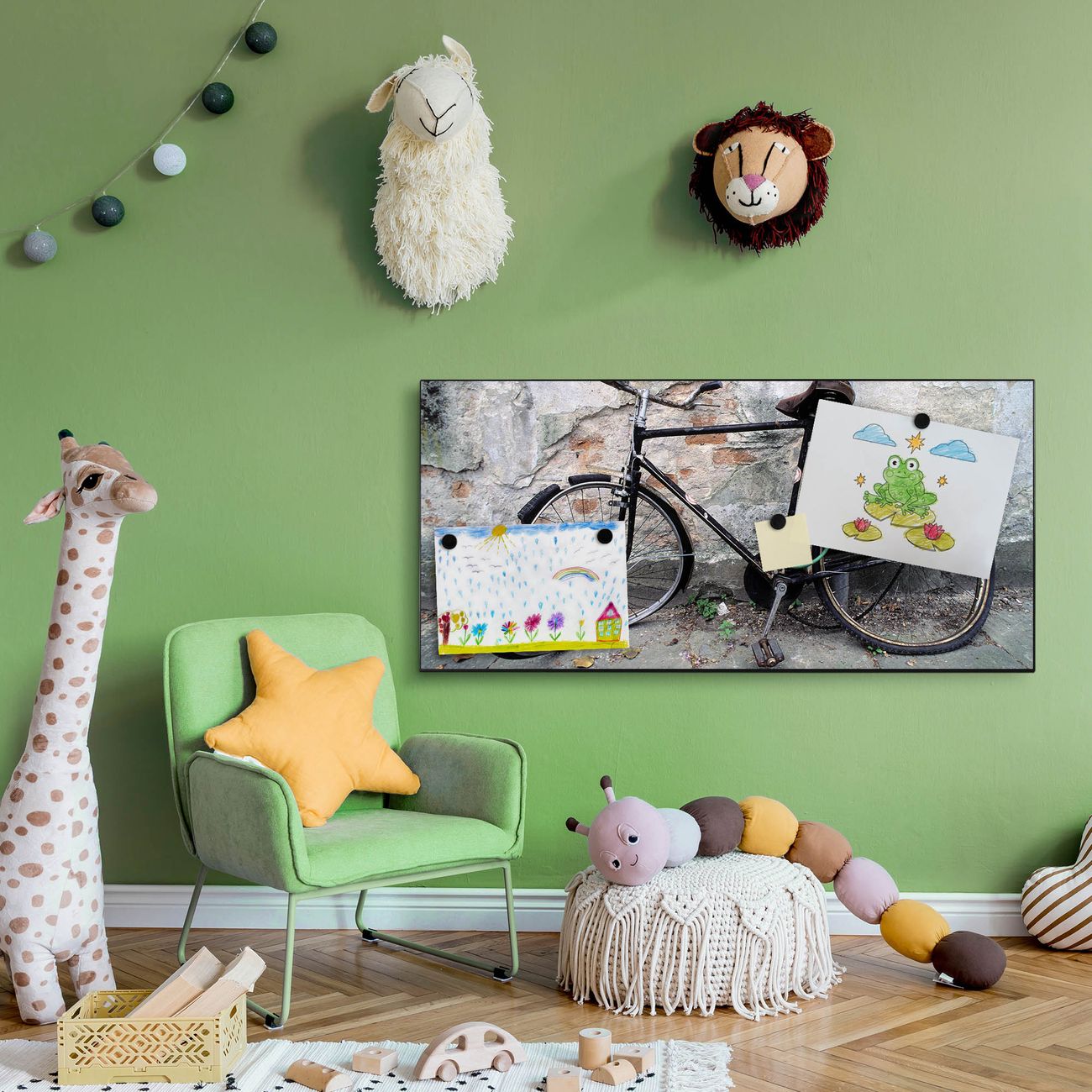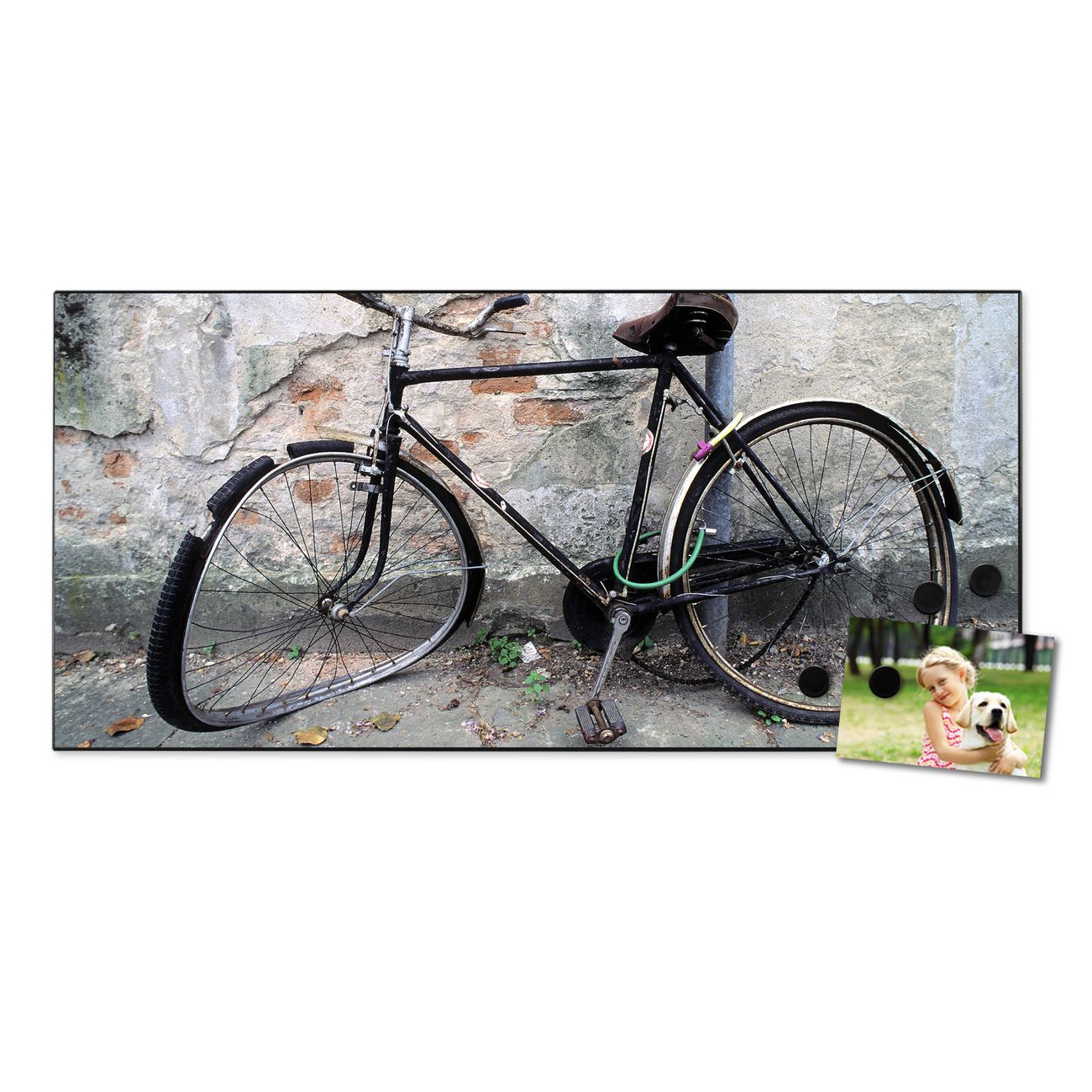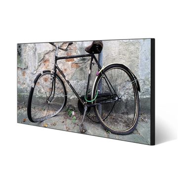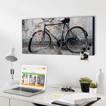 FUNKTION:  Die banjado Magnettafel mit Motiv Nostalgie Rad Motiv bringt Ordnung in Ihr Zettelchaos. Fotos, Termine, Notizen oder Rezepte lassen Sich hier stilvoll mit Magneten ordnen, Sie behalten alles im Blick. An der Design Magnetwand halten alle handesüblichen Magnete. DESIGN:  Die Metall Pinnwand mit dem Motiv Motiv Nostalgie Rad ist ein eleganter Begleiter im Alltag. Mit dieser Magnettafel haben Sie auch ohne Notizen und Magnete ein schönes Dekoelement. Das Format bietet Ihnen ausreichend Platz um alle wichtigen Informationen im Blick zu behalten. DETAILS: Die magnetische Pinnwand besteht aus silber-grau, weiß oder schwarz lackiertem Stahl. Sie hat eine Größe von 78cm x 37cm. Es befinden sich auf der Rückseite vorgefertigte Löcher die eine schnelle und unkomplizierte Anbringung ermöglichen. Das Motiv ist mit einem seidenmatten Laminat versehen und schützt so zusätzlich vor Kratzern. NUTZEN:  Sie können diese Magnettafel wunderbar als Wandbild nutzen, es halten alle handelsüblichen Magneten daran. Das Memoboard ist mit einem feuchten Lappen oder Schwamm abwischbar. Sie finden bei uns eine große Auswahl an passenden Magneten. BANJADO:  Wir sind ein kleines Team aus dem Herzen von Sachsen. Wir fertigen alle Artikel von Hand für Sie an, Sie erhalten keine preiswerte Importware. Auf Wunsch können Sie auch Ihr eigenes Foto auf die Magnettafel aufbringen, schreiben Sie uns an. Herzlichst, Ihr banjado-Team