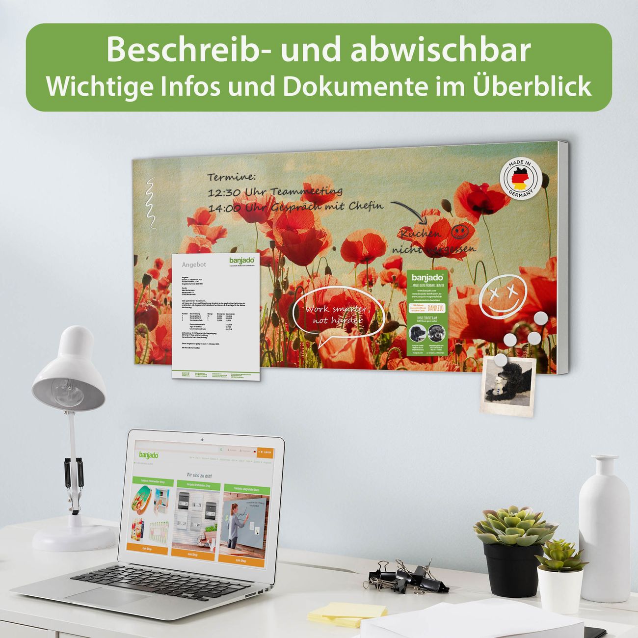 FUNKTION: Die banjado Magnettafel 78x37 cm im Design Motiv Oktobermohn vereint Funktionalität und modernes Wohndesign auf stilvolle Weise. Diese hochwertige Magnetwand aus Metall hilft Ihnen dabei, Notizen, Fotos, Termine, Einkaufslisten oder Rezepte übersichtlich zu organisieren. Als praktisches Memoboard sorgt sie für Struktur im Alltag und setzt gleichzeitig einen dekorativen Akzent an Ihrer Wand. DESIGN: Die Metalltafel besteht aus robustem, lackiertem Stahl und ist mit allen handelsüblichen Magneten nutzbar. Besonders praktisch ist die beschreibbare Oberfläche. Sie können die Magnettafel ganz einfach mit Kreidestiften beschriften und die Inhalte bei Bedarf mit einem feuchten Tuch wieder entfernen. So eignet sich das Memoboard ideal für Wochenpläne, Menüpläne, To Do Listen oder kreative Botschaften. DETAILS: Mit ihrem großzügigen Querformat von 78x37 cm bietet die Magnettafel ausreichend Platz für Ihre Organisation. Das Motiv Motiv Oktobermohn bringt eine warme, natürliche Optik in Küche, Flur, Büro oder Homeoffice und wirkt auch ohne Magnete oder Beschriftung wie ein modernes Wandbild. NUTZEN: Auf der Rückseite befinden sich vorgefertigte Löcher für eine schnelle und unkomplizierte Wandmontage. Jede banjado Magnettafel wird in Deutschland gefertigt und steht für Qualität, Langlebigkeit und liebevolle Verarbeitung. Dieses beschreibbare Memoboard ist die perfekte Kombination aus Metalltafel, Designobjekt und praktischer Magnetwand für Ihren Alltag. BANJADO: Wir sind ein kleines Team aus dem Herzen von Sachsen. Wir fertigen alle Artikel von Hand für Sie an, Sie erhalten keine preiswerte Importware. Auf Wunsch können Sie auch Ihr eigenes Foto auf die Magnettafel aufbringen, schreiben Sie uns an. Herzlichst, Ihr banjado-Team
