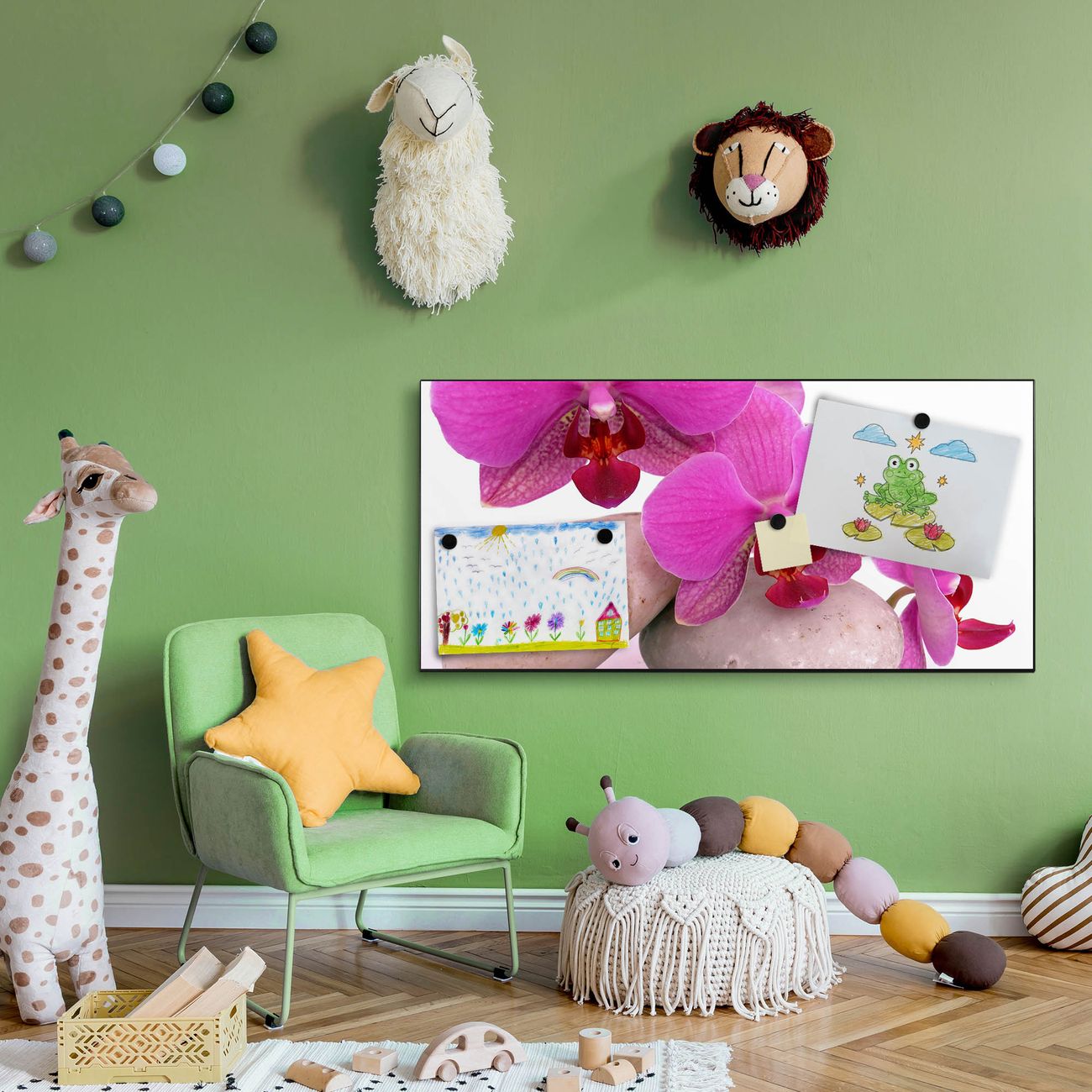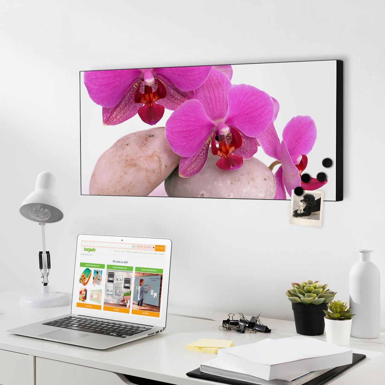 FUNKTION:  Die banjado Magnettafel mit Motiv Orchidee Motiv bringt Ordnung in Ihr Zettelchaos. Fotos, Termine, Notizen oder Rezepte lassen Sich hier stilvoll mit Magneten ordnen, Sie behalten alles im Blick. An der Design Magnetwand halten alle handesüblichen Magnete. DESIGN:  Die Metall Pinnwand mit dem Motiv Motiv Orchidee ist ein eleganter Begleiter im Alltag. Mit dieser Magnettafel haben Sie auch ohne Notizen und Magnete ein schönes Dekoelement. Das Format bietet Ihnen ausreichend Platz um alle wichtigen Informationen im Blick zu behalten. DETAILS: Die magnetische Pinnwand besteht aus silber-grau, weiß oder schwarz lackiertem Stahl. Sie hat eine Größe von 78cm x 37cm. Es befinden sich auf der Rückseite vorgefertigte Löcher die eine schnelle und unkomplizierte Anbringung ermöglichen. Das Motiv ist mit einem seidenmatten Laminat versehen und schützt so zusätzlich vor Kratzern. NUTZEN:  Sie können diese Magnettafel wunderbar als Wandbild nutzen, es halten alle handelsüblichen Magneten daran. Das Memoboard ist mit einem feuchten Lappen oder Schwamm abwischbar. Sie finden bei uns eine große Auswahl an passenden Magneten. BANJADO:  Wir sind ein kleines Team aus dem Herzen von Sachsen. Wir fertigen alle Artikel von Hand für Sie an, Sie erhalten keine preiswerte Importware. Auf Wunsch können Sie auch Ihr eigenes Foto auf die Magnettafel aufbringen, schreiben Sie uns an. Herzlichst, Ihr banjado-Team