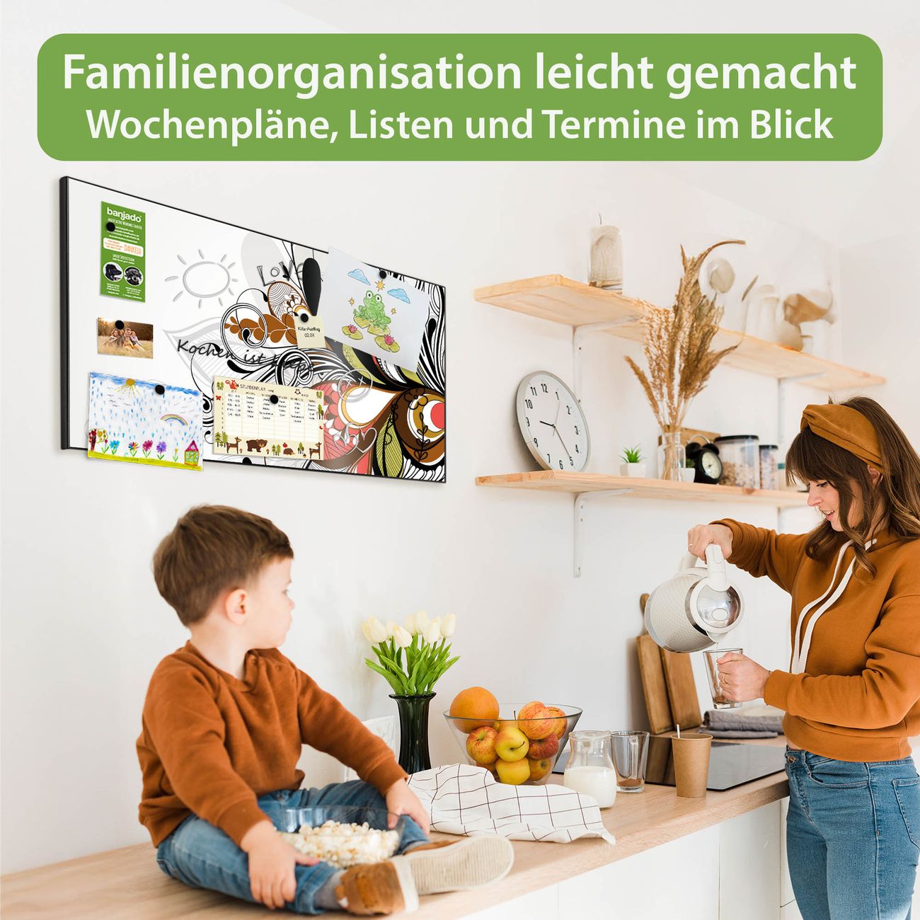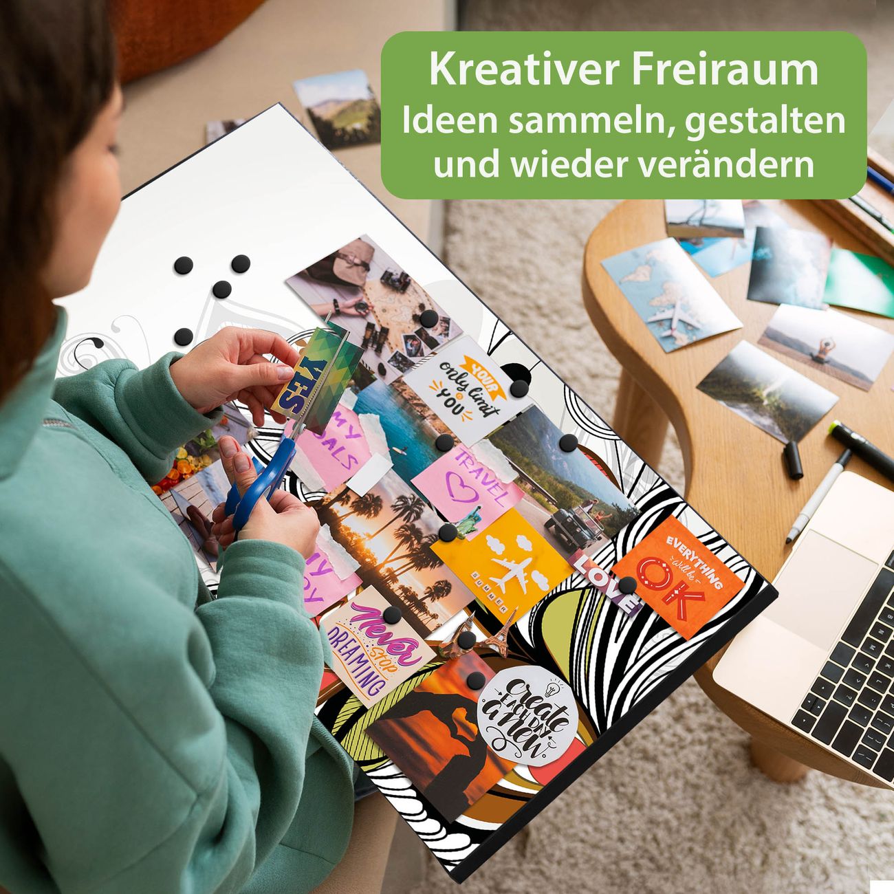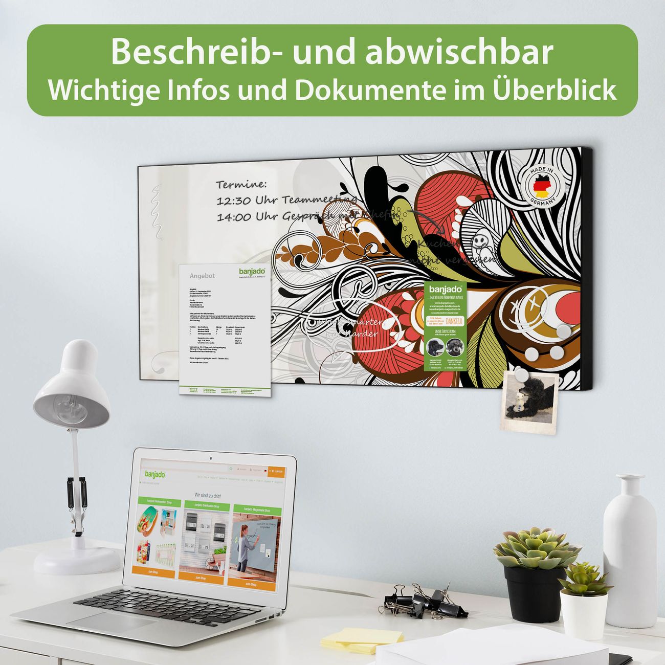 FUNKTION: Die banjado Magnettafel 78x37 cm im Design Motiv Ornament 2 vereint Funktionalität und modernes Wohndesign auf stilvolle Weise. Diese hochwertige Magnetwand aus Metall hilft Ihnen dabei, Notizen, Fotos, Termine, Einkaufslisten oder Rezepte übersichtlich zu organisieren. Als praktisches Memoboard sorgt sie für Struktur im Alltag und setzt gleichzeitig einen dekorativen Akzent an Ihrer Wand. DESIGN: Die Metalltafel besteht aus robustem, lackiertem Stahl und ist mit allen handelsüblichen Magneten nutzbar. Besonders praktisch ist die beschreibbare Oberfläche. Sie können die Magnettafel ganz einfach mit Kreidestiften beschriften und die Inhalte bei Bedarf mit einem feuchten Tuch wieder entfernen. So eignet sich das Memoboard ideal für Wochenpläne, Menüpläne, To Do Listen oder kreative Botschaften. DETAILS: Mit ihrem großzügigen Querformat von 78x37 cm bietet die Magnettafel ausreichend Platz für Ihre Organisation. Das Motiv Motiv Ornament 2 bringt eine warme, natürliche Optik in Küche, Flur, Büro oder Homeoffice und wirkt auch ohne Magnete oder Beschriftung wie ein modernes Wandbild. NUTZEN: Auf der Rückseite befinden sich vorgefertigte Löcher für eine schnelle und unkomplizierte Wandmontage. Jede banjado Magnettafel wird in Deutschland gefertigt und steht für Qualität, Langlebigkeit und liebevolle Verarbeitung. Dieses beschreibbare Memoboard ist die perfekte Kombination aus Metalltafel, Designobjekt und praktischer Magnetwand für Ihren Alltag. BANJADO: Wir sind ein kleines Team aus dem Herzen von Sachsen. Wir fertigen alle Artikel von Hand für Sie an, Sie erhalten keine preiswerte Importware. Auf Wunsch können Sie auch Ihr eigenes Foto auf die Magnettafel aufbringen, schreiben Sie uns an. Herzlichst, Ihr banjado-Team
