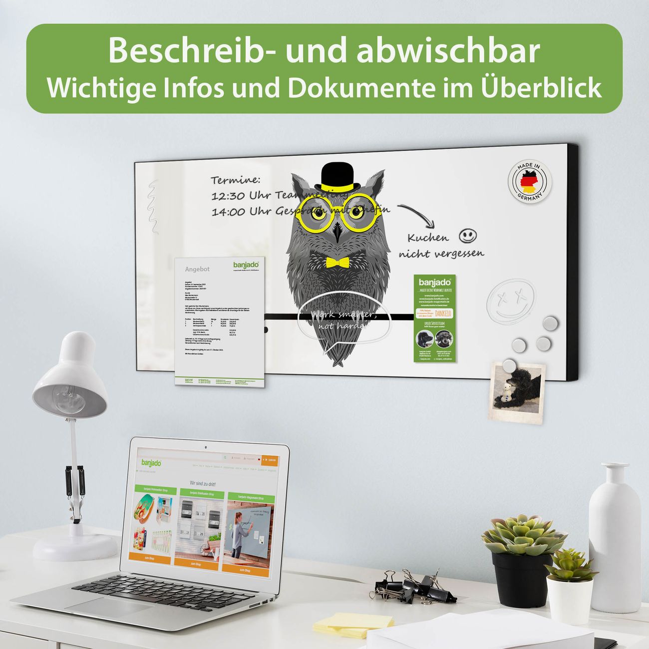 FUNKTION: Die banjado Magnettafel 78x37 cm im Design Motiv Owling vereint Funktionalität und modernes Wohndesign auf stilvolle Weise. Diese hochwertige Magnetwand aus Metall hilft Ihnen dabei, Notizen, Fotos, Termine, Einkaufslisten oder Rezepte übersichtlich zu organisieren. Als praktisches Memoboard sorgt sie für Struktur im Alltag und setzt gleichzeitig einen dekorativen Akzent an Ihrer Wand. DESIGN: Die Metalltafel besteht aus robustem, lackiertem Stahl und ist mit allen handelsüblichen Magneten nutzbar. Besonders praktisch ist die beschreibbare Oberfläche. Sie können die Magnettafel ganz einfach mit Kreidestiften beschriften und die Inhalte bei Bedarf mit einem feuchten Tuch wieder entfernen. So eignet sich das Memoboard ideal für Wochenpläne, Menüpläne, To Do Listen oder kreative Botschaften. DETAILS: Mit ihrem großzügigen Querformat von 78x37 cm bietet die Magnettafel ausreichend Platz für Ihre Organisation. Das Motiv Motiv Owling bringt eine warme, natürliche Optik in Küche, Flur, Büro oder Homeoffice und wirkt auch ohne Magnete oder Beschriftung wie ein modernes Wandbild. NUTZEN: Auf der Rückseite befinden sich vorgefertigte Löcher für eine schnelle und unkomplizierte Wandmontage. Jede banjado Magnettafel wird in Deutschland gefertigt und steht für Qualität, Langlebigkeit und liebevolle Verarbeitung. Dieses beschreibbare Memoboard ist die perfekte Kombination aus Metalltafel, Designobjekt und praktischer Magnetwand für Ihren Alltag. BANJADO: Wir sind ein kleines Team aus dem Herzen von Sachsen. Wir fertigen alle Artikel von Hand für Sie an, Sie erhalten keine preiswerte Importware. Auf Wunsch können Sie auch Ihr eigenes Foto auf die Magnettafel aufbringen, schreiben Sie uns an. Herzlichst, Ihr banjado-Team