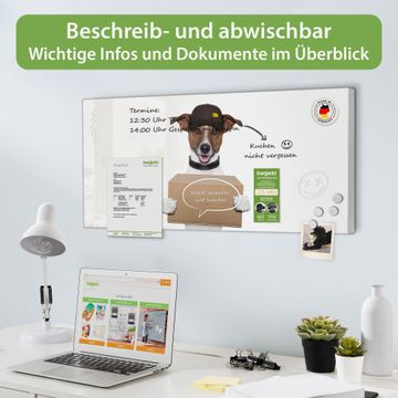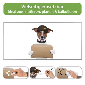 FUNKTION: Die banjado Magnettafel 78x37 cm im Design Motiv Paketdienst Jack Russel vereint Funktionalität und modernes Wohndesign auf stilvolle Weise. Diese hochwertige Magnetwand aus Metall hilft Ihnen dabei, Notizen, Fotos, Termine, Einkaufslisten oder Rezepte übersichtlich zu organisieren. Als praktisches Memoboard sorgt sie für Struktur im Alltag und setzt gleichzeitig einen dekorativen Akzent an Ihrer Wand. DESIGN: Die Metalltafel besteht aus robustem, lackiertem Stahl und ist mit allen handelsüblichen Magneten nutzbar. Besonders praktisch ist die beschreibbare Oberfläche. Sie können die Magnettafel ganz einfach mit Kreidestiften beschriften und die Inhalte bei Bedarf mit einem feuchten Tuch wieder entfernen. So eignet sich das Memoboard ideal für Wochenpläne, Menüpläne, To Do Listen oder kreative Botschaften. DETAILS: Mit ihrem großzügigen Querformat von 78x37 cm bietet die Magnettafel ausreichend Platz für Ihre Organisation. Das Motiv Motiv Paketdienst Jack Russel bringt eine warme, natürliche Optik in Küche, Flur, Büro oder Homeoffice und wirkt auch ohne Magnete oder Beschriftung wie ein modernes Wandbild. NUTZEN: Auf der Rückseite befinden sich vorgefertigte Löcher für eine schnelle und unkomplizierte Wandmontage. Jede banjado Magnettafel wird in Deutschland gefertigt und steht für Qualität, Langlebigkeit und liebevolle Verarbeitung. Dieses beschreibbare Memoboard ist die perfekte Kombination aus Metalltafel, Designobjekt und praktischer Magnetwand für Ihren Alltag. BANJADO: Wir sind ein kleines Team aus dem Herzen von Sachsen. Wir fertigen alle Artikel von Hand für Sie an, Sie erhalten keine preiswerte Importware. Auf Wunsch können Sie auch Ihr eigenes Foto auf die Magnettafel aufbringen, schreiben Sie uns an. Herzlichst, Ihr banjado-Team