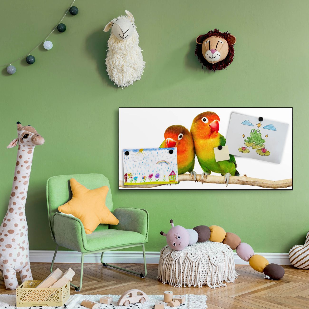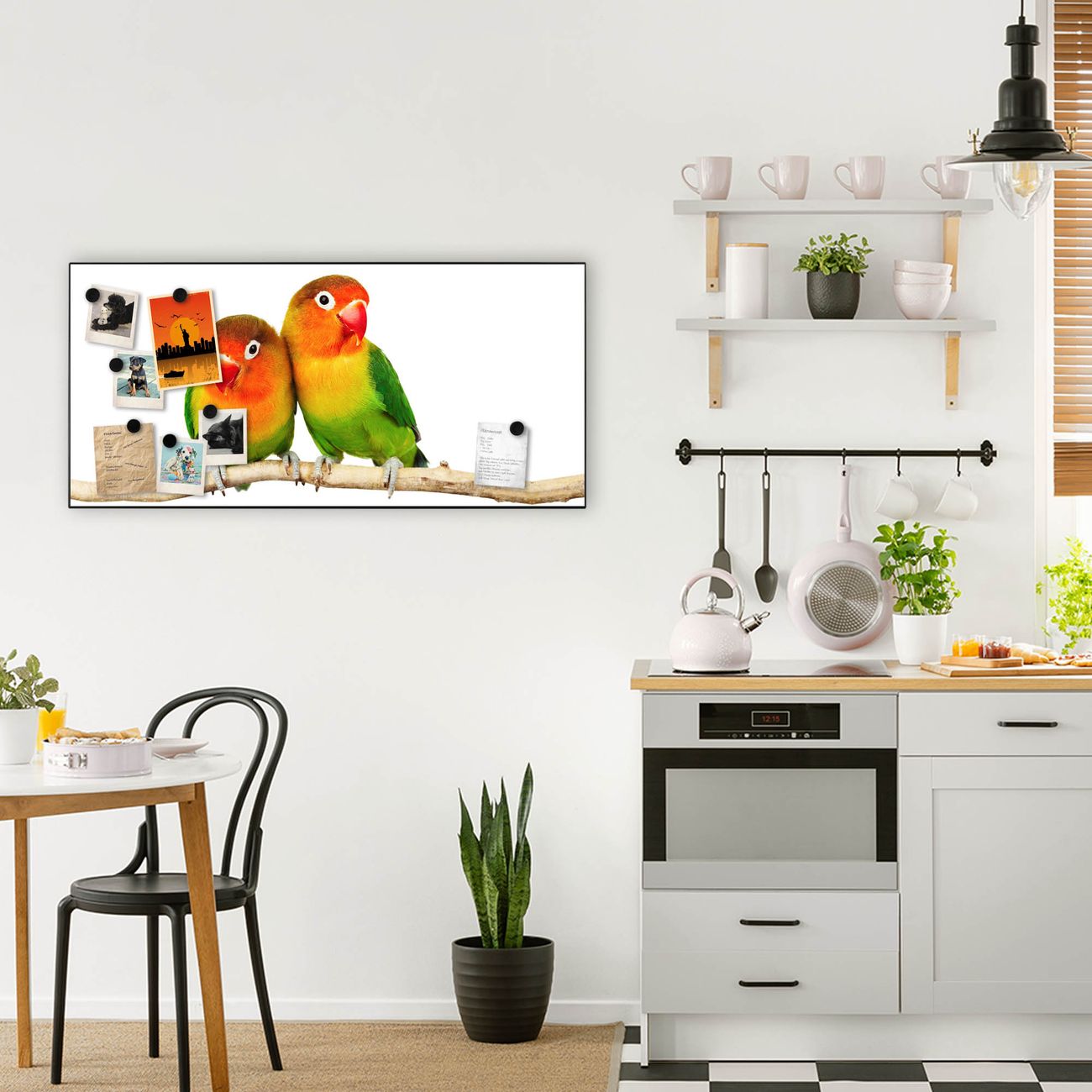 FUNKTION:  Die banjado Magnettafel mit Motiv Papageien Motiv bringt Ordnung in Ihr Zettelchaos. Fotos, Termine, Notizen oder Rezepte lassen Sich hier stilvoll mit Magneten ordnen, Sie behalten alles im Blick. An der Design Magnetwand halten alle handesüblichen Magnete. DESIGN:  Die Metall Pinnwand mit dem Motiv Motiv Papageien ist ein eleganter Begleiter im Alltag. Mit dieser Magnettafel haben Sie auch ohne Notizen und Magnete ein schönes Dekoelement. Das Format bietet Ihnen ausreichend Platz um alle wichtigen Informationen im Blick zu behalten. DETAILS: Die magnetische Pinnwand besteht aus silber-grau, weiß oder schwarz lackiertem Stahl. Sie hat eine Größe von 78cm x 37cm. Es befinden sich auf der Rückseite vorgefertigte Löcher die eine schnelle und unkomplizierte Anbringung ermöglichen. Das Motiv ist mit einem seidenmatten Laminat versehen und schützt so zusätzlich vor Kratzern. NUTZEN:  Sie können diese Magnettafel wunderbar als Wandbild nutzen, es halten alle handelsüblichen Magneten daran. Das Memoboard ist mit einem feuchten Lappen oder Schwamm abwischbar. Sie finden bei uns eine große Auswahl an passenden Magneten. BANJADO:  Wir sind ein kleines Team aus dem Herzen von Sachsen. Wir fertigen alle Artikel von Hand für Sie an, Sie erhalten keine preiswerte Importware. Auf Wunsch können Sie auch Ihr eigenes Foto auf die Magnettafel aufbringen, schreiben Sie uns an. Herzlichst, Ihr banjado-Team