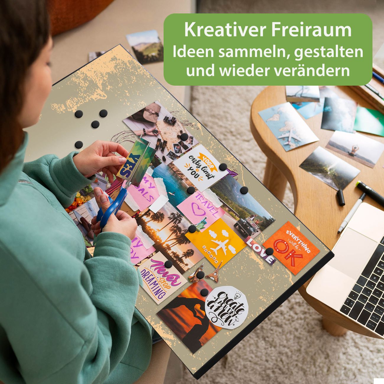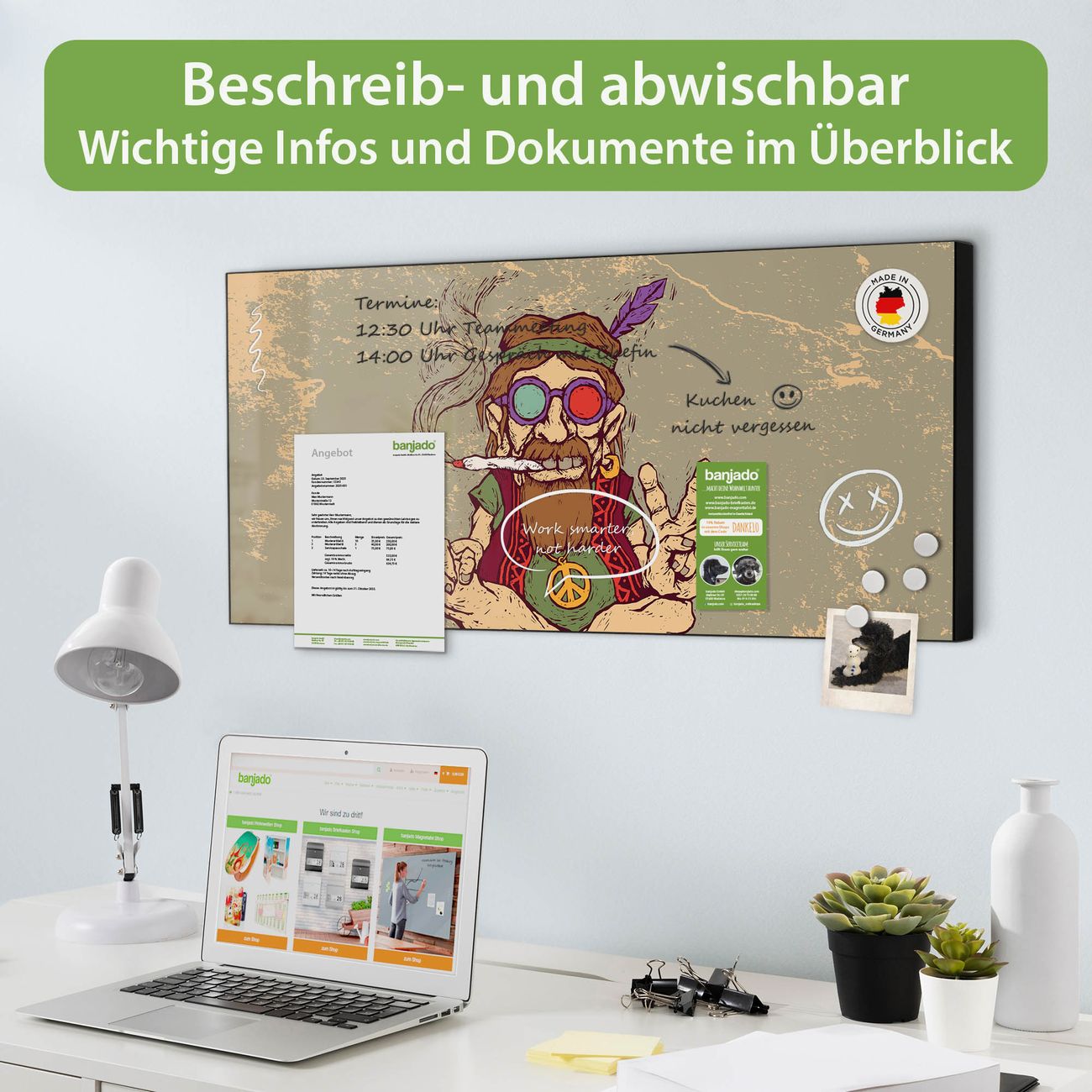 FUNKTION: Die banjado Magnettafel 78x37 cm im Design Motiv Peace vereint Funktionalität und modernes Wohndesign auf stilvolle Weise. Diese hochwertige Magnetwand aus Metall hilft Ihnen dabei, Notizen, Fotos, Termine, Einkaufslisten oder Rezepte übersichtlich zu organisieren. Als praktisches Memoboard sorgt sie für Struktur im Alltag und setzt gleichzeitig einen dekorativen Akzent an Ihrer Wand. DESIGN: Die Metalltafel besteht aus robustem, lackiertem Stahl und ist mit allen handelsüblichen Magneten nutzbar. Besonders praktisch ist die beschreibbare Oberfläche. Sie können die Magnettafel ganz einfach mit Kreidestiften beschriften und die Inhalte bei Bedarf mit einem feuchten Tuch wieder entfernen. So eignet sich das Memoboard ideal für Wochenpläne, Menüpläne, To Do Listen oder kreative Botschaften. DETAILS: Mit ihrem großzügigen Querformat von 78x37 cm bietet die Magnettafel ausreichend Platz für Ihre Organisation. Das Motiv Motiv Peace bringt eine warme, natürliche Optik in Küche, Flur, Büro oder Homeoffice und wirkt auch ohne Magnete oder Beschriftung wie ein modernes Wandbild. NUTZEN: Auf der Rückseite befinden sich vorgefertigte Löcher für eine schnelle und unkomplizierte Wandmontage. Jede banjado Magnettafel wird in Deutschland gefertigt und steht für Qualität, Langlebigkeit und liebevolle Verarbeitung. Dieses beschreibbare Memoboard ist die perfekte Kombination aus Metalltafel, Designobjekt und praktischer Magnetwand für Ihren Alltag. BANJADO: Wir sind ein kleines Team aus dem Herzen von Sachsen. Wir fertigen alle Artikel von Hand für Sie an, Sie erhalten keine preiswerte Importware. Auf Wunsch können Sie auch Ihr eigenes Foto auf die Magnettafel aufbringen, schreiben Sie uns an. Herzlichst, Ihr banjado-Team