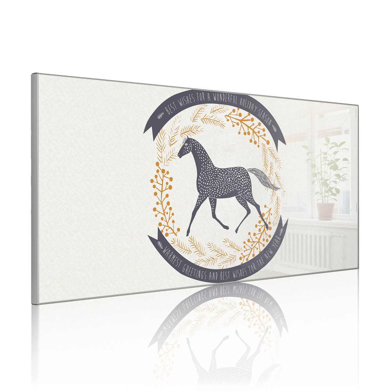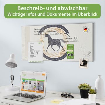 FUNKTION: Die banjado Magnettafel 78x37 cm im Design Motiv Pferd und Vogel vereint Funktionalität und modernes Wohndesign auf stilvolle Weise. Diese hochwertige Magnetwand aus Metall hilft Ihnen dabei, Notizen, Fotos, Termine, Einkaufslisten oder Rezepte übersichtlich zu organisieren. Als praktisches Memoboard sorgt sie für Struktur im Alltag und setzt gleichzeitig einen dekorativen Akzent an Ihrer Wand. DESIGN: Die Metalltafel besteht aus robustem, lackiertem Stahl und ist mit allen handelsüblichen Magneten nutzbar. Besonders praktisch ist die beschreibbare Oberfläche. Sie können die Magnettafel ganz einfach mit Kreidestiften beschriften und die Inhalte bei Bedarf mit einem feuchten Tuch wieder entfernen. So eignet sich das Memoboard ideal für Wochenpläne, Menüpläne, To Do Listen oder kreative Botschaften. DETAILS: Mit ihrem großzügigen Querformat von 78x37 cm bietet die Magnettafel ausreichend Platz für Ihre Organisation. Das Motiv Motiv Pferd und Vogel bringt eine warme, natürliche Optik in Küche, Flur, Büro oder Homeoffice und wirkt auch ohne Magnete oder Beschriftung wie ein modernes Wandbild. NUTZEN: Auf der Rückseite befinden sich vorgefertigte Löcher für eine schnelle und unkomplizierte Wandmontage. Jede banjado Magnettafel wird in Deutschland gefertigt und steht für Qualität, Langlebigkeit und liebevolle Verarbeitung. Dieses beschreibbare Memoboard ist die perfekte Kombination aus Metalltafel, Designobjekt und praktischer Magnetwand für Ihren Alltag. BANJADO: Wir sind ein kleines Team aus dem Herzen von Sachsen. Wir fertigen alle Artikel von Hand für Sie an, Sie erhalten keine preiswerte Importware. Auf Wunsch können Sie auch Ihr eigenes Foto auf die Magnettafel aufbringen, schreiben Sie uns an. Herzlichst, Ihr banjado-Team
