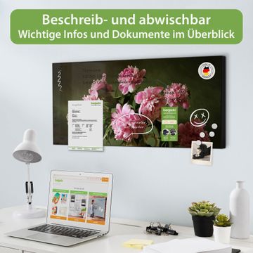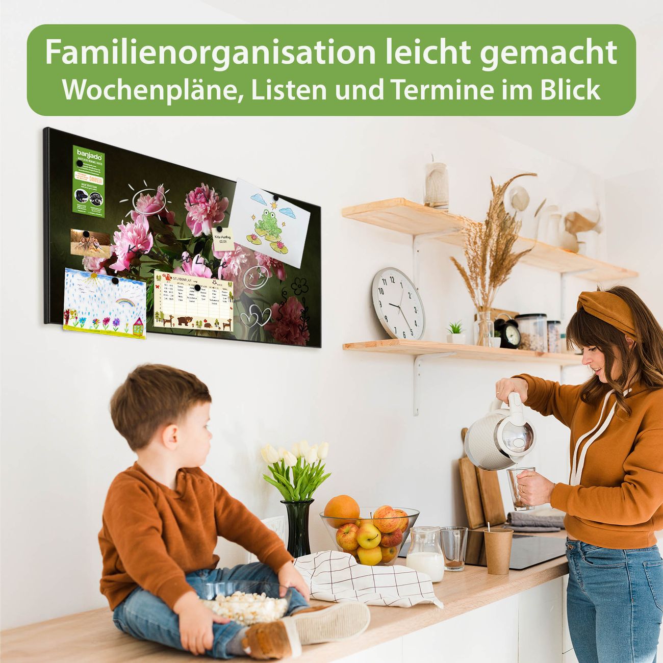 FUNKTION: Die banjado Magnettafel 78x37 cm im Design Motiv Pinke Pfingstrosen vereint Funktionalität und modernes Wohndesign auf stilvolle Weise. Diese hochwertige Magnetwand aus Metall hilft Ihnen dabei, Notizen, Fotos, Termine, Einkaufslisten oder Rezepte übersichtlich zu organisieren. Als praktisches Memoboard sorgt sie für Struktur im Alltag und setzt gleichzeitig einen dekorativen Akzent an Ihrer Wand. DESIGN: Die Metalltafel besteht aus robustem, lackiertem Stahl und ist mit allen handelsüblichen Magneten nutzbar. Besonders praktisch ist die beschreibbare Oberfläche. Sie können die Magnettafel ganz einfach mit Kreidestiften beschriften und die Inhalte bei Bedarf mit einem feuchten Tuch wieder entfernen. So eignet sich das Memoboard ideal für Wochenpläne, Menüpläne, To Do Listen oder kreative Botschaften. DETAILS: Mit ihrem großzügigen Querformat von 78x37 cm bietet die Magnettafel ausreichend Platz für Ihre Organisation. Das Motiv Motiv Pinke Pfingstrosen bringt eine warme, natürliche Optik in Küche, Flur, Büro oder Homeoffice und wirkt auch ohne Magnete oder Beschriftung wie ein modernes Wandbild. NUTZEN: Auf der Rückseite befinden sich vorgefertigte Löcher für eine schnelle und unkomplizierte Wandmontage. Jede banjado Magnettafel wird in Deutschland gefertigt und steht für Qualität, Langlebigkeit und liebevolle Verarbeitung. Dieses beschreibbare Memoboard ist die perfekte Kombination aus Metalltafel, Designobjekt und praktischer Magnetwand für Ihren Alltag. BANJADO: Wir sind ein kleines Team aus dem Herzen von Sachsen. Wir fertigen alle Artikel von Hand für Sie an, Sie erhalten keine preiswerte Importware. Auf Wunsch können Sie auch Ihr eigenes Foto auf die Magnettafel aufbringen, schreiben Sie uns an. Herzlichst, Ihr banjado-Team