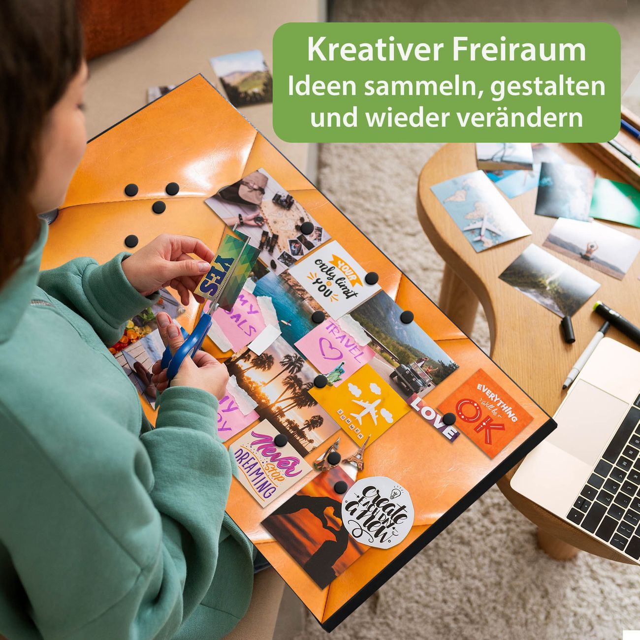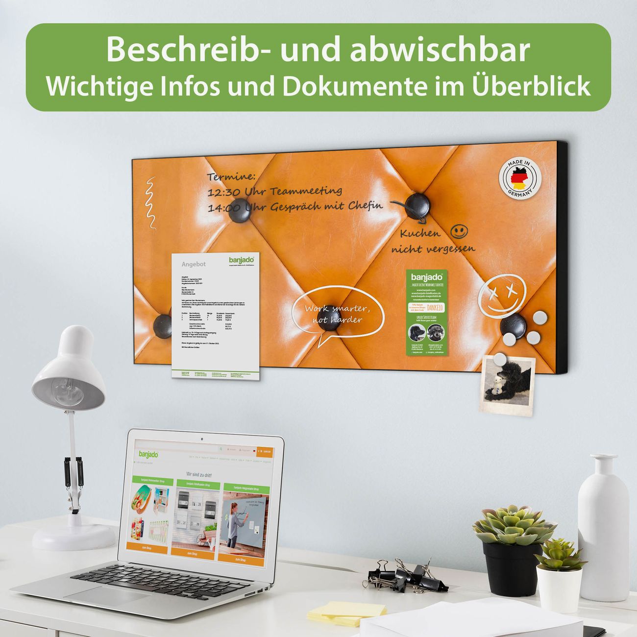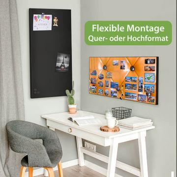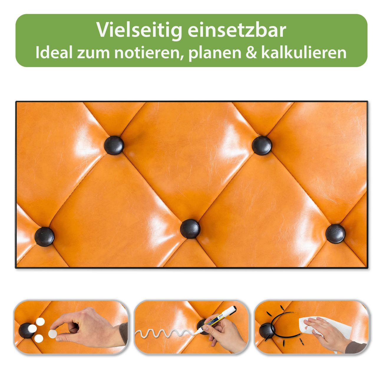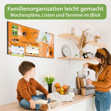FUNKTION: Die banjado Magnettafel 78x37 cm im Design Motiv Polster Orange vereint Funktionalität und modernes Wohndesign auf stilvolle Weise. Diese hochwertige Magnetwand aus Metall hilft Ihnen dabei, Notizen, Fotos, Termine, Einkaufslisten oder Rezepte übersichtlich zu organisieren. Als praktisches Memoboard sorgt sie für Struktur im Alltag und setzt gleichzeitig einen dekorativen Akzent an Ihrer Wand. DESIGN: Die Metalltafel besteht aus robustem, lackiertem Stahl und ist mit allen handelsüblichen Magneten nutzbar. Besonders praktisch ist die beschreibbare Oberfläche. Sie können die Magnettafel ganz einfach mit Kreidestiften beschriften und die Inhalte bei Bedarf mit einem feuchten Tuch wieder entfernen. So eignet sich das Memoboard ideal für Wochenpläne, Menüpläne, To Do Listen oder kreative Botschaften. DETAILS: Mit ihrem großzügigen Querformat von 78x37 cm bietet die Magnettafel ausreichend Platz für Ihre Organisation. Das Motiv Motiv Polster Orange bringt eine warme, natürliche Optik in Küche, Flur, Büro oder Homeoffice und wirkt auch ohne Magnete oder Beschriftung wie ein modernes Wandbild. NUTZEN: Auf der Rückseite befinden sich vorgefertigte Löcher für eine schnelle und unkomplizierte Wandmontage. Jede banjado Magnettafel wird in Deutschland gefertigt und steht für Qualität, Langlebigkeit und liebevolle Verarbeitung. Dieses beschreibbare Memoboard ist die perfekte Kombination aus Metalltafel, Designobjekt und praktischer Magnetwand für Ihren Alltag. BANJADO: Wir sind ein kleines Team aus dem Herzen von Sachsen. Wir fertigen alle Artikel von Hand für Sie an, Sie erhalten keine preiswerte Importware. Auf Wunsch können Sie auch Ihr eigenes Foto auf die Magnettafel aufbringen, schreiben Sie uns an. Herzlichst, Ihr banjado-Team