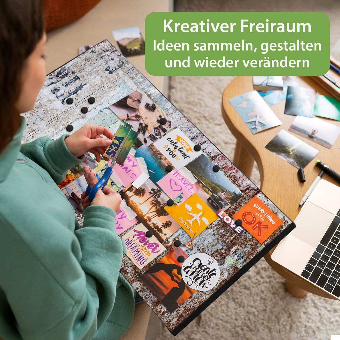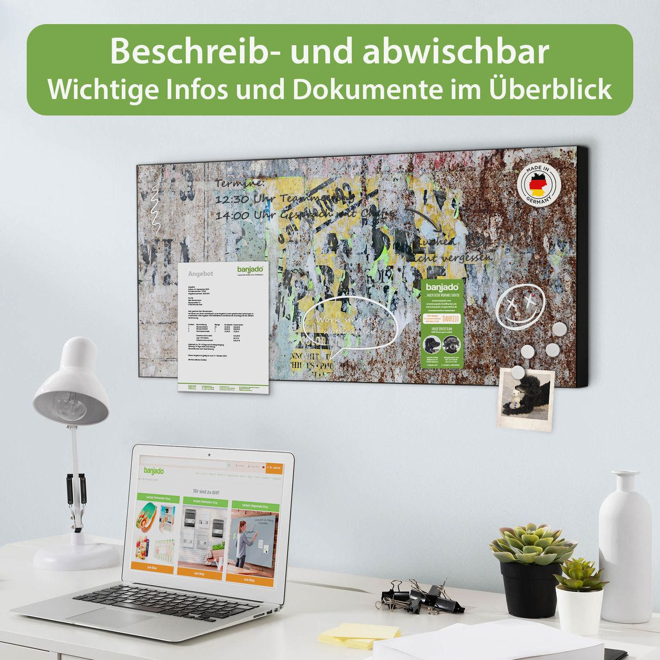 FUNKTION: Die banjado Magnettafel 78x37 cm im Design Motiv Posterwand vereint Funktionalität und modernes Wohndesign auf stilvolle Weise. Diese hochwertige Magnetwand aus Metall hilft Ihnen dabei, Notizen, Fotos, Termine, Einkaufslisten oder Rezepte übersichtlich zu organisieren. Als praktisches Memoboard sorgt sie für Struktur im Alltag und setzt gleichzeitig einen dekorativen Akzent an Ihrer Wand. DESIGN: Die Metalltafel besteht aus robustem, lackiertem Stahl und ist mit allen handelsüblichen Magneten nutzbar. Besonders praktisch ist die beschreibbare Oberfläche. Sie können die Magnettafel ganz einfach mit Kreidestiften beschriften und die Inhalte bei Bedarf mit einem feuchten Tuch wieder entfernen. So eignet sich das Memoboard ideal für Wochenpläne, Menüpläne, To Do Listen oder kreative Botschaften. DETAILS: Mit ihrem großzügigen Querformat von 78x37 cm bietet die Magnettafel ausreichend Platz für Ihre Organisation. Das Motiv Motiv Posterwand bringt eine warme, natürliche Optik in Küche, Flur, Büro oder Homeoffice und wirkt auch ohne Magnete oder Beschriftung wie ein modernes Wandbild. NUTZEN: Auf der Rückseite befinden sich vorgefertigte Löcher für eine schnelle und unkomplizierte Wandmontage. Jede banjado Magnettafel wird in Deutschland gefertigt und steht für Qualität, Langlebigkeit und liebevolle Verarbeitung. Dieses beschreibbare Memoboard ist die perfekte Kombination aus Metalltafel, Designobjekt und praktischer Magnetwand für Ihren Alltag. BANJADO: Wir sind ein kleines Team aus dem Herzen von Sachsen. Wir fertigen alle Artikel von Hand für Sie an, Sie erhalten keine preiswerte Importware. Auf Wunsch können Sie auch Ihr eigenes Foto auf die Magnettafel aufbringen, schreiben Sie uns an. Herzlichst, Ihr banjado-Team