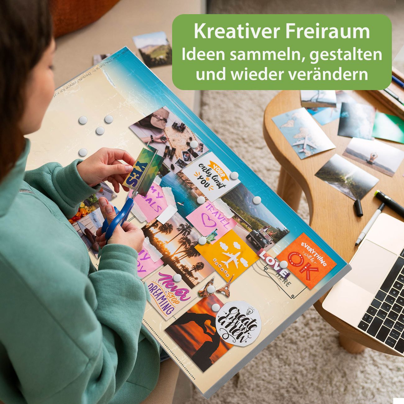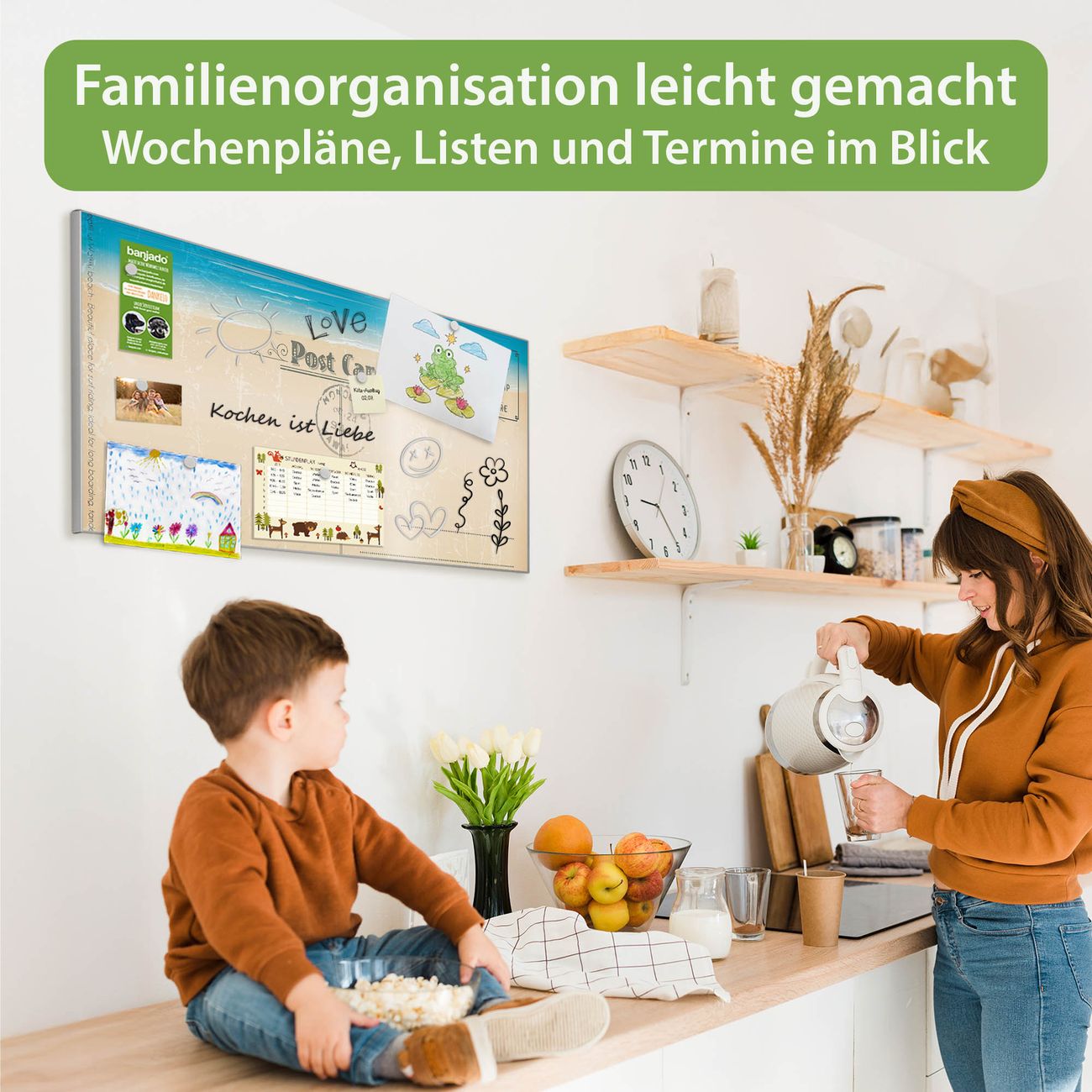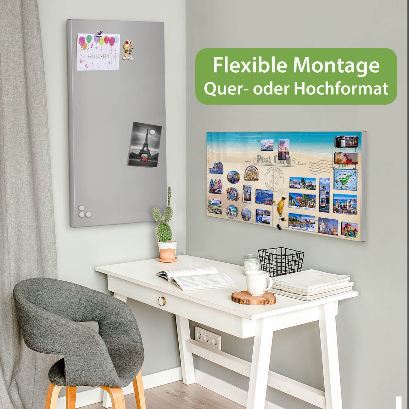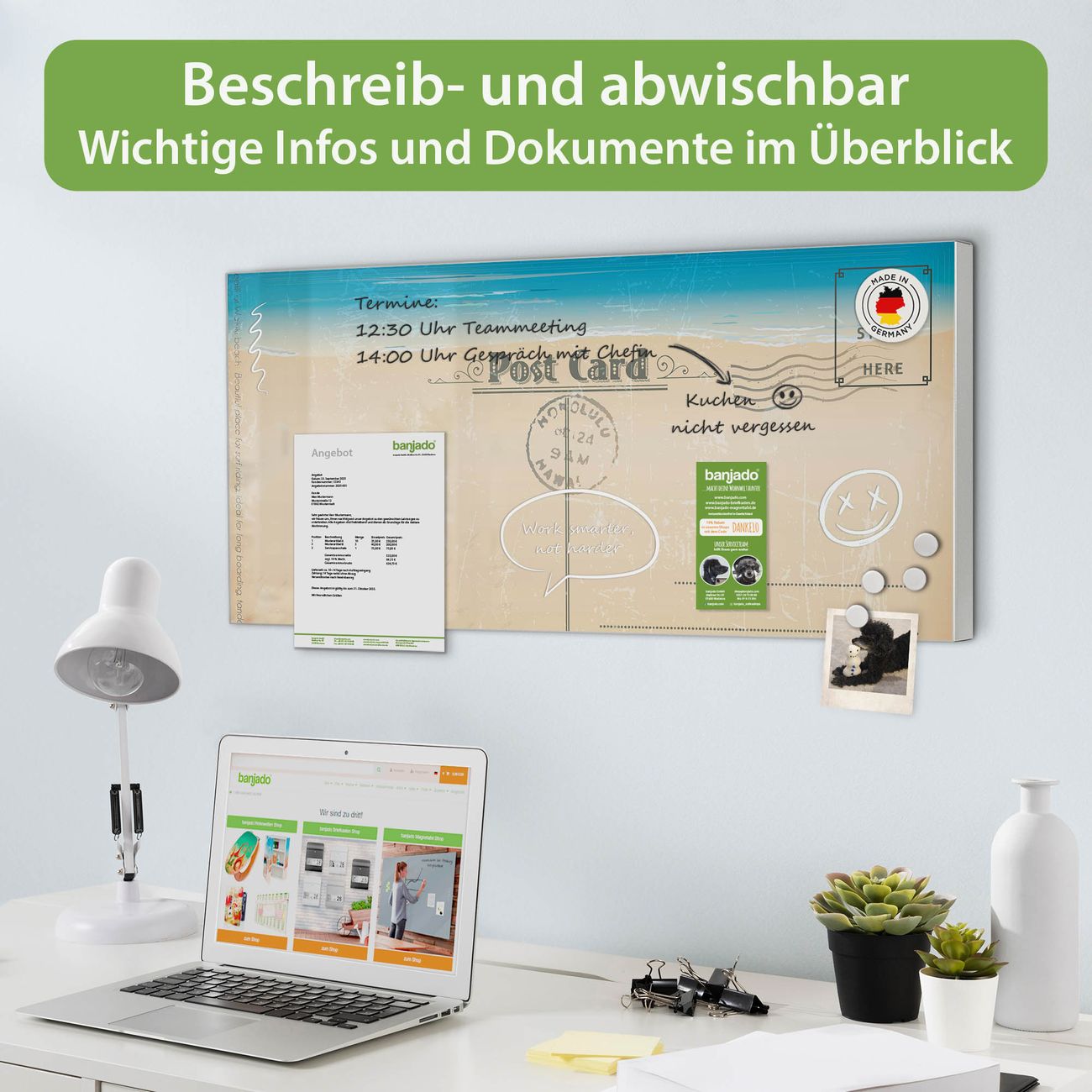 FUNKTION: Die banjado Magnettafel 78x37 cm im Design Motiv Postkarte vereint Funktionalität und modernes Wohndesign auf stilvolle Weise. Diese hochwertige Magnetwand aus Metall hilft Ihnen dabei, Notizen, Fotos, Termine, Einkaufslisten oder Rezepte übersichtlich zu organisieren. Als praktisches Memoboard sorgt sie für Struktur im Alltag und setzt gleichzeitig einen dekorativen Akzent an Ihrer Wand. DESIGN: Die Metalltafel besteht aus robustem, lackiertem Stahl und ist mit allen handelsüblichen Magneten nutzbar. Besonders praktisch ist die beschreibbare Oberfläche. Sie können die Magnettafel ganz einfach mit Kreidestiften beschriften und die Inhalte bei Bedarf mit einem feuchten Tuch wieder entfernen. So eignet sich das Memoboard ideal für Wochenpläne, Menüpläne, To Do Listen oder kreative Botschaften. DETAILS: Mit ihrem großzügigen Querformat von 78x37 cm bietet die Magnettafel ausreichend Platz für Ihre Organisation. Das Motiv Motiv Postkarte bringt eine warme, natürliche Optik in Küche, Flur, Büro oder Homeoffice und wirkt auch ohne Magnete oder Beschriftung wie ein modernes Wandbild. NUTZEN: Auf der Rückseite befinden sich vorgefertigte Löcher für eine schnelle und unkomplizierte Wandmontage. Jede banjado Magnettafel wird in Deutschland gefertigt und steht für Qualität, Langlebigkeit und liebevolle Verarbeitung. Dieses beschreibbare Memoboard ist die perfekte Kombination aus Metalltafel, Designobjekt und praktischer Magnetwand für Ihren Alltag. BANJADO: Wir sind ein kleines Team aus dem Herzen von Sachsen. Wir fertigen alle Artikel von Hand für Sie an, Sie erhalten keine preiswerte Importware. Auf Wunsch können Sie auch Ihr eigenes Foto auf die Magnettafel aufbringen, schreiben Sie uns an. Herzlichst, Ihr banjado-Team