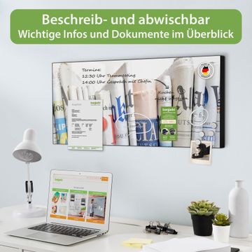 FUNKTION: Die banjado Magnettafel 78x37 cm im Design Motiv Presse vereint Funktionalität und modernes Wohndesign auf stilvolle Weise. Diese hochwertige Magnetwand aus Metall hilft Ihnen dabei, Notizen, Fotos, Termine, Einkaufslisten oder Rezepte übersichtlich zu organisieren. Als praktisches Memoboard sorgt sie für Struktur im Alltag und setzt gleichzeitig einen dekorativen Akzent an Ihrer Wand. DESIGN: Die Metalltafel besteht aus robustem, lackiertem Stahl und ist mit allen handelsüblichen Magneten nutzbar. Besonders praktisch ist die beschreibbare Oberfläche. Sie können die Magnettafel ganz einfach mit Kreidestiften beschriften und die Inhalte bei Bedarf mit einem feuchten Tuch wieder entfernen. So eignet sich das Memoboard ideal für Wochenpläne, Menüpläne, To Do Listen oder kreative Botschaften. DETAILS: Mit ihrem großzügigen Querformat von 78x37 cm bietet die Magnettafel ausreichend Platz für Ihre Organisation. Das Motiv Motiv Presse bringt eine warme, natürliche Optik in Küche, Flur, Büro oder Homeoffice und wirkt auch ohne Magnete oder Beschriftung wie ein modernes Wandbild. NUTZEN: Auf der Rückseite befinden sich vorgefertigte Löcher für eine schnelle und unkomplizierte Wandmontage. Jede banjado Magnettafel wird in Deutschland gefertigt und steht für Qualität, Langlebigkeit und liebevolle Verarbeitung. Dieses beschreibbare Memoboard ist die perfekte Kombination aus Metalltafel, Designobjekt und praktischer Magnetwand für Ihren Alltag. BANJADO: Wir sind ein kleines Team aus dem Herzen von Sachsen. Wir fertigen alle Artikel von Hand für Sie an, Sie erhalten keine preiswerte Importware. Auf Wunsch können Sie auch Ihr eigenes Foto auf die Magnettafel aufbringen, schreiben Sie uns an. Herzlichst, Ihr banjado-Team