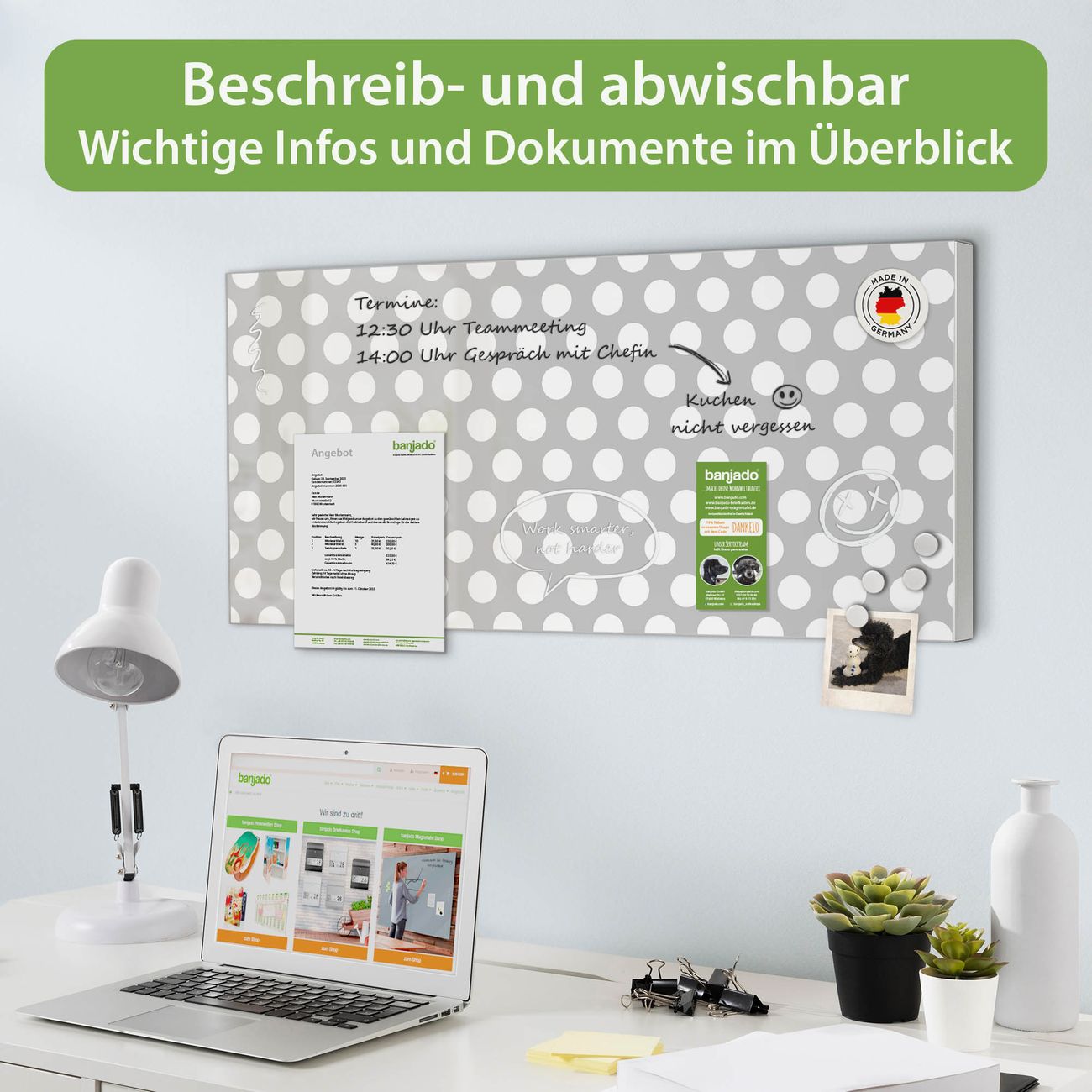FUNKTION: Die banjado Magnettafel 78x37 cm im Design Motiv Punkte Grau vereint Funktionalität und modernes Wohndesign auf stilvolle Weise. Diese hochwertige Magnetwand aus Metall hilft Ihnen dabei, Notizen, Fotos, Termine, Einkaufslisten oder Rezepte übersichtlich zu organisieren. Als praktisches Memoboard sorgt sie für Struktur im Alltag und setzt gleichzeitig einen dekorativen Akzent an Ihrer Wand. DESIGN: Die Metalltafel besteht aus robustem, lackiertem Stahl und ist mit allen handelsüblichen Magneten nutzbar. Besonders praktisch ist die beschreibbare Oberfläche. Sie können die Magnettafel ganz einfach mit Kreidestiften beschriften und die Inhalte bei Bedarf mit einem feuchten Tuch wieder entfernen. So eignet sich das Memoboard ideal für Wochenpläne, Menüpläne, To Do Listen oder kreative Botschaften. DETAILS: Mit ihrem großzügigen Querformat von 78x37 cm bietet die Magnettafel ausreichend Platz für Ihre Organisation. Das Motiv Motiv Punkte Grau bringt eine warme, natürliche Optik in Küche, Flur, Büro oder Homeoffice und wirkt auch ohne Magnete oder Beschriftung wie ein modernes Wandbild. NUTZEN: Auf der Rückseite befinden sich vorgefertigte Löcher für eine schnelle und unkomplizierte Wandmontage. Jede banjado Magnettafel wird in Deutschland gefertigt und steht für Qualität, Langlebigkeit und liebevolle Verarbeitung. Dieses beschreibbare Memoboard ist die perfekte Kombination aus Metalltafel, Designobjekt und praktischer Magnetwand für Ihren Alltag. BANJADO: Wir sind ein kleines Team aus dem Herzen von Sachsen. Wir fertigen alle Artikel von Hand für Sie an, Sie erhalten keine preiswerte Importware. Auf Wunsch können Sie auch Ihr eigenes Foto auf die Magnettafel aufbringen, schreiben Sie uns an. Herzlichst, Ihr banjado-Team