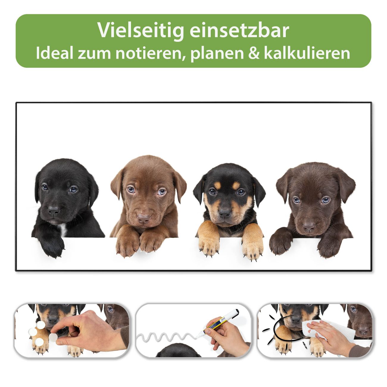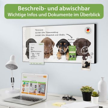 FUNKTION: Die banjado Magnettafel 78x37 cm im Design Motiv Puppies vereint Funktionalität und modernes Wohndesign auf stilvolle Weise. Diese hochwertige Magnetwand aus Metall hilft Ihnen dabei, Notizen, Fotos, Termine, Einkaufslisten oder Rezepte übersichtlich zu organisieren. Als praktisches Memoboard sorgt sie für Struktur im Alltag und setzt gleichzeitig einen dekorativen Akzent an Ihrer Wand. DESIGN: Die Metalltafel besteht aus robustem, lackiertem Stahl und ist mit allen handelsüblichen Magneten nutzbar. Besonders praktisch ist die beschreibbare Oberfläche. Sie können die Magnettafel ganz einfach mit Kreidestiften beschriften und die Inhalte bei Bedarf mit einem feuchten Tuch wieder entfernen. So eignet sich das Memoboard ideal für Wochenpläne, Menüpläne, To Do Listen oder kreative Botschaften. DETAILS: Mit ihrem großzügigen Querformat von 78x37 cm bietet die Magnettafel ausreichend Platz für Ihre Organisation. Das Motiv Motiv Puppies bringt eine warme, natürliche Optik in Küche, Flur, Büro oder Homeoffice und wirkt auch ohne Magnete oder Beschriftung wie ein modernes Wandbild. NUTZEN: Auf der Rückseite befinden sich vorgefertigte Löcher für eine schnelle und unkomplizierte Wandmontage. Jede banjado Magnettafel wird in Deutschland gefertigt und steht für Qualität, Langlebigkeit und liebevolle Verarbeitung. Dieses beschreibbare Memoboard ist die perfekte Kombination aus Metalltafel, Designobjekt und praktischer Magnetwand für Ihren Alltag. BANJADO: Wir sind ein kleines Team aus dem Herzen von Sachsen. Wir fertigen alle Artikel von Hand für Sie an, Sie erhalten keine preiswerte Importware. Auf Wunsch können Sie auch Ihr eigenes Foto auf die Magnettafel aufbringen, schreiben Sie uns an. Herzlichst, Ihr banjado-Team