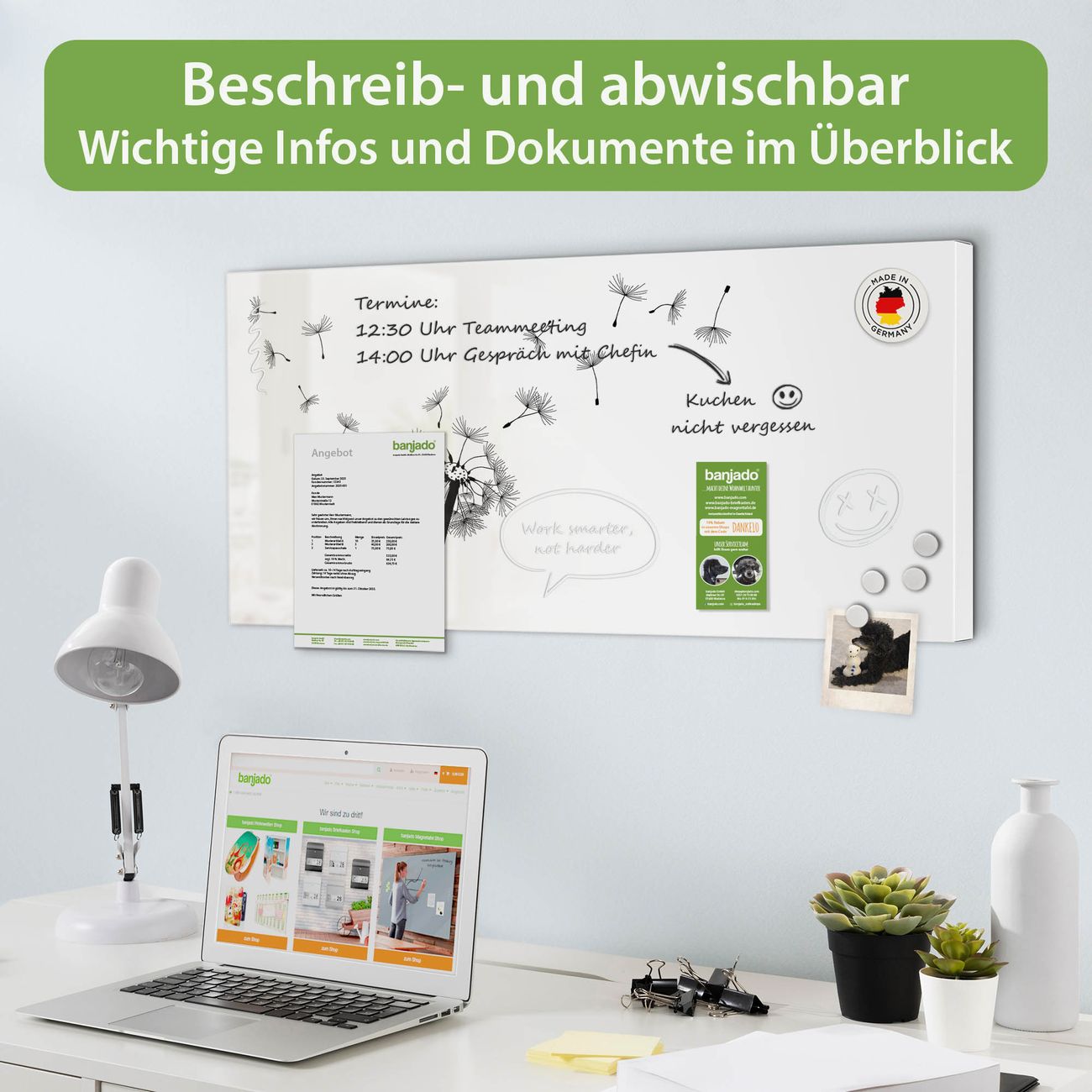 FUNKTION: Die banjado Magnettafel 78x37 cm im Design Motiv Pusteblume 2 vereint Funktionalität und modernes Wohndesign auf stilvolle Weise. Diese hochwertige Magnetwand aus Metall hilft Ihnen dabei, Notizen, Fotos, Termine, Einkaufslisten oder Rezepte übersichtlich zu organisieren. Als praktisches Memoboard sorgt sie für Struktur im Alltag und setzt gleichzeitig einen dekorativen Akzent an Ihrer Wand. DESIGN: Die Metalltafel besteht aus robustem, lackiertem Stahl und ist mit allen handelsüblichen Magneten nutzbar. Besonders praktisch ist die beschreibbare Oberfläche. Sie können die Magnettafel ganz einfach mit Kreidestiften beschriften und die Inhalte bei Bedarf mit einem feuchten Tuch wieder entfernen. So eignet sich das Memoboard ideal für Wochenpläne, Menüpläne, To Do Listen oder kreative Botschaften. DETAILS: Mit ihrem großzügigen Querformat von 78x37 cm bietet die Magnettafel ausreichend Platz für Ihre Organisation. Das Motiv Motiv Pusteblume 2 bringt eine warme, natürliche Optik in Küche, Flur, Büro oder Homeoffice und wirkt auch ohne Magnete oder Beschriftung wie ein modernes Wandbild. NUTZEN: Auf der Rückseite befinden sich vorgefertigte Löcher für eine schnelle und unkomplizierte Wandmontage. Jede banjado Magnettafel wird in Deutschland gefertigt und steht für Qualität, Langlebigkeit und liebevolle Verarbeitung. Dieses beschreibbare Memoboard ist die perfekte Kombination aus Metalltafel, Designobjekt und praktischer Magnetwand für Ihren Alltag. BANJADO: Wir sind ein kleines Team aus dem Herzen von Sachsen. Wir fertigen alle Artikel von Hand für Sie an, Sie erhalten keine preiswerte Importware. Auf Wunsch können Sie auch Ihr eigenes Foto auf die Magnettafel aufbringen, schreiben Sie uns an. Herzlichst, Ihr banjado-Team