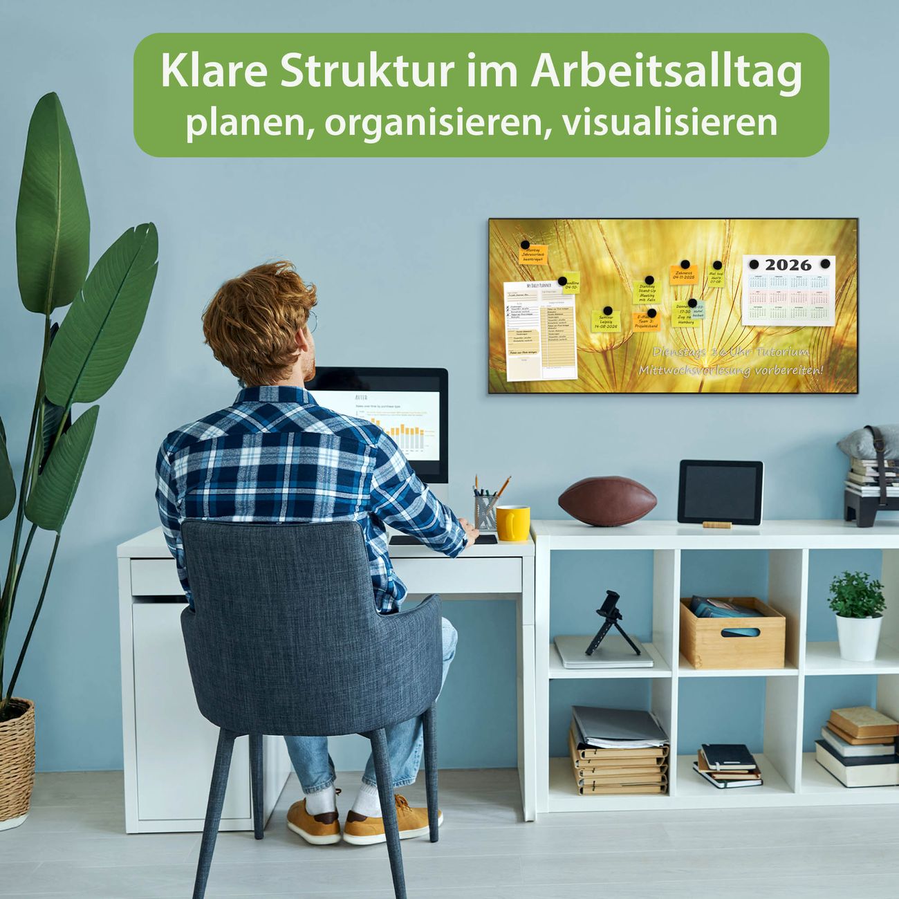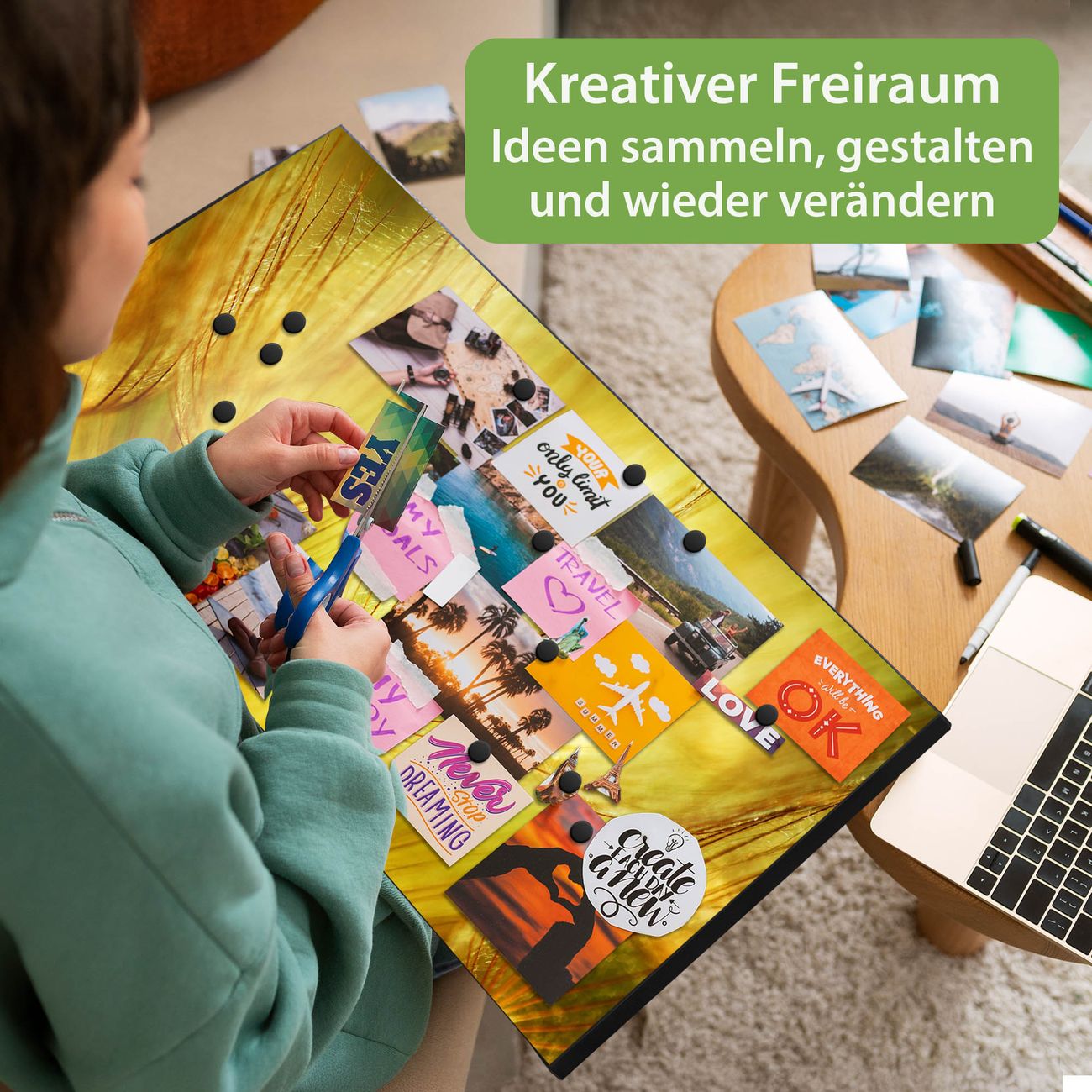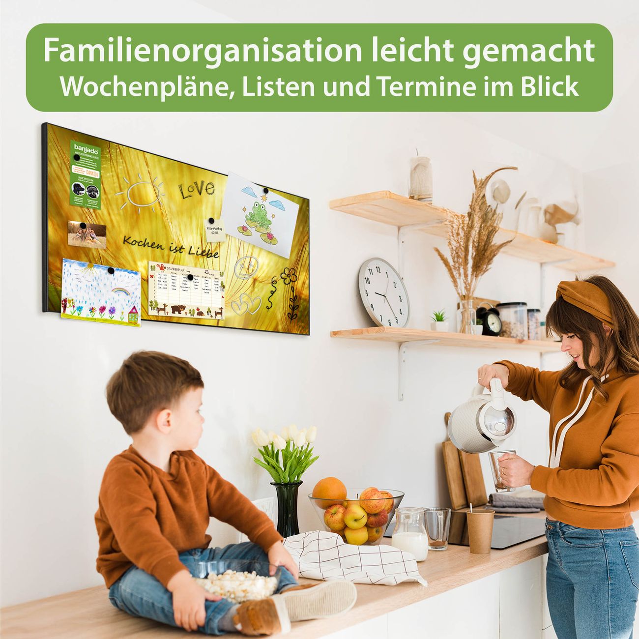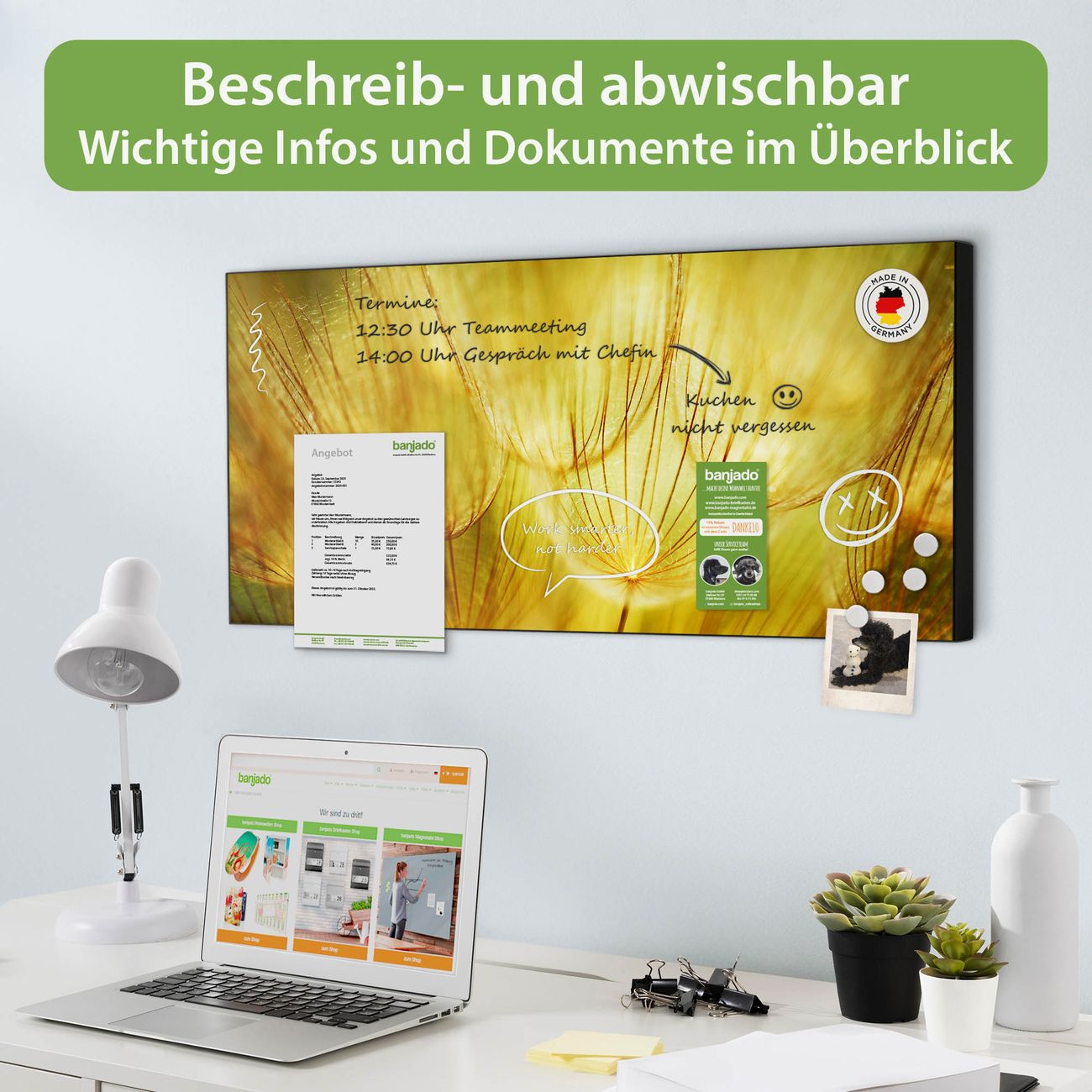 FUNKTION: Die banjado Magnettafel 78x37 cm im Design Motiv Pusteblumen Gold vereint Funktionalität und modernes Wohndesign auf stilvolle Weise. Diese hochwertige Magnetwand aus Metall hilft Ihnen dabei, Notizen, Fotos, Termine, Einkaufslisten oder Rezepte übersichtlich zu organisieren. Als praktisches Memoboard sorgt sie für Struktur im Alltag und setzt gleichzeitig einen dekorativen Akzent an Ihrer Wand. DESIGN: Die Metalltafel besteht aus robustem, lackiertem Stahl und ist mit allen handelsüblichen Magneten nutzbar. Besonders praktisch ist die beschreibbare Oberfläche. Sie können die Magnettafel ganz einfach mit Kreidestiften beschriften und die Inhalte bei Bedarf mit einem feuchten Tuch wieder entfernen. So eignet sich das Memoboard ideal für Wochenpläne, Menüpläne, To Do Listen oder kreative Botschaften. DETAILS: Mit ihrem großzügigen Querformat von 78x37 cm bietet die Magnettafel ausreichend Platz für Ihre Organisation. Das Motiv Motiv Pusteblumen Gold bringt eine warme, natürliche Optik in Küche, Flur, Büro oder Homeoffice und wirkt auch ohne Magnete oder Beschriftung wie ein modernes Wandbild. NUTZEN: Auf der Rückseite befinden sich vorgefertigte Löcher für eine schnelle und unkomplizierte Wandmontage. Jede banjado Magnettafel wird in Deutschland gefertigt und steht für Qualität, Langlebigkeit und liebevolle Verarbeitung. Dieses beschreibbare Memoboard ist die perfekte Kombination aus Metalltafel, Designobjekt und praktischer Magnetwand für Ihren Alltag. BANJADO: Wir sind ein kleines Team aus dem Herzen von Sachsen. Wir fertigen alle Artikel von Hand für Sie an, Sie erhalten keine preiswerte Importware. Auf Wunsch können Sie auch Ihr eigenes Foto auf die Magnettafel aufbringen, schreiben Sie uns an. Herzlichst, Ihr banjado-Team