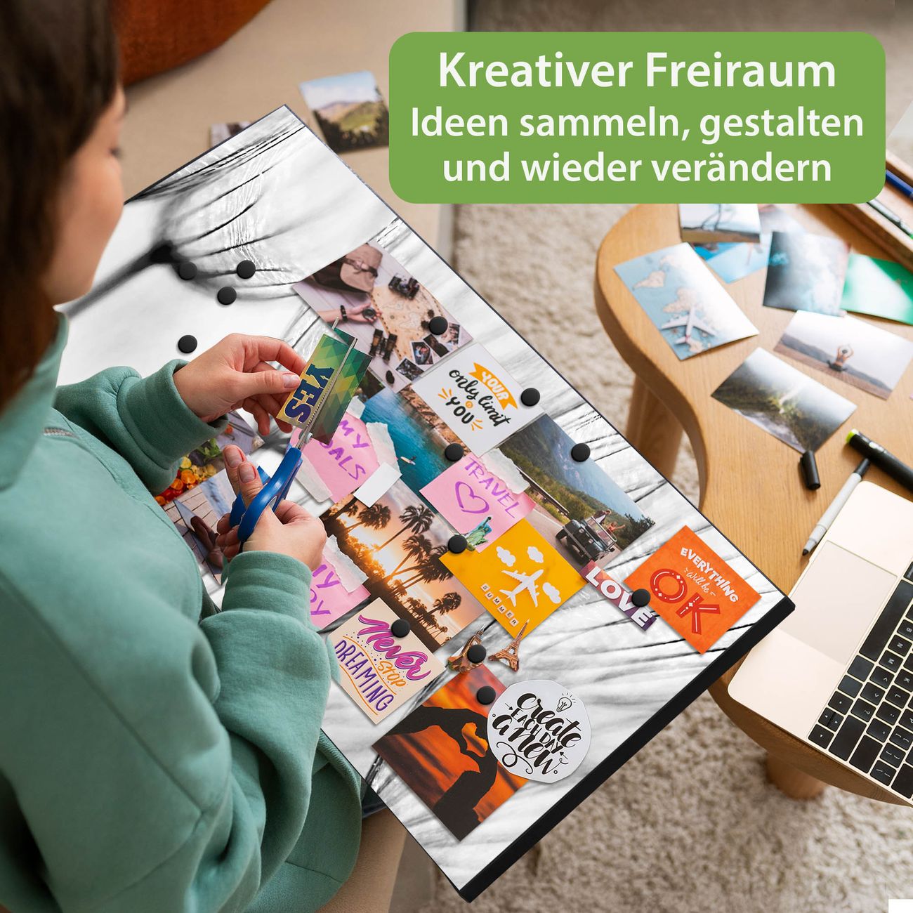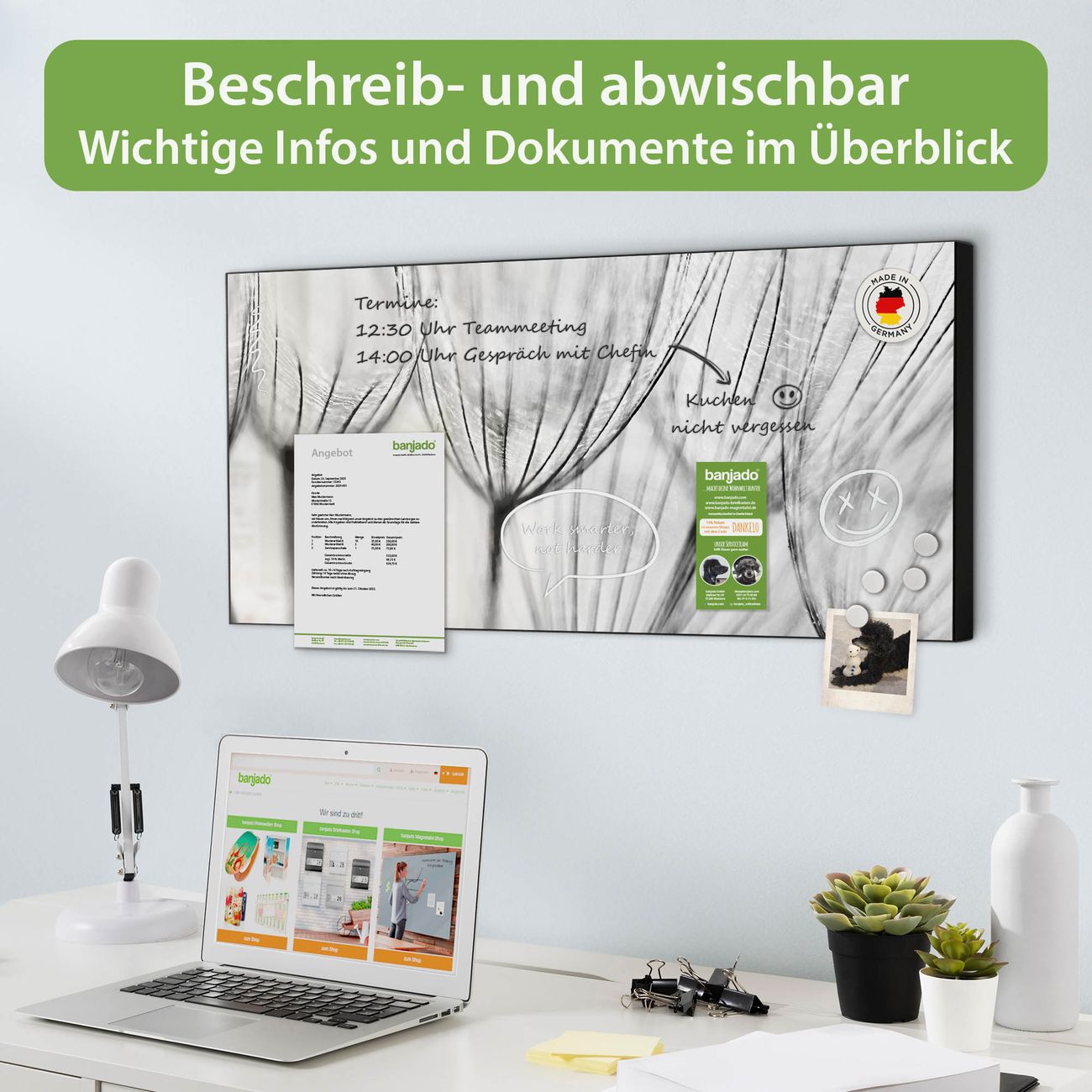 FUNKTION: Die banjado Magnettafel 78x37 cm im Design Motiv Pusteblumen SW vereint Funktionalität und modernes Wohndesign auf stilvolle Weise. Diese hochwertige Magnetwand aus Metall hilft Ihnen dabei, Notizen, Fotos, Termine, Einkaufslisten oder Rezepte übersichtlich zu organisieren. Als praktisches Memoboard sorgt sie für Struktur im Alltag und setzt gleichzeitig einen dekorativen Akzent an Ihrer Wand. DESIGN: Die Metalltafel besteht aus robustem, lackiertem Stahl und ist mit allen handelsüblichen Magneten nutzbar. Besonders praktisch ist die beschreibbare Oberfläche. Sie können die Magnettafel ganz einfach mit Kreidestiften beschriften und die Inhalte bei Bedarf mit einem feuchten Tuch wieder entfernen. So eignet sich das Memoboard ideal für Wochenpläne, Menüpläne, To Do Listen oder kreative Botschaften. DETAILS: Mit ihrem großzügigen Querformat von 78x37 cm bietet die Magnettafel ausreichend Platz für Ihre Organisation. Das Motiv Motiv Pusteblumen SW bringt eine warme, natürliche Optik in Küche, Flur, Büro oder Homeoffice und wirkt auch ohne Magnete oder Beschriftung wie ein modernes Wandbild. NUTZEN: Auf der Rückseite befinden sich vorgefertigte Löcher für eine schnelle und unkomplizierte Wandmontage. Jede banjado Magnettafel wird in Deutschland gefertigt und steht für Qualität, Langlebigkeit und liebevolle Verarbeitung. Dieses beschreibbare Memoboard ist die perfekte Kombination aus Metalltafel, Designobjekt und praktischer Magnetwand für Ihren Alltag. BANJADO: Wir sind ein kleines Team aus dem Herzen von Sachsen. Wir fertigen alle Artikel von Hand für Sie an, Sie erhalten keine preiswerte Importware. Auf Wunsch können Sie auch Ihr eigenes Foto auf die Magnettafel aufbringen, schreiben Sie uns an. Herzlichst, Ihr banjado-Team