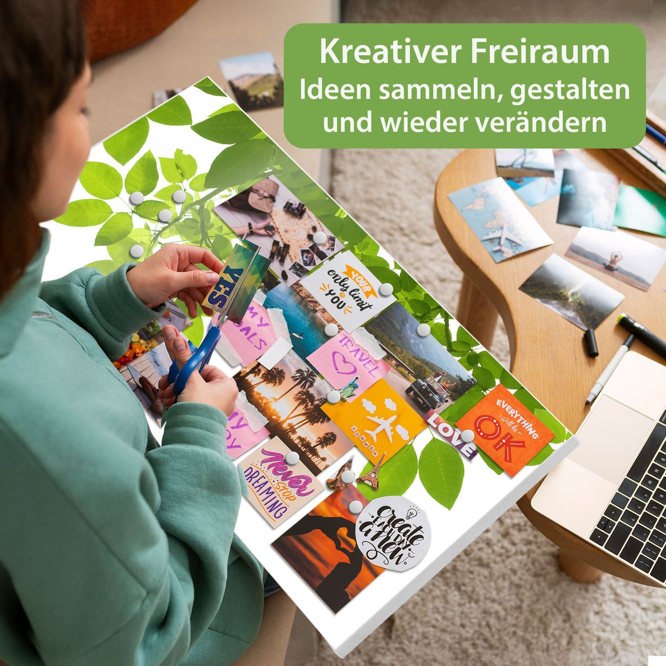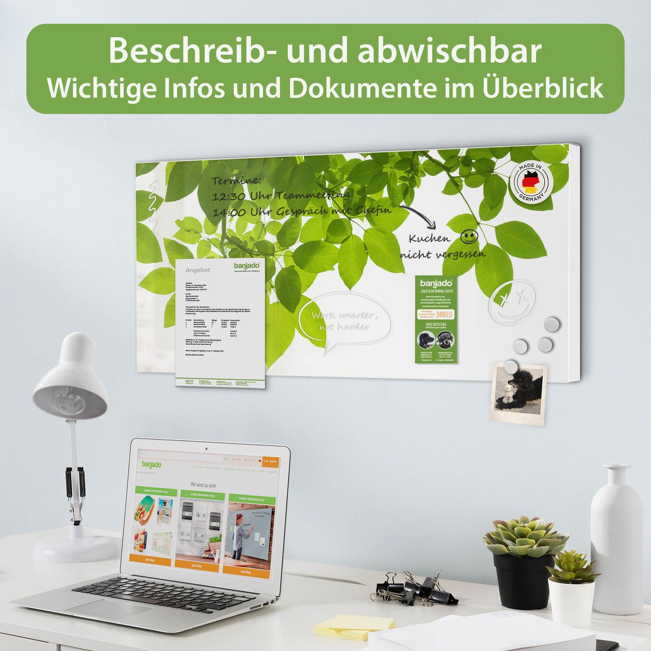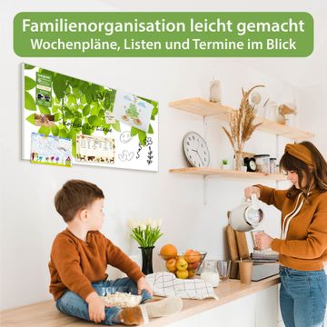 FUNKTION: Die banjado Magnettafel 78x37 cm im Design Motiv Rahmen Blätter vereint Funktionalität und modernes Wohndesign auf stilvolle Weise. Diese hochwertige Magnetwand aus Metall hilft Ihnen dabei, Notizen, Fotos, Termine, Einkaufslisten oder Rezepte übersichtlich zu organisieren. Als praktisches Memoboard sorgt sie für Struktur im Alltag und setzt gleichzeitig einen dekorativen Akzent an Ihrer Wand. DESIGN: Die Metalltafel besteht aus robustem, lackiertem Stahl und ist mit allen handelsüblichen Magneten nutzbar. Besonders praktisch ist die beschreibbare Oberfläche. Sie können die Magnettafel ganz einfach mit Kreidestiften beschriften und die Inhalte bei Bedarf mit einem feuchten Tuch wieder entfernen. So eignet sich das Memoboard ideal für Wochenpläne, Menüpläne, To Do Listen oder kreative Botschaften. DETAILS: Mit ihrem großzügigen Querformat von 78x37 cm bietet die Magnettafel ausreichend Platz für Ihre Organisation. Das Motiv Motiv Rahmen Blätter bringt eine warme, natürliche Optik in Küche, Flur, Büro oder Homeoffice und wirkt auch ohne Magnete oder Beschriftung wie ein modernes Wandbild. NUTZEN: Auf der Rückseite befinden sich vorgefertigte Löcher für eine schnelle und unkomplizierte Wandmontage. Jede banjado Magnettafel wird in Deutschland gefertigt und steht für Qualität, Langlebigkeit und liebevolle Verarbeitung. Dieses beschreibbare Memoboard ist die perfekte Kombination aus Metalltafel, Designobjekt und praktischer Magnetwand für Ihren Alltag. BANJADO: Wir sind ein kleines Team aus dem Herzen von Sachsen. Wir fertigen alle Artikel von Hand für Sie an, Sie erhalten keine preiswerte Importware. Auf Wunsch können Sie auch Ihr eigenes Foto auf die Magnettafel aufbringen, schreiben Sie uns an. Herzlichst, Ihr banjado-Team