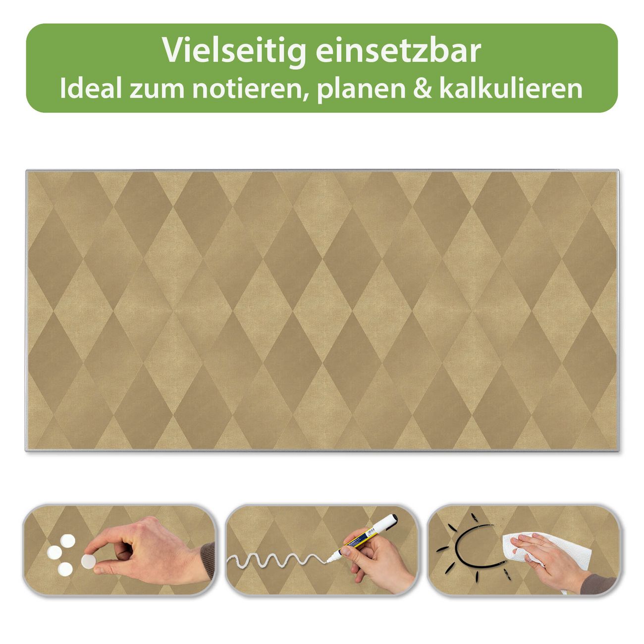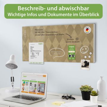 FUNKTION: Die banjado Magnettafel 78x37 cm im Design Motiv Rauten Metall vereint Funktionalität und modernes Wohndesign auf stilvolle Weise. Diese hochwertige Magnetwand aus Metall hilft Ihnen dabei, Notizen, Fotos, Termine, Einkaufslisten oder Rezepte übersichtlich zu organisieren. Als praktisches Memoboard sorgt sie für Struktur im Alltag und setzt gleichzeitig einen dekorativen Akzent an Ihrer Wand. DESIGN: Die Metalltafel besteht aus robustem, lackiertem Stahl und ist mit allen handelsüblichen Magneten nutzbar. Besonders praktisch ist die beschreibbare Oberfläche. Sie können die Magnettafel ganz einfach mit Kreidestiften beschriften und die Inhalte bei Bedarf mit einem feuchten Tuch wieder entfernen. So eignet sich das Memoboard ideal für Wochenpläne, Menüpläne, To Do Listen oder kreative Botschaften. DETAILS: Mit ihrem großzügigen Querformat von 78x37 cm bietet die Magnettafel ausreichend Platz für Ihre Organisation. Das Motiv Motiv Rauten Metall bringt eine warme, natürliche Optik in Küche, Flur, Büro oder Homeoffice und wirkt auch ohne Magnete oder Beschriftung wie ein modernes Wandbild. NUTZEN: Auf der Rückseite befinden sich vorgefertigte Löcher für eine schnelle und unkomplizierte Wandmontage. Jede banjado Magnettafel wird in Deutschland gefertigt und steht für Qualität, Langlebigkeit und liebevolle Verarbeitung. Dieses beschreibbare Memoboard ist die perfekte Kombination aus Metalltafel, Designobjekt und praktischer Magnetwand für Ihren Alltag. BANJADO: Wir sind ein kleines Team aus dem Herzen von Sachsen. Wir fertigen alle Artikel von Hand für Sie an, Sie erhalten keine preiswerte Importware. Auf Wunsch können Sie auch Ihr eigenes Foto auf die Magnettafel aufbringen, schreiben Sie uns an. Herzlichst, Ihr banjado-Team