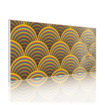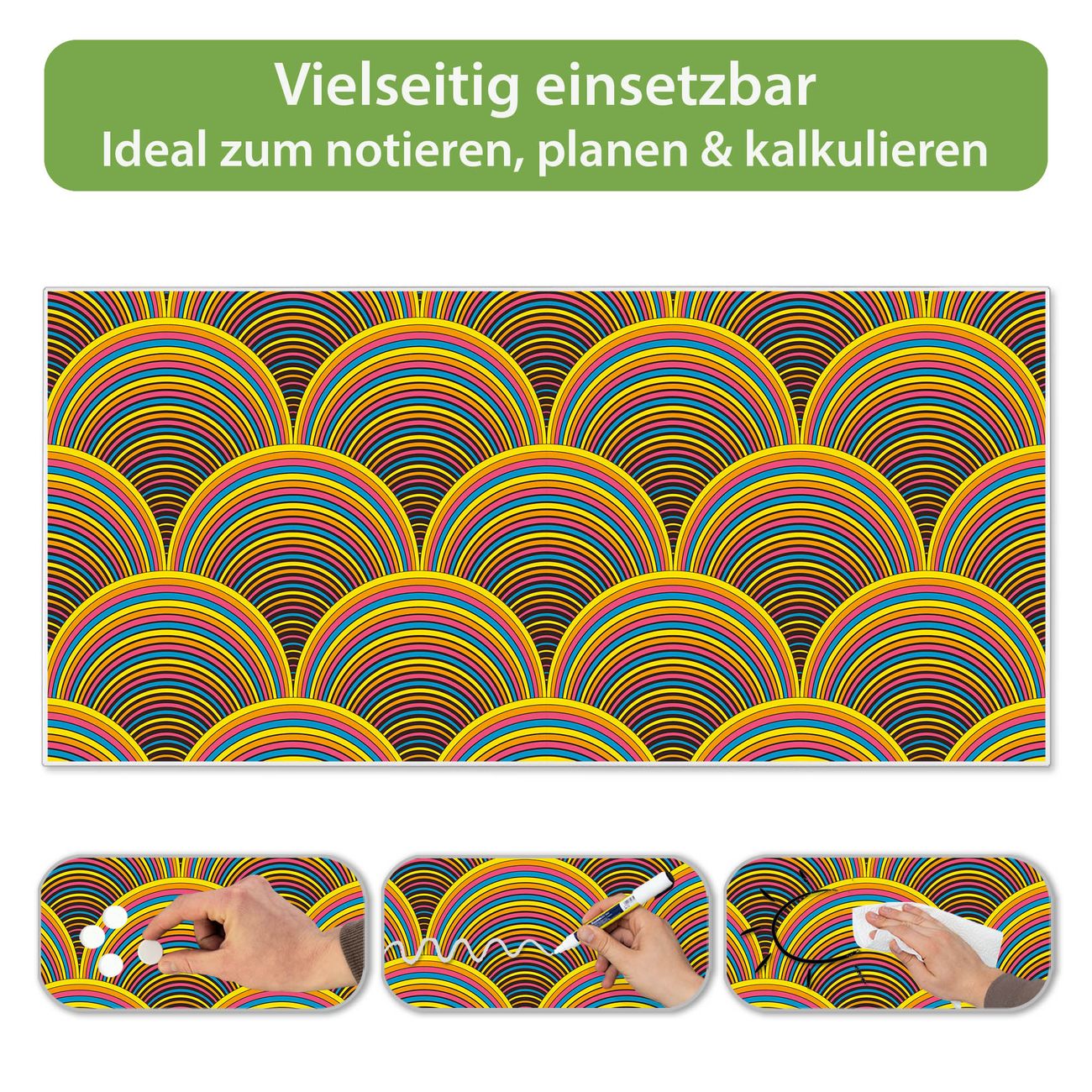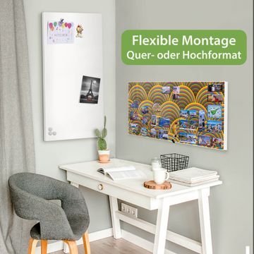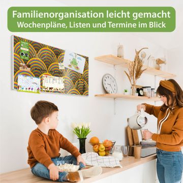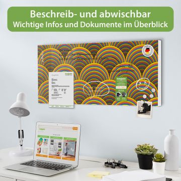 FUNKTION: Die banjado Magnettafel 78x37 cm im Design Motiv Regenbögen vereint Funktionalität und modernes Wohndesign auf stilvolle Weise. Diese hochwertige Magnetwand aus Metall hilft Ihnen dabei, Notizen, Fotos, Termine, Einkaufslisten oder Rezepte übersichtlich zu organisieren. Als praktisches Memoboard sorgt sie für Struktur im Alltag und setzt gleichzeitig einen dekorativen Akzent an Ihrer Wand. DESIGN: Die Metalltafel besteht aus robustem, lackiertem Stahl und ist mit allen handelsüblichen Magneten nutzbar. Besonders praktisch ist die beschreibbare Oberfläche. Sie können die Magnettafel ganz einfach mit Kreidestiften beschriften und die Inhalte bei Bedarf mit einem feuchten Tuch wieder entfernen. So eignet sich das Memoboard ideal für Wochenpläne, Menüpläne, To Do Listen oder kreative Botschaften. DETAILS: Mit ihrem großzügigen Querformat von 78x37 cm bietet die Magnettafel ausreichend Platz für Ihre Organisation. Das Motiv Motiv Regenbögen bringt eine warme, natürliche Optik in Küche, Flur, Büro oder Homeoffice und wirkt auch ohne Magnete oder Beschriftung wie ein modernes Wandbild. NUTZEN: Auf der Rückseite befinden sich vorgefertigte Löcher für eine schnelle und unkomplizierte Wandmontage. Jede banjado Magnettafel wird in Deutschland gefertigt und steht für Qualität, Langlebigkeit und liebevolle Verarbeitung. Dieses beschreibbare Memoboard ist die perfekte Kombination aus Metalltafel, Designobjekt und praktischer Magnetwand für Ihren Alltag. BANJADO: Wir sind ein kleines Team aus dem Herzen von Sachsen. Wir fertigen alle Artikel von Hand für Sie an, Sie erhalten keine preiswerte Importware. Auf Wunsch können Sie auch Ihr eigenes Foto auf die Magnettafel aufbringen, schreiben Sie uns an. Herzlichst, Ihr banjado-Team