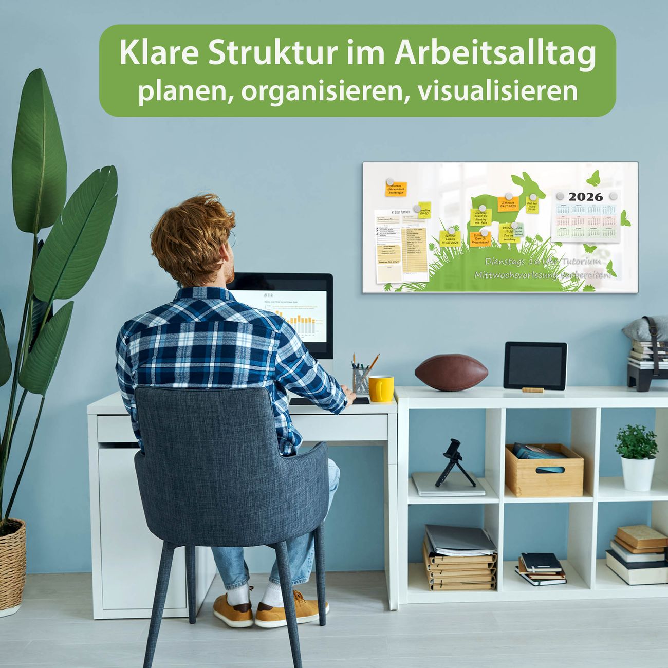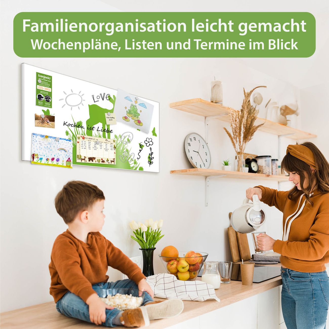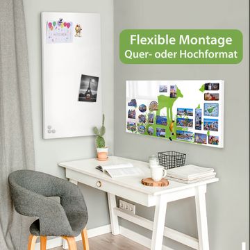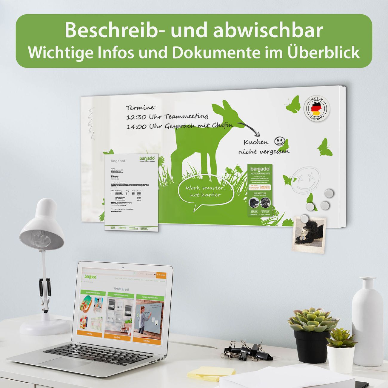 FUNKTION: Die banjado Magnettafel 78x37 cm im Design Motiv Rehkitz vereint Funktionalität und modernes Wohndesign auf stilvolle Weise. Diese hochwertige Magnetwand aus Metall hilft Ihnen dabei, Notizen, Fotos, Termine, Einkaufslisten oder Rezepte übersichtlich zu organisieren. Als praktisches Memoboard sorgt sie für Struktur im Alltag und setzt gleichzeitig einen dekorativen Akzent an Ihrer Wand. DESIGN: Die Metalltafel besteht aus robustem, lackiertem Stahl und ist mit allen handelsüblichen Magneten nutzbar. Besonders praktisch ist die beschreibbare Oberfläche. Sie können die Magnettafel ganz einfach mit Kreidestiften beschriften und die Inhalte bei Bedarf mit einem feuchten Tuch wieder entfernen. So eignet sich das Memoboard ideal für Wochenpläne, Menüpläne, To Do Listen oder kreative Botschaften. DETAILS: Mit ihrem großzügigen Querformat von 78x37 cm bietet die Magnettafel ausreichend Platz für Ihre Organisation. Das Motiv Motiv Rehkitz bringt eine warme, natürliche Optik in Küche, Flur, Büro oder Homeoffice und wirkt auch ohne Magnete oder Beschriftung wie ein modernes Wandbild. NUTZEN: Auf der Rückseite befinden sich vorgefertigte Löcher für eine schnelle und unkomplizierte Wandmontage. Jede banjado Magnettafel wird in Deutschland gefertigt und steht für Qualität, Langlebigkeit und liebevolle Verarbeitung. Dieses beschreibbare Memoboard ist die perfekte Kombination aus Metalltafel, Designobjekt und praktischer Magnetwand für Ihren Alltag. BANJADO: Wir sind ein kleines Team aus dem Herzen von Sachsen. Wir fertigen alle Artikel von Hand für Sie an, Sie erhalten keine preiswerte Importware. Auf Wunsch können Sie auch Ihr eigenes Foto auf die Magnettafel aufbringen, schreiben Sie uns an. Herzlichst, Ihr banjado-Team