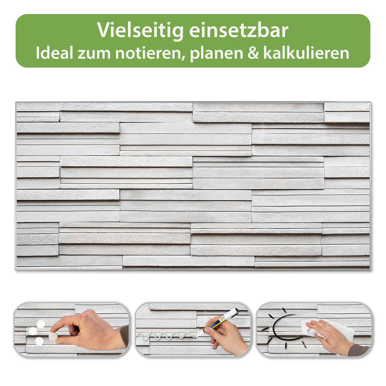 FUNKTION: Die banjado Magnettafel 78x37 cm im Design Motiv Relief vereint Funktionalität und modernes Wohndesign auf stilvolle Weise. Diese hochwertige Magnetwand aus Metall hilft Ihnen dabei, Notizen, Fotos, Termine, Einkaufslisten oder Rezepte übersichtlich zu organisieren. Als praktisches Memoboard sorgt sie für Struktur im Alltag und setzt gleichzeitig einen dekorativen Akzent an Ihrer Wand. DESIGN: Die Metalltafel besteht aus robustem, lackiertem Stahl und ist mit allen handelsüblichen Magneten nutzbar. Besonders praktisch ist die beschreibbare Oberfläche. Sie können die Magnettafel ganz einfach mit Kreidestiften beschriften und die Inhalte bei Bedarf mit einem feuchten Tuch wieder entfernen. So eignet sich das Memoboard ideal für Wochenpläne, Menüpläne, To Do Listen oder kreative Botschaften. DETAILS: Mit ihrem großzügigen Querformat von 78x37 cm bietet die Magnettafel ausreichend Platz für Ihre Organisation. Das Motiv Motiv Relief bringt eine warme, natürliche Optik in Küche, Flur, Büro oder Homeoffice und wirkt auch ohne Magnete oder Beschriftung wie ein modernes Wandbild. NUTZEN: Auf der Rückseite befinden sich vorgefertigte Löcher für eine schnelle und unkomplizierte Wandmontage. Jede banjado Magnettafel wird in Deutschland gefertigt und steht für Qualität, Langlebigkeit und liebevolle Verarbeitung. Dieses beschreibbare Memoboard ist die perfekte Kombination aus Metalltafel, Designobjekt und praktischer Magnetwand für Ihren Alltag. BANJADO: Wir sind ein kleines Team aus dem Herzen von Sachsen. Wir fertigen alle Artikel von Hand für Sie an, Sie erhalten keine preiswerte Importware. Auf Wunsch können Sie auch Ihr eigenes Foto auf die Magnettafel aufbringen, schreiben Sie uns an. Herzlichst, Ihr banjado-Team